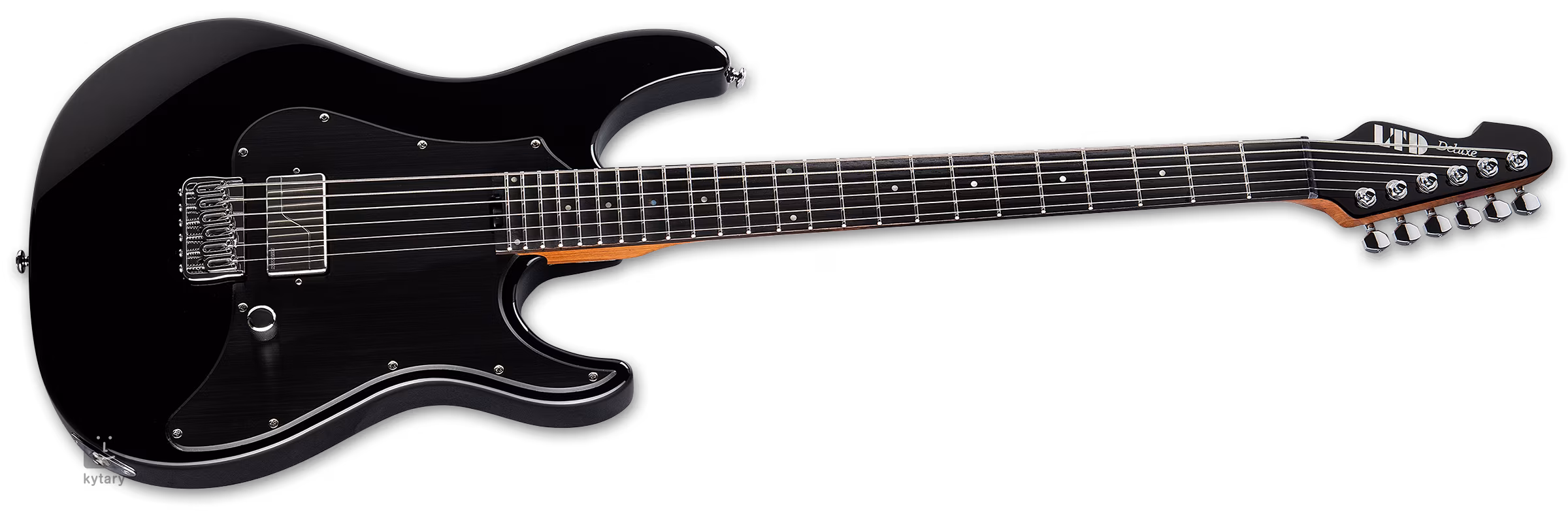 Eine stabile Stimmung wird durch die Saitenbefestigung in den LTD Locking Mechanismen und durch die Hipshot Solidbody Bridge gewährleistet. Der stilvolle Look des Instruments wird durch das schwarze Knochengriffbrett, das gebürstete schwarze Schlagbrett und die verchromte Hardware unterstrichen.