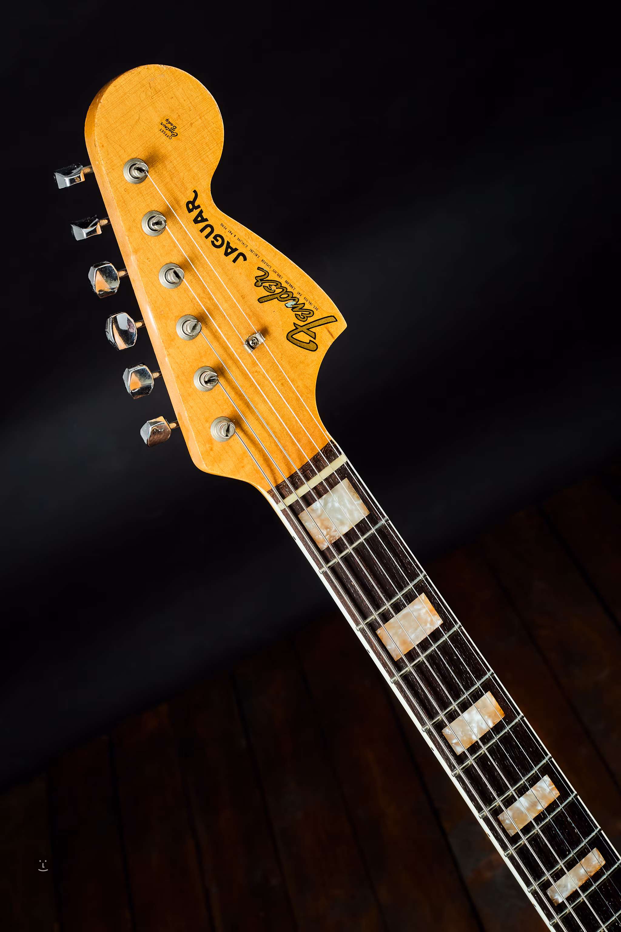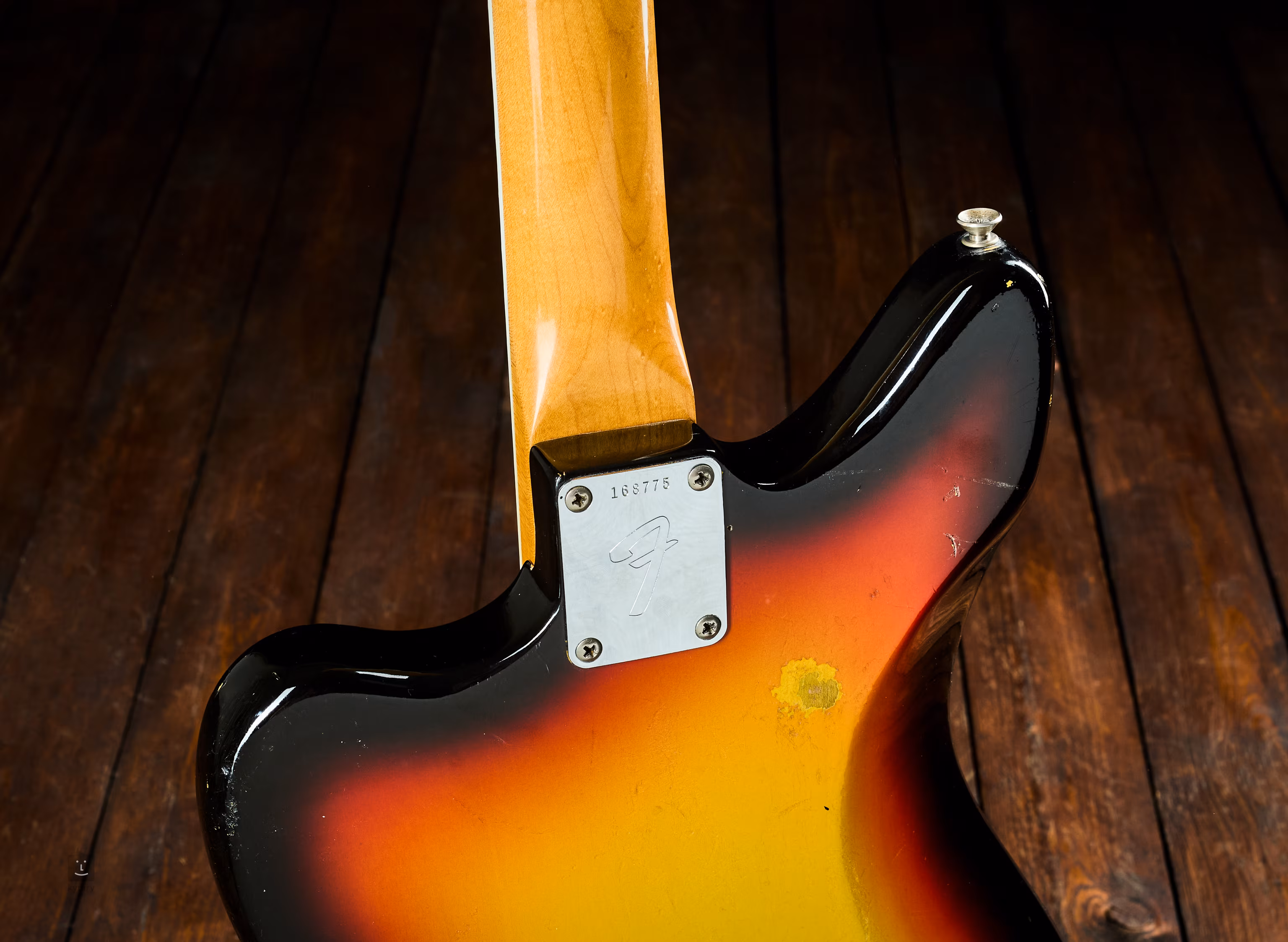 Der Hals ist auf September 1966 datiert, die Potentiometer auf August 1966. Auf dem Korpus befindet sich ein EC-Stempel, der anzeigt, dass das Instrument auf Bestellung gefertigt wurde. Korpus Erle, Hals Ahorn, Griffbrett Furnierbrett Palisander. Original-Lackierung.