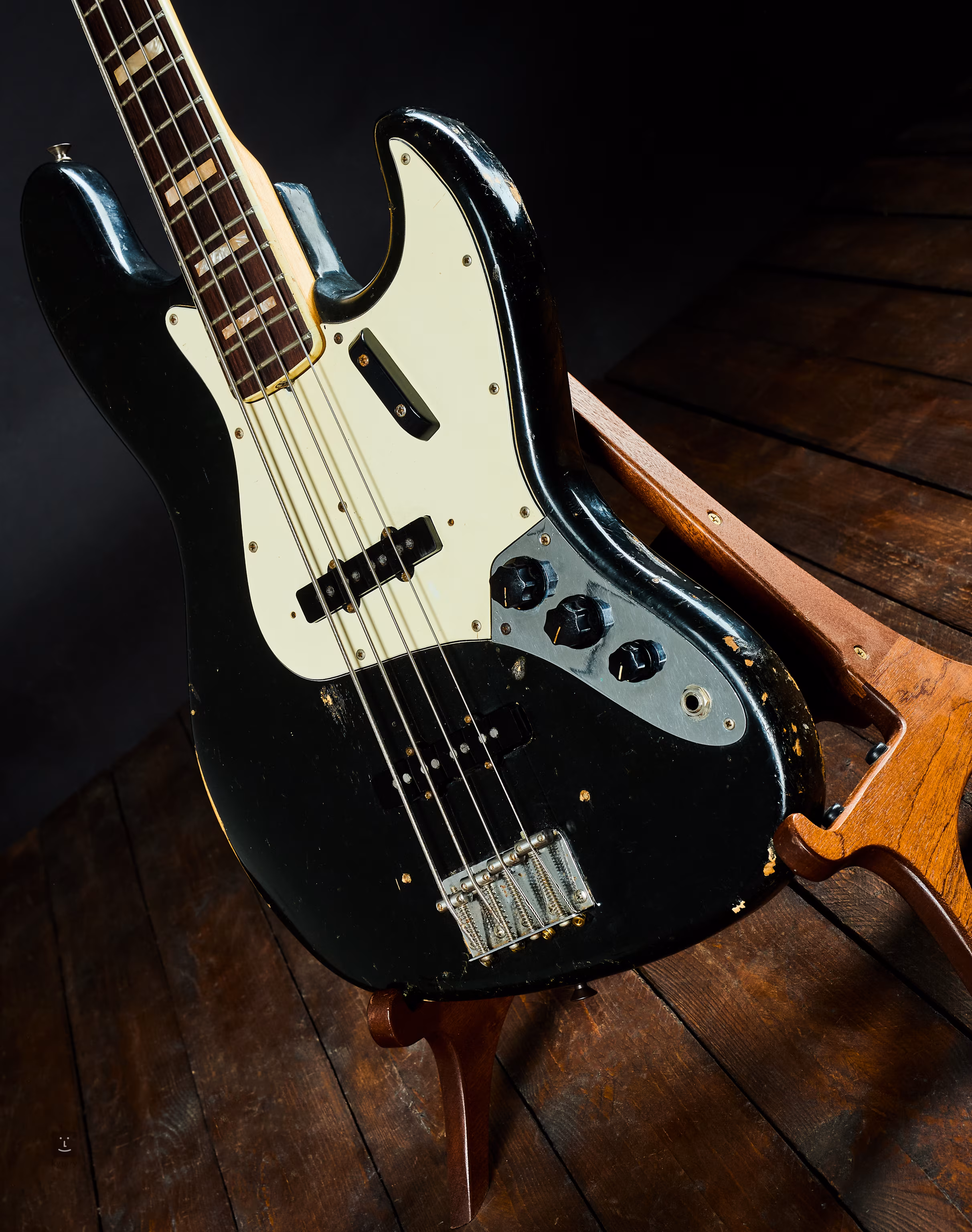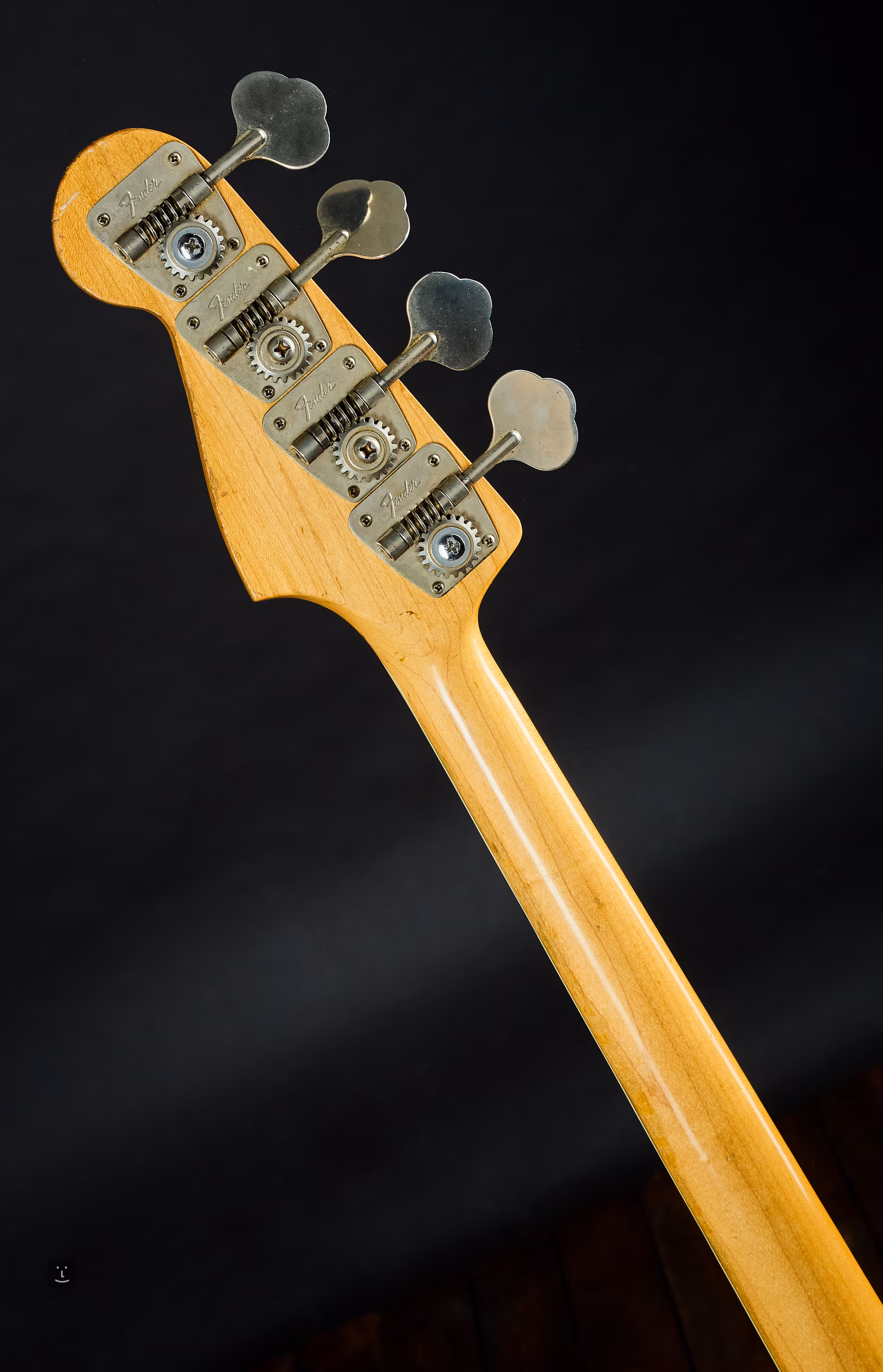 Die Potentiometer stammen aus dem Jahr 1971, das Schlagbrett ist ebenfalls aus dieser Zeit, das Datum auf dem Halspickup ist unleserlich, sieht aber identisch aus, ebenfalls original. Der Lack auf dem Korpus ist schwarz, mit einer zeitgemäßen Zusammensetzung - untere Schicht aus klarem Poly und obere Schicht aus schwarzem Nitro.