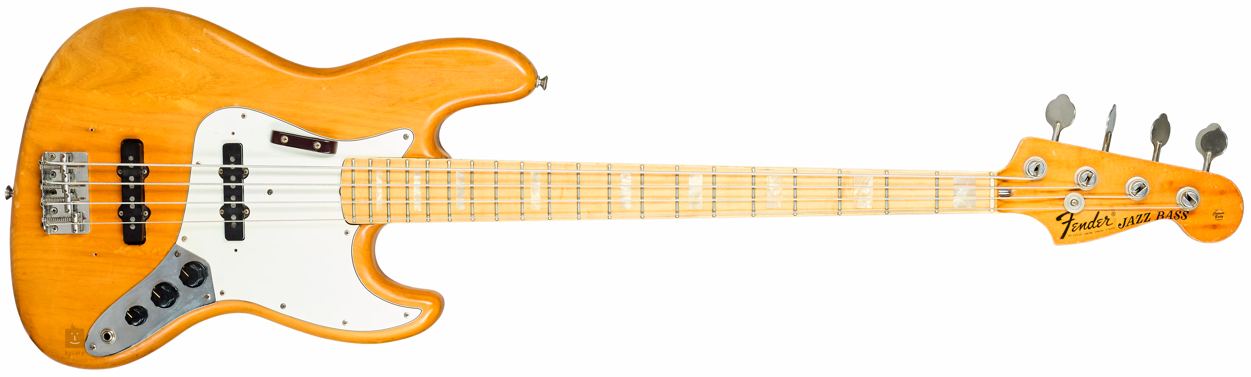 Ein authentischer Jazz Bass aus dem Jahr 1975 mit einem Korpus aus Esche und einem Griffbrett aus Ahorn, verziert mit Perlmutt-Blockmarkierungen. Ein absoluter Klassiker unter den Bassgitarren.