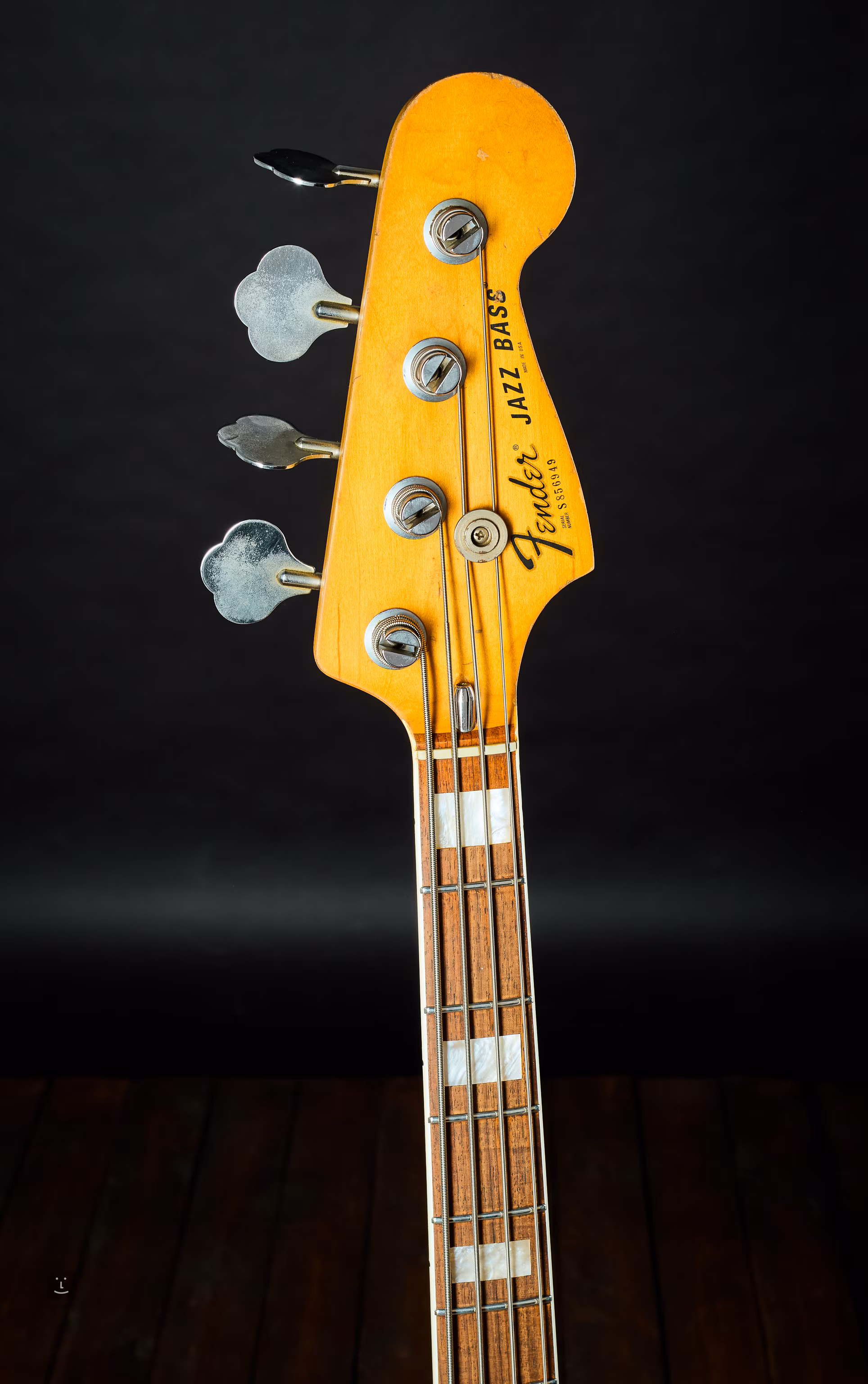 Dies ist ein absolut typischer Jazz Bass aus den späten 70er Jahren. Der Korpus aus Esche ist schwarz lackiert, der Hals ist aus Ahorn mit einem Palisandergriffbrett, das mit Orientierungsrechtern eingefasst und besetzt ist. Die Bedienelemente sind mit „Strat“-Knöpfen ausgestattet.