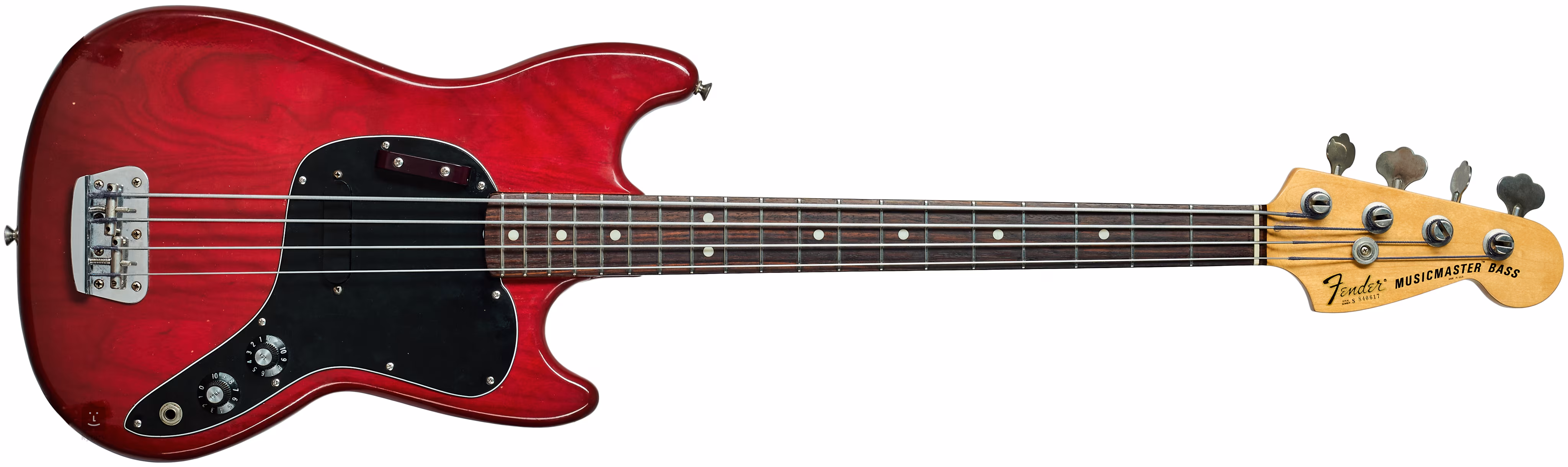Für die Herstellung des Musicmaster wurde überwiegend Pappelholz verwendet, seltener Esche oder Erle. Dieser Bass mit einer kurzen 30"-Mensur hat einen Korpus aus Esche mit originalem transparentem Lack in der Farbe Wine Red.