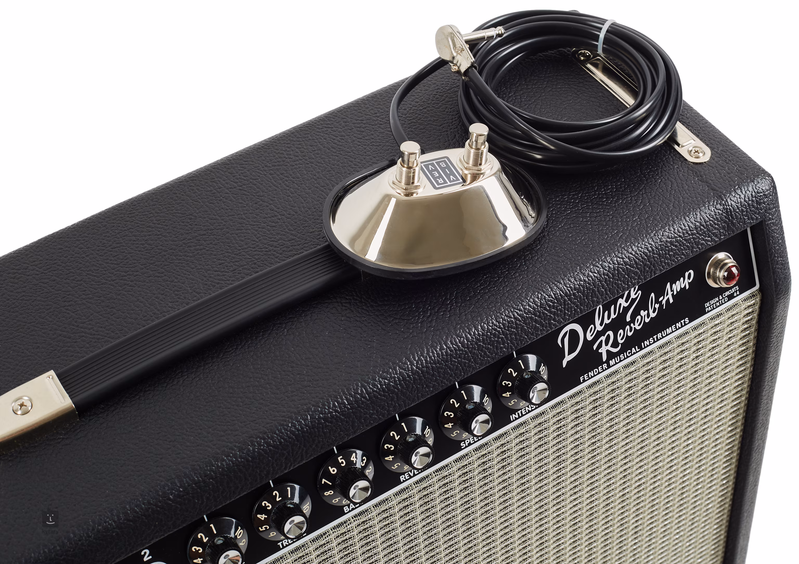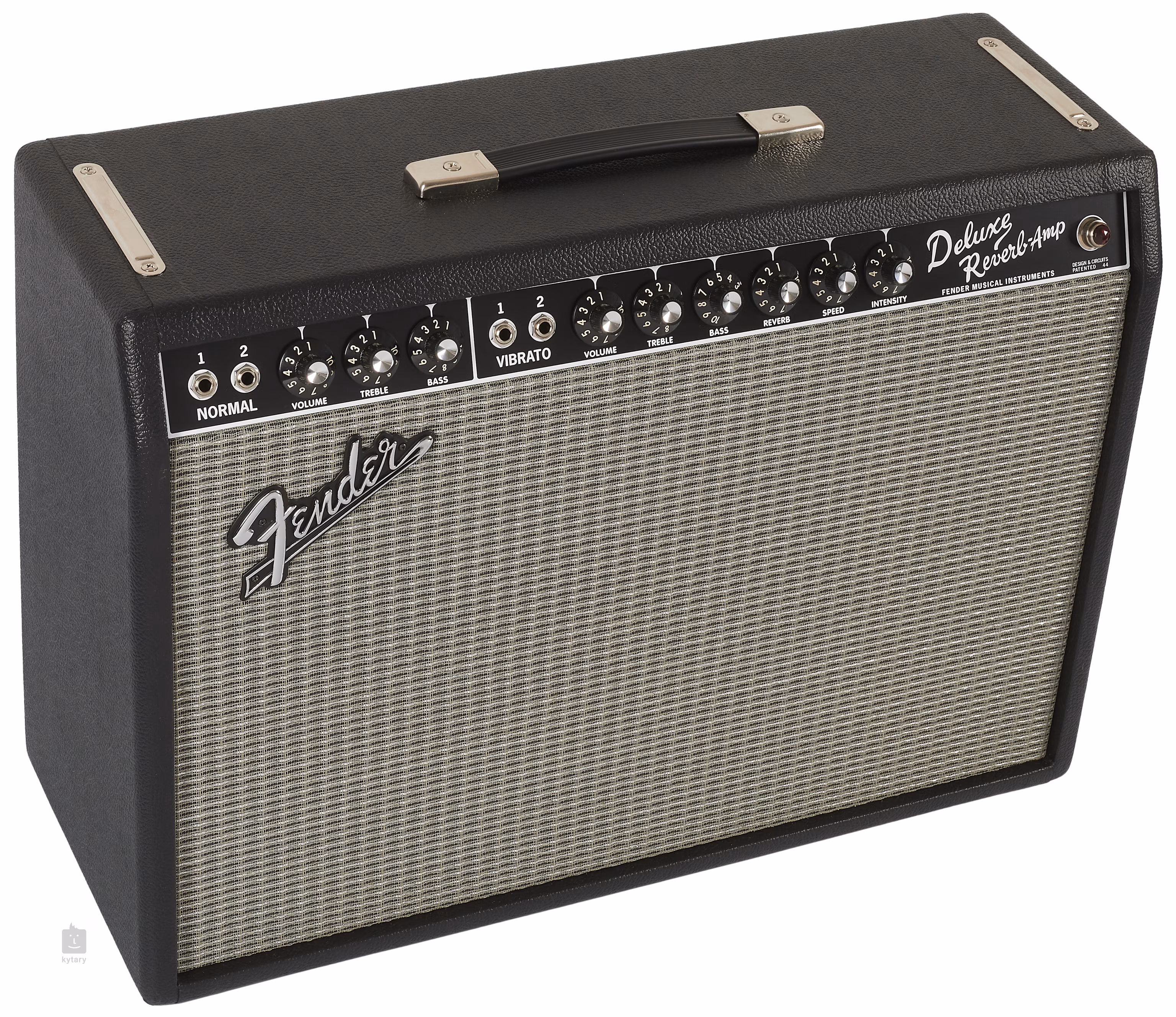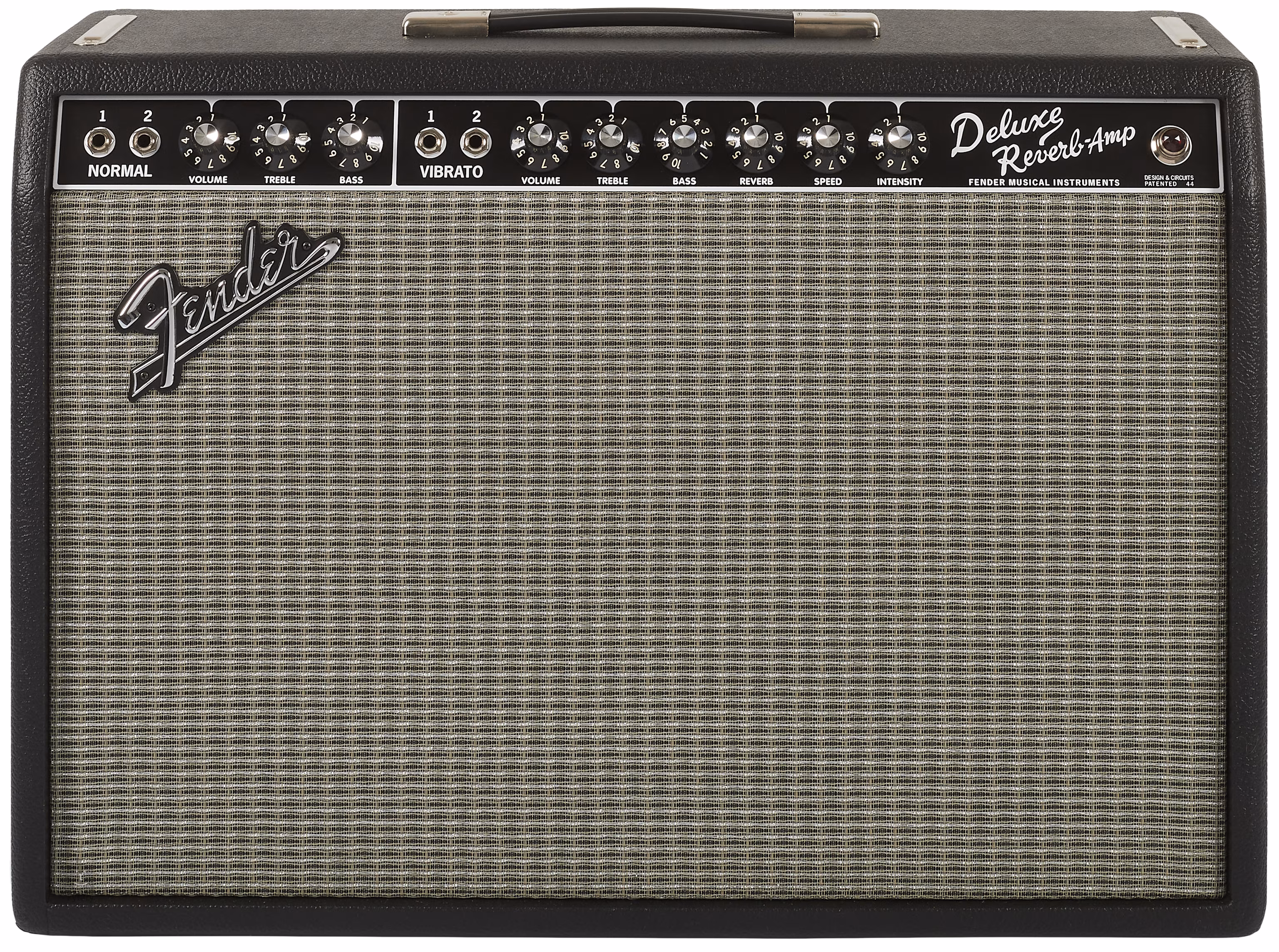 Das Bedienfeld befindet sich auf der Vorderseite. Zunächst gibt es die Regelsektion für den normalen Kanal, in der sich neben den beiden Eingängen auch die Potentiometer für Lautstärke, Höhen und Bass sowie der Bright-Schalter befinden. Als Nächstes folgt die Steuerung des Vibrato-Kanals. Auch hier gibt es zwei Eingänge, und zusätzlich zu den Reglern für Lautstärke, Höhen, Mitten und Bässe sowie dem Bright-Schalter gibt es auch die Potentiometer Reverb, Speed und Intensity, mit denen der eingebaute Federhall und das Vibrato gesteuert werden.