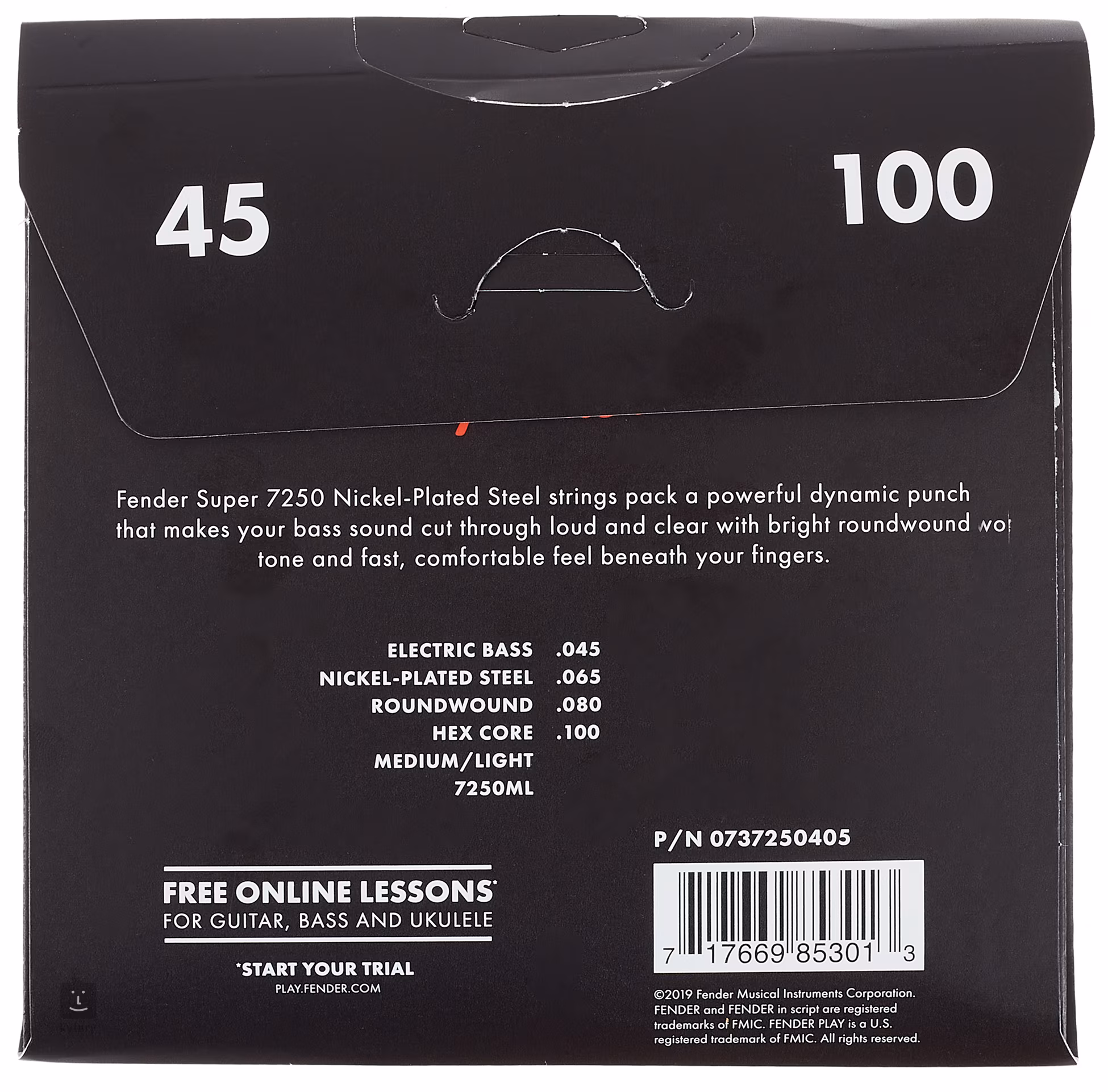 Die FenderSuper 7250 E-Bass-Saiten sind ideal für Spieler, die einen vielseitigen Sound suchen, der für die meisten Genres und Spielweisen geeignet ist. Mit einer Kombination aus Stahlkern und vernickelten Stahlwicklungen bieten sie einen frequenzausgewogenen Sound, der in Rock, Funk, Blues und anderen Stilen Anwendung findet. Die meisten Fender-Bässe sind ab Werk mit diesen Saiten ausgestattet.