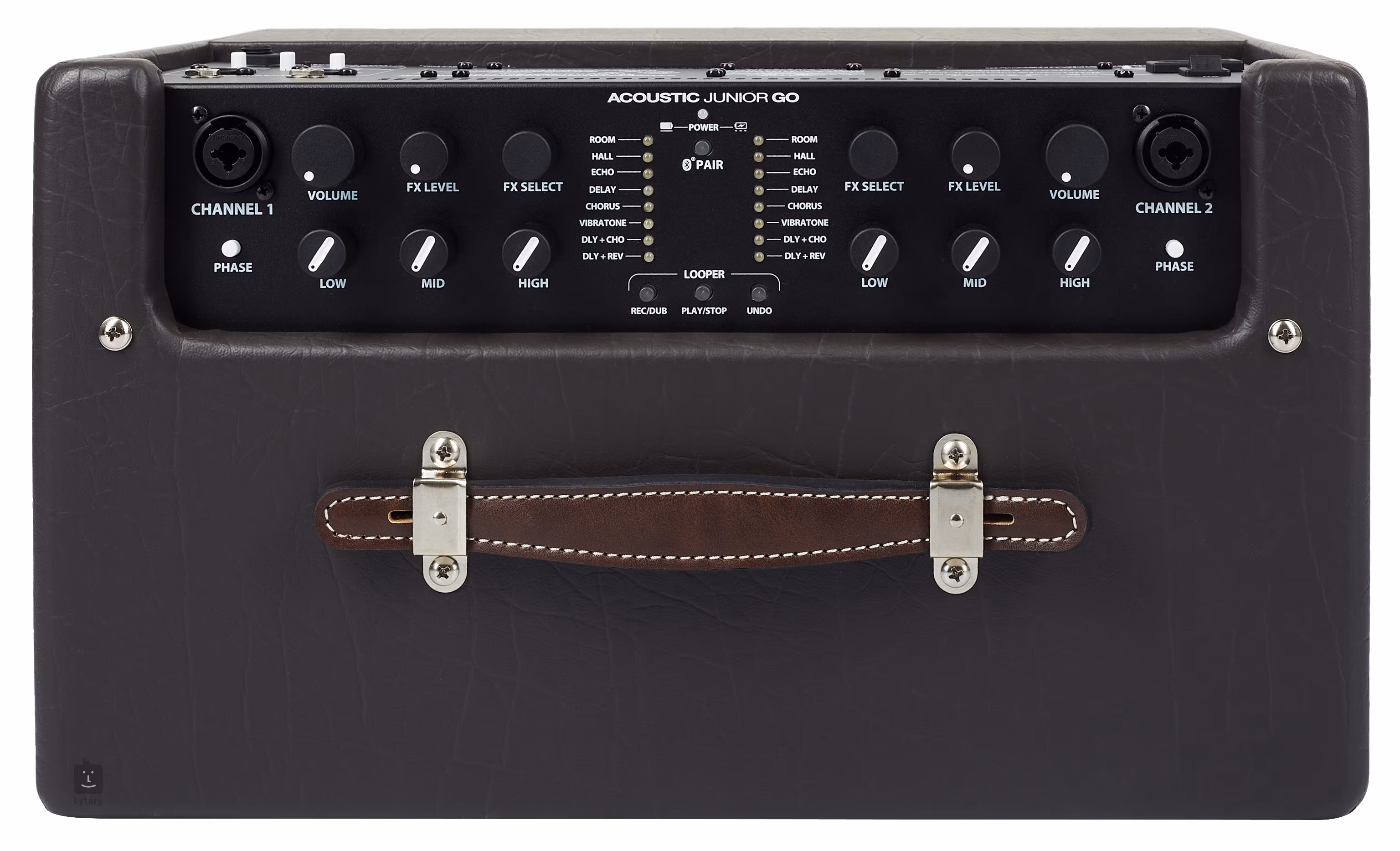 Das Hauptpanel des Combos bietet zwei kombinierte XLR/6,3-mm-Klinkeneingänge, separate Kanalregler (Dreiband-Equalizer, Potentiometer zur Einstellung der Ausgangslautstärke, Lautstärke der Effektsektion, ausgewählter Effekttyp und Phase-Schalter – Rückkopplungsreduzierung). Die beiden XLR-Anschlüsse können als Stereo-/Mono- oder Kanal-1/2-Ausgänge verwendet werden. Mit einem 3,5-mm-Kopfhörerausgang und einer USB-Schnittstelle ist das Combo auch für die Bedürfnisse des Heim-/Studiomusikers geeignet. Über den Footswitch-Eingang kann ein vierkanaliger MGT-4-Footswitch (nicht im Lieferumfang enthalten) an das Combo angeschlossen werden.