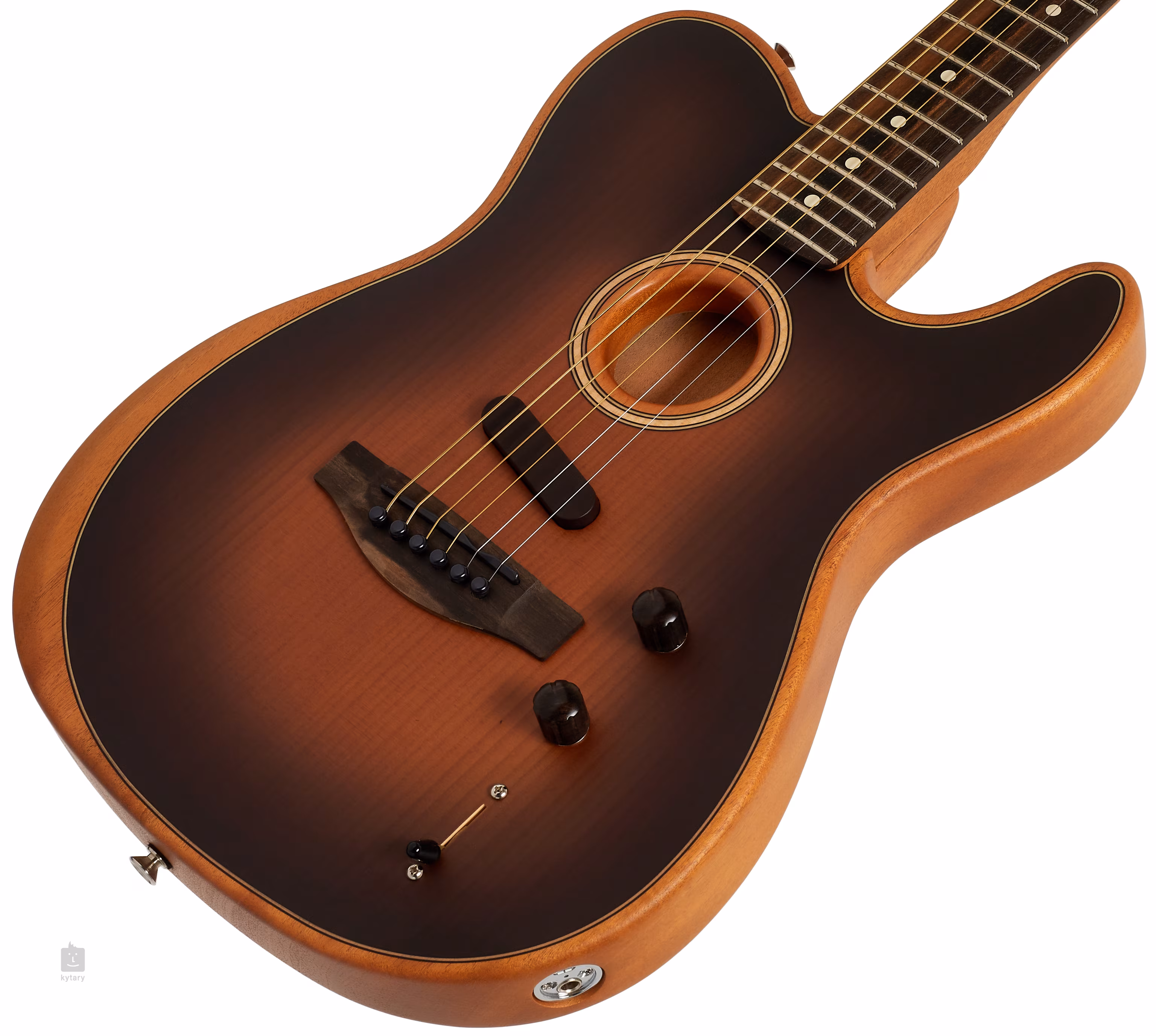 Die Acoustic-Engine-Technologie bietet Simulationen von acht akustischen Gitarren mit unterschiedlichen Korpusformen und Hölzern sowie von zwei elektrischen Gitarren in den Einstellungen Clean und Fat/Semi-Clean Electric. Mit einem fünfstufigen Schalter und einem Mode-Regler, mit dem sich auch der A/B-Voicing-Mix einstellen lässt, kann man zwischen den Sounds umschalten. Sie müssen sich also nicht fragen, ob Sie eine größere Dreadnought oder eine Gitarre mit kleinerem Korpus mitnehmen sollen, ob Palisander oder Mahagoni besser wäre und ob Sie schließlich auch den Klang einer Telecaster mögen - die Fender American Acoustasonic Telecaster bietet all das in einem kompakten Korpus.