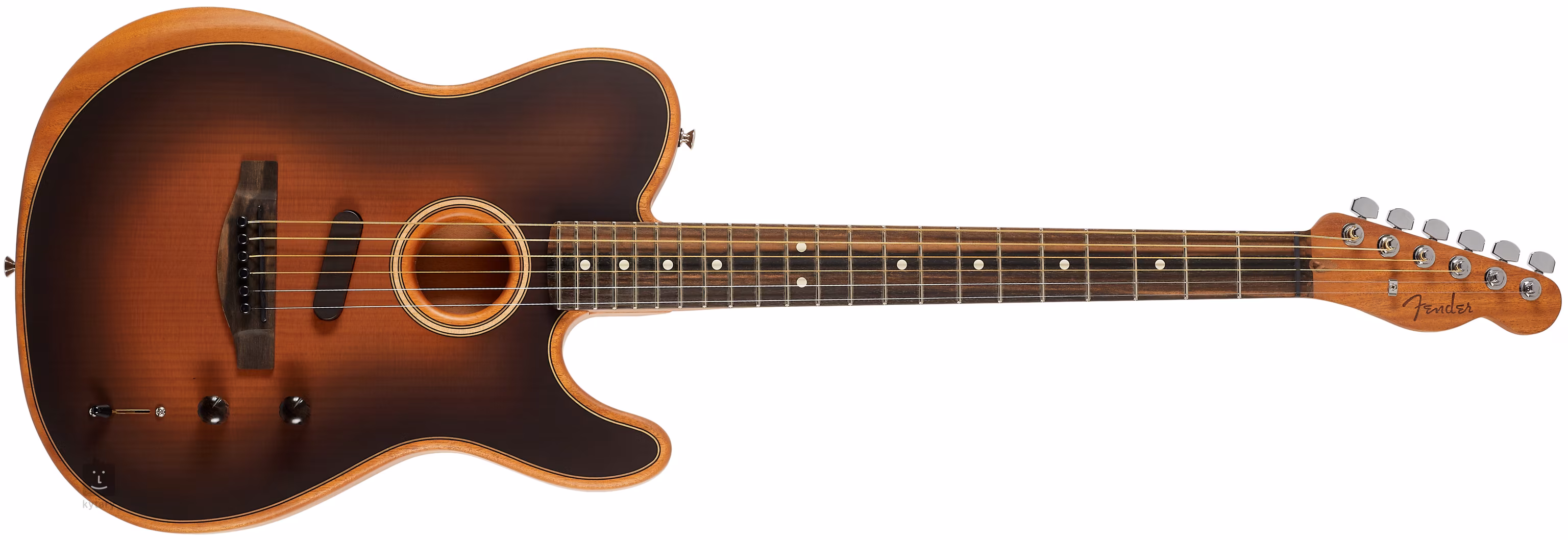 Die Fender American Acoustasonic Telecaster vereint die Welten der elektrischen und akustischen Instrumente und beweist, dass Fender nicht nur auf die glorreiche Vergangenheit schauen muss. Die Gitarre wird in Corona, Kalifornien (USA), hergestellt und ist dementsprechend hochwertig verarbeitet.