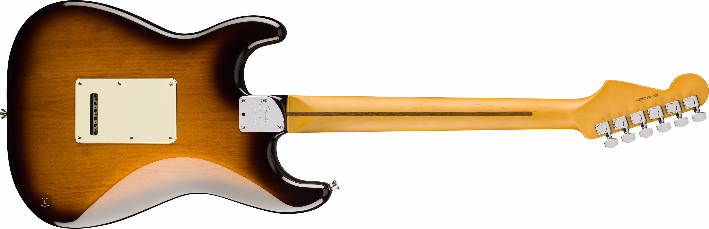 Der Erlenkorpus der American Professional II Stratocaster, Rosewood Fingerboard, Anniversary 2-Color Sunburst ist mit einem glänzenden Polyurethan-Lack überzogen. Der Ahornhals mit "Deep C"-Profil (eine Kreuzung aus Modern C und U) liegt perfekt in der Hand - egal, ob Sie schnelle Soli oder Akkorde spielen. Zweiundzwanzig Narrow Tall-Bünde und weiße Positionspunkte gliedern das Palisander-Griffbrett. Abgerundete Griffbrettkanten und ein neu geformter Halsfuß sorgen für eine leichte und komfortable Bespielbarkeit über die gesamte Griffbrettfläche.