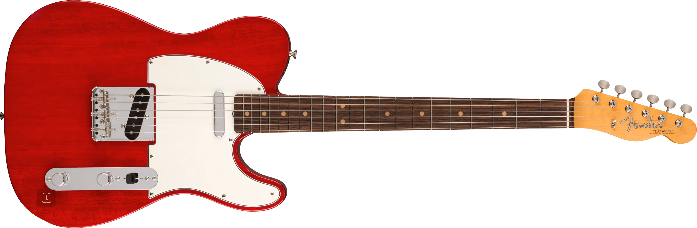 Die American Vintage II 1963 Telecaster Crimson Red Transparent E-Gitarre reproduziert authentisch den Klang und das Spielgefühl der Originale von 1963. Der Mahagonikorpus der Gitarre ist mit einem glänzenden Nitrozelluloselack überzogen, der nicht nur das Holz atmen lässt und den Klang nicht dämpft, sondern auch im Laufe der Jahre eine ganz persönliche Note verleiht. Auf den Ahornhals mit dem originalgetreuen 1963er "C"-Profil ist ein Palisandergriffbrett mit einundzwanzig Vintage Tall-Bünden geklebt.