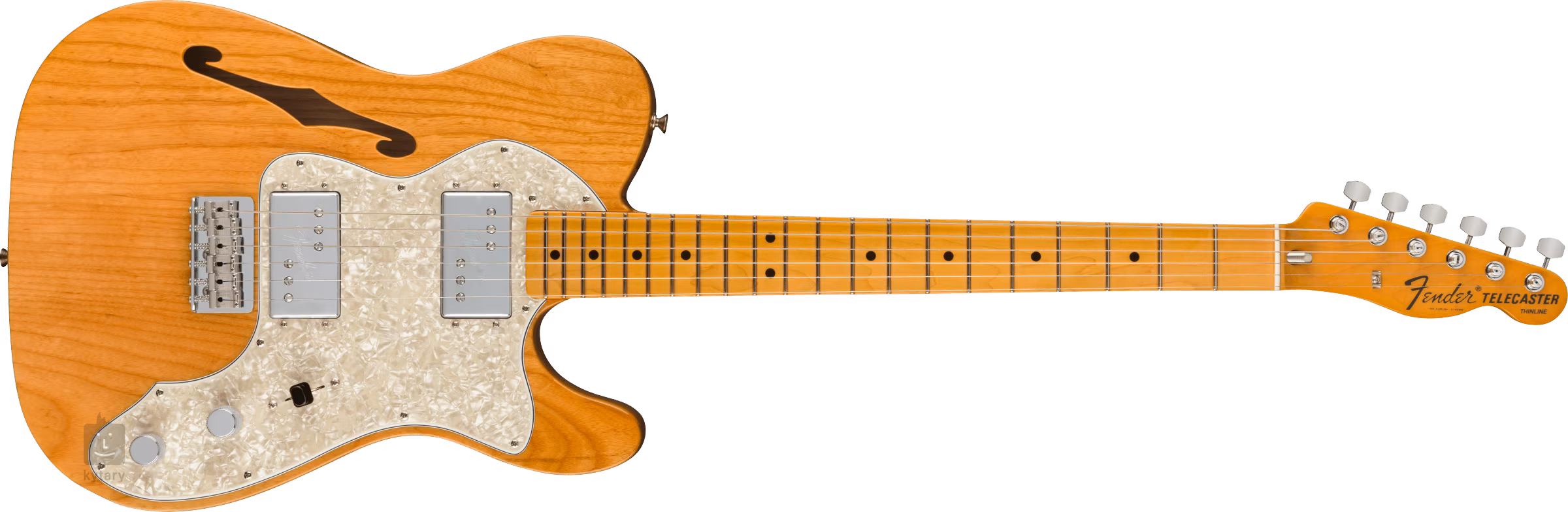 Die American Vintage II 1972 Telecaster Thinline Aged Natural E-Gitarre reproduziert exakt den Ton und das Spielgefühl der Originale, indem sie die Semi-Hollowbody-Konstruktion der Thinline-Serie mit dem vollen Klang von Humbuckern in einem Korpus kombiniert. Der Eschenkorpus der Gitarre ist mit einem glänzenden Polyurethan-Lack überzogen. Der 72er "C"-Profil-Hals und das Vintage Tall-Griffbrett mit 11 Bünden sind aus Ahorn gefertigt.
