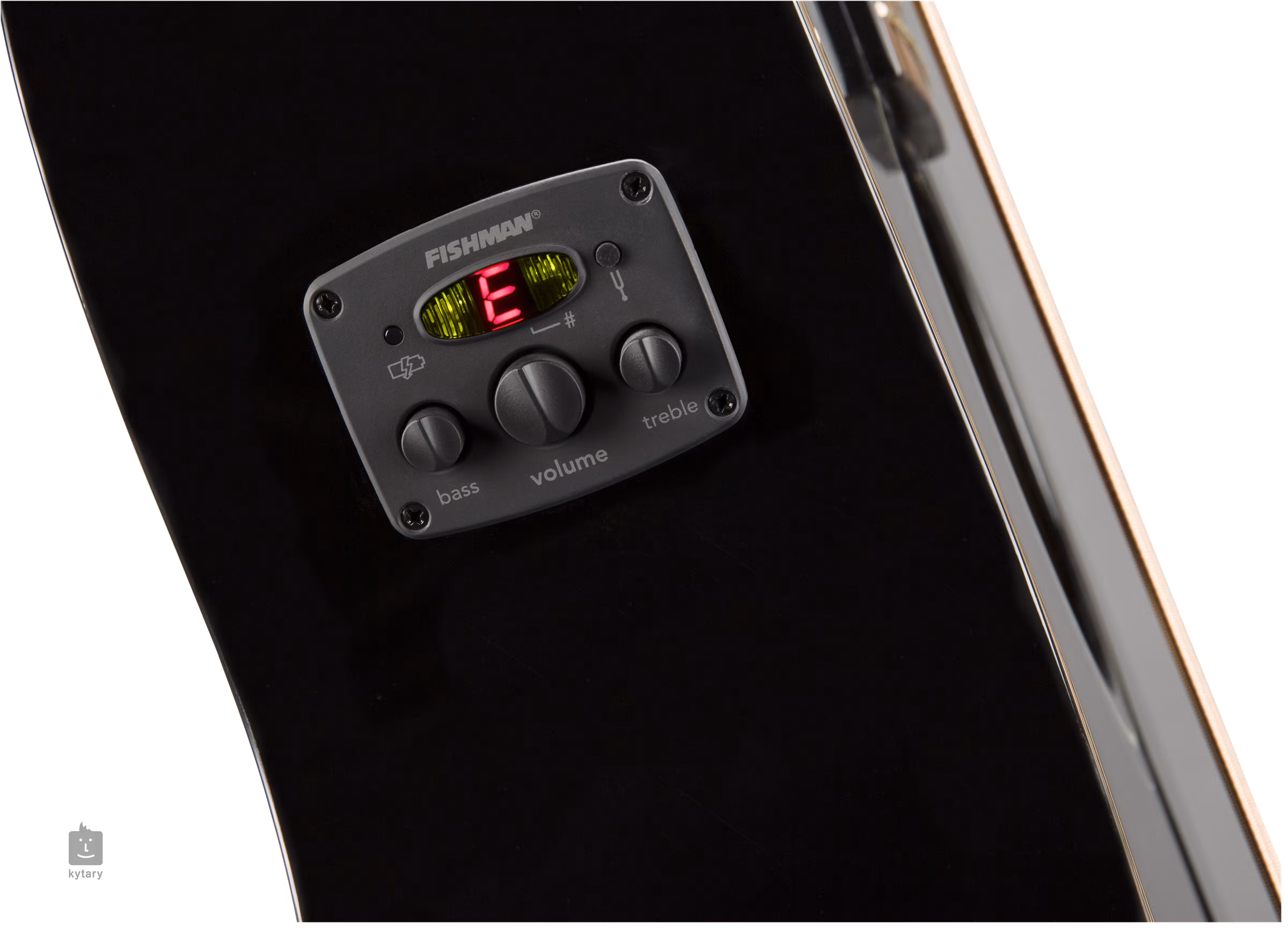 Für den Sound auf Konzertbühnen und im Studio sorgt der Fishman CD Preamp mit Lautstärkeregler, Zweiband-EQ und integriertem Stimmgerät. Die Saiten sind in das verchromte Druckguss-Chassis und den Walnuss-Saitenhalter der Firma eingebaut.