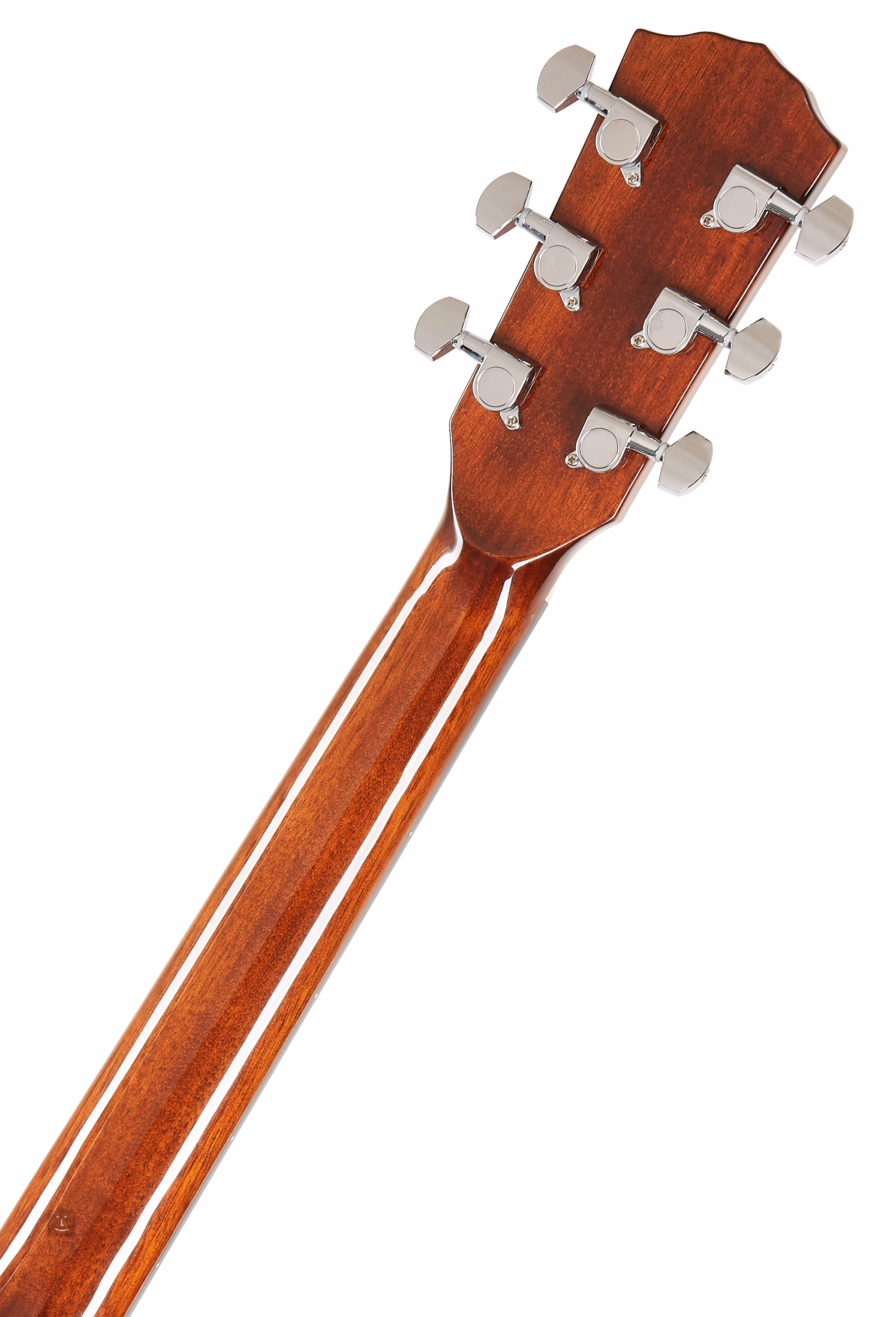 Der Korpus der Gitarre ist komplett aus Mahagoni gefertigt - massive Mahagoni-Front, laminierter Boden und Zargen. Die akustischen Eigenschaften des Korpus werden durch die reduzierte X-Rippe auf der Decke verbessert. Der Mahagoni-Hals liegt dank der abgerundeten Kanten des Griffbretts aus Walnussholz besser in der Hand. Gitarrenanfänger werden die Positionsmarkierungen aus Perlmuttimitat zur besseren Orientierung auf dem Griffbrett zu schätzen wissen.