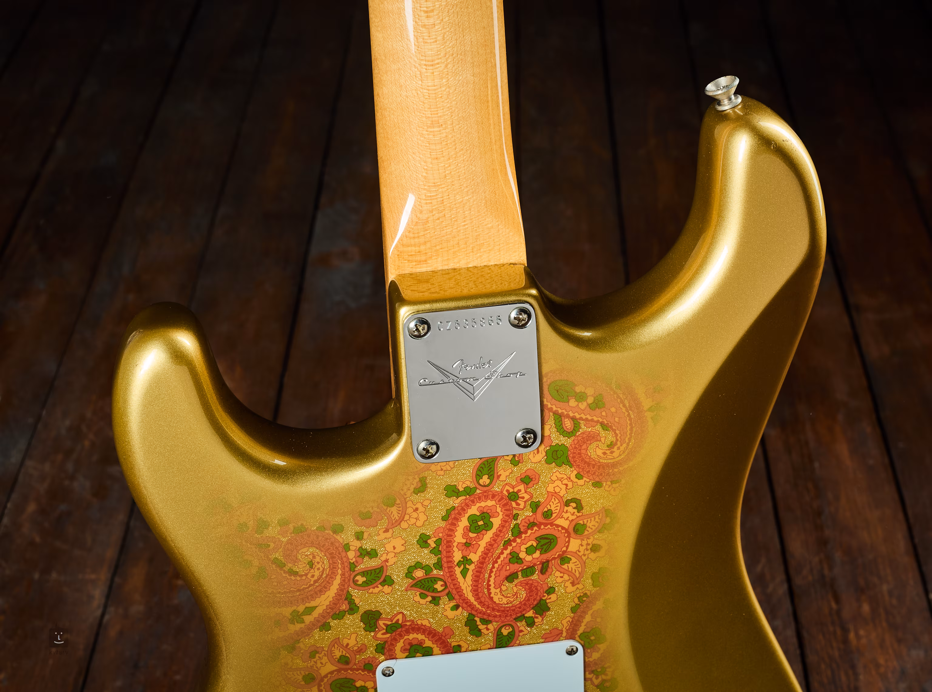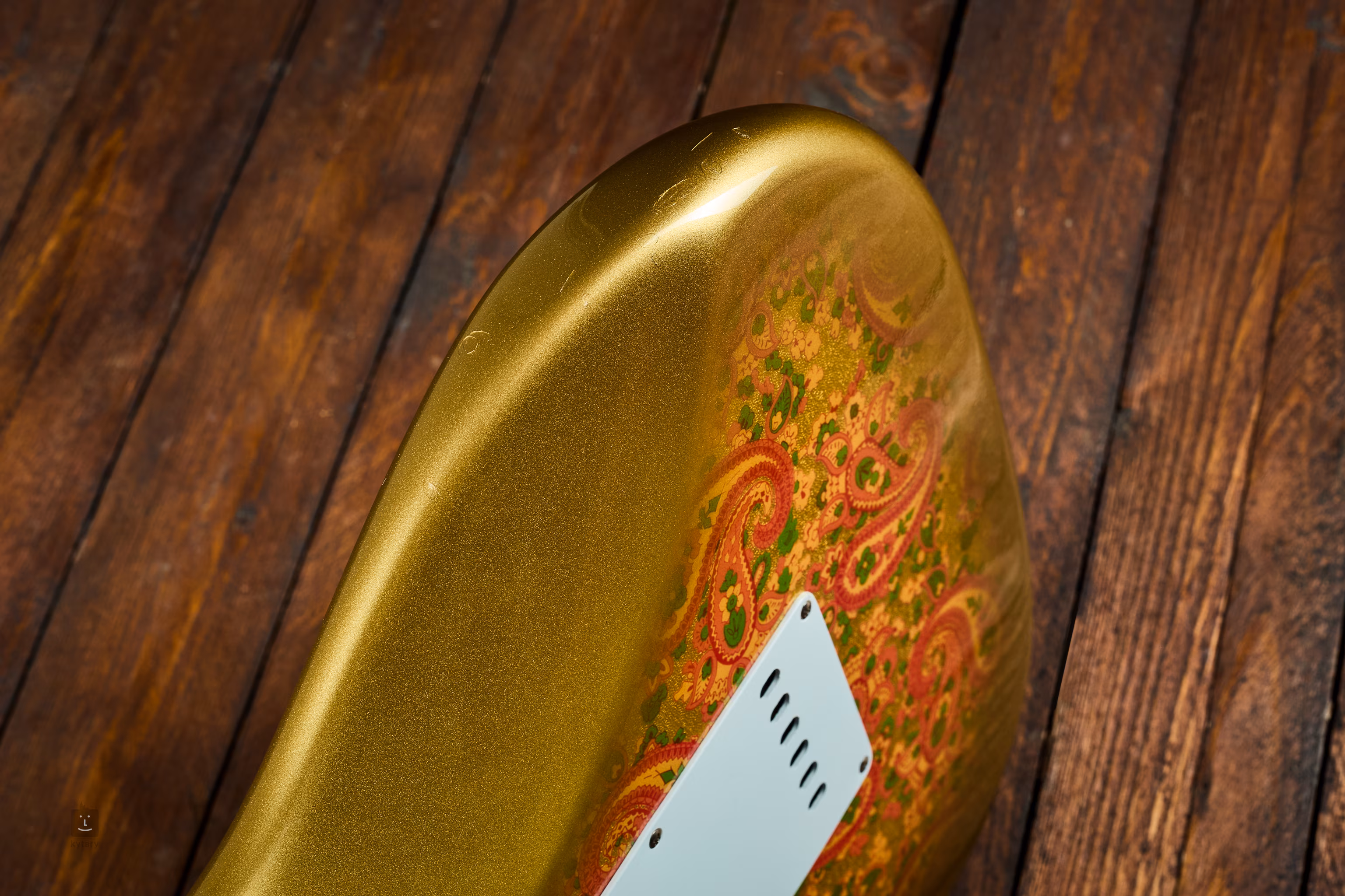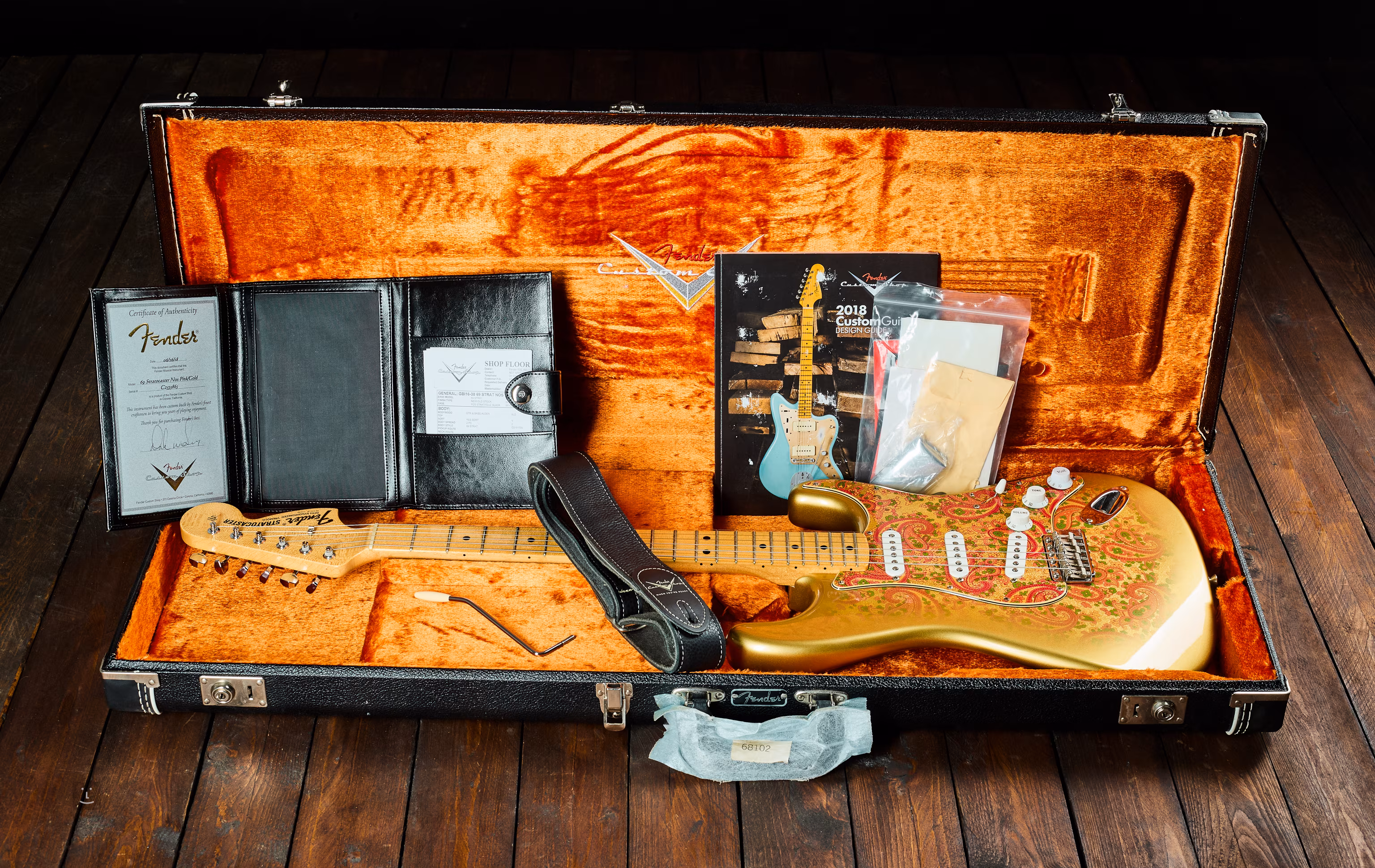 Das Instrument weist einige kleinere, rein kosmetische Gebrauchsspuren auf: auf der Oberseite des Korpus, an der Halsverbindung, um die hintere Tremoloabdeckung herum und am Ende der Kopfplatte. Im Lieferumfang enthalten ist der Originalkoffer mit sämtlichem Originalzubehör (Zertifikate, Tremolohebel, Katalog, Federn, Stegabdeckung, Fender Custom Shop-Ledergurt).