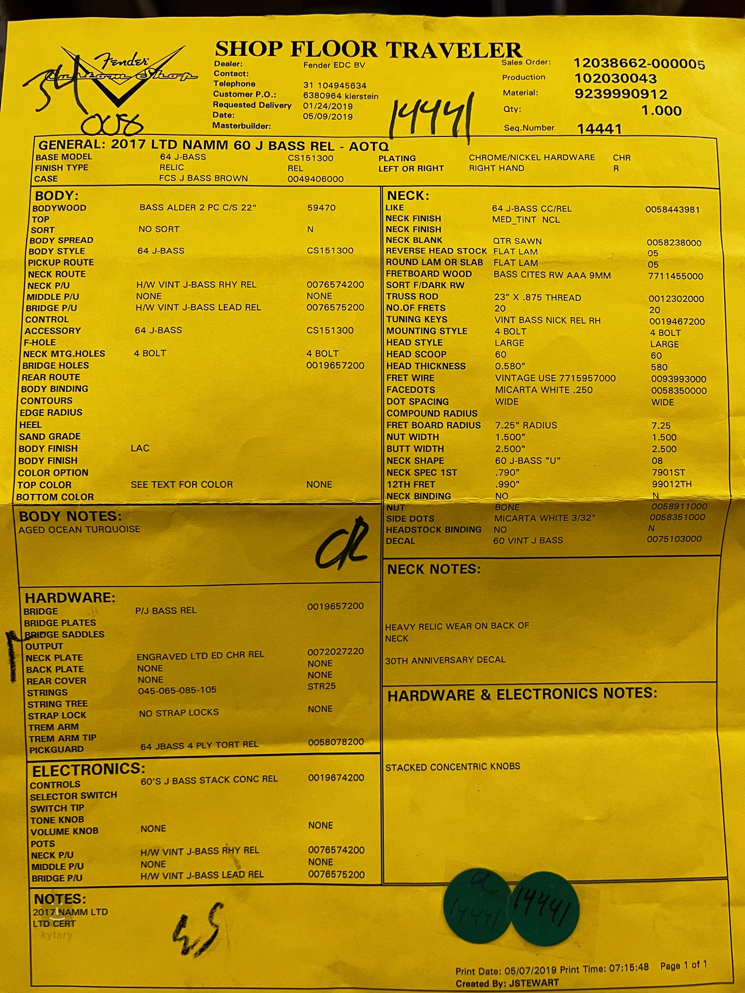 Dieser J-Bass wurde in der Werkstatt des Fender Custom Shop aus den besten Materialien und Komponenten zusammengebaut. Der Korpus ist aus Erle, der Hals aus viertelgesägtem Ahorn, das Griffbrett aus AAA-Palisander. Die Farbe des Korpus ist Aged Ocean Turquoise, ergänzt durch ein Schildpatt-Pickguard. Die Elektronik umfasst doppelte „Stacked Knobs”, wie sie auch bei den ersten Jazz-Bass-Modellen in den 60er Jahren verwendet wurden; die Tonabnehmer sind, wie üblich, handgewickelte Vintage-Single-Coils. Auf dem Kopf befindet sich das Emblem zum 30-jährigen Jubiläum der Fender Custom Shop-Werkstatt.