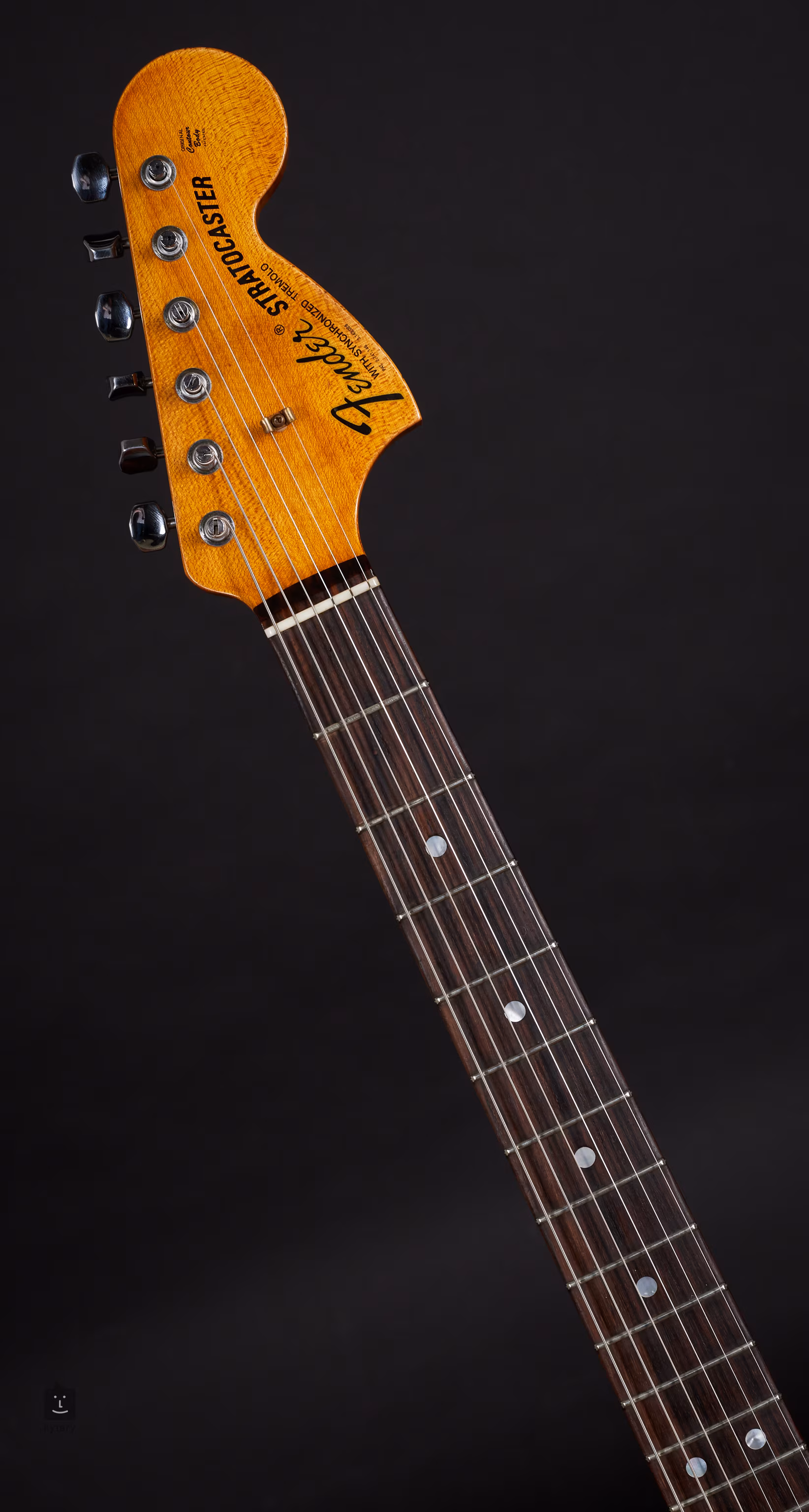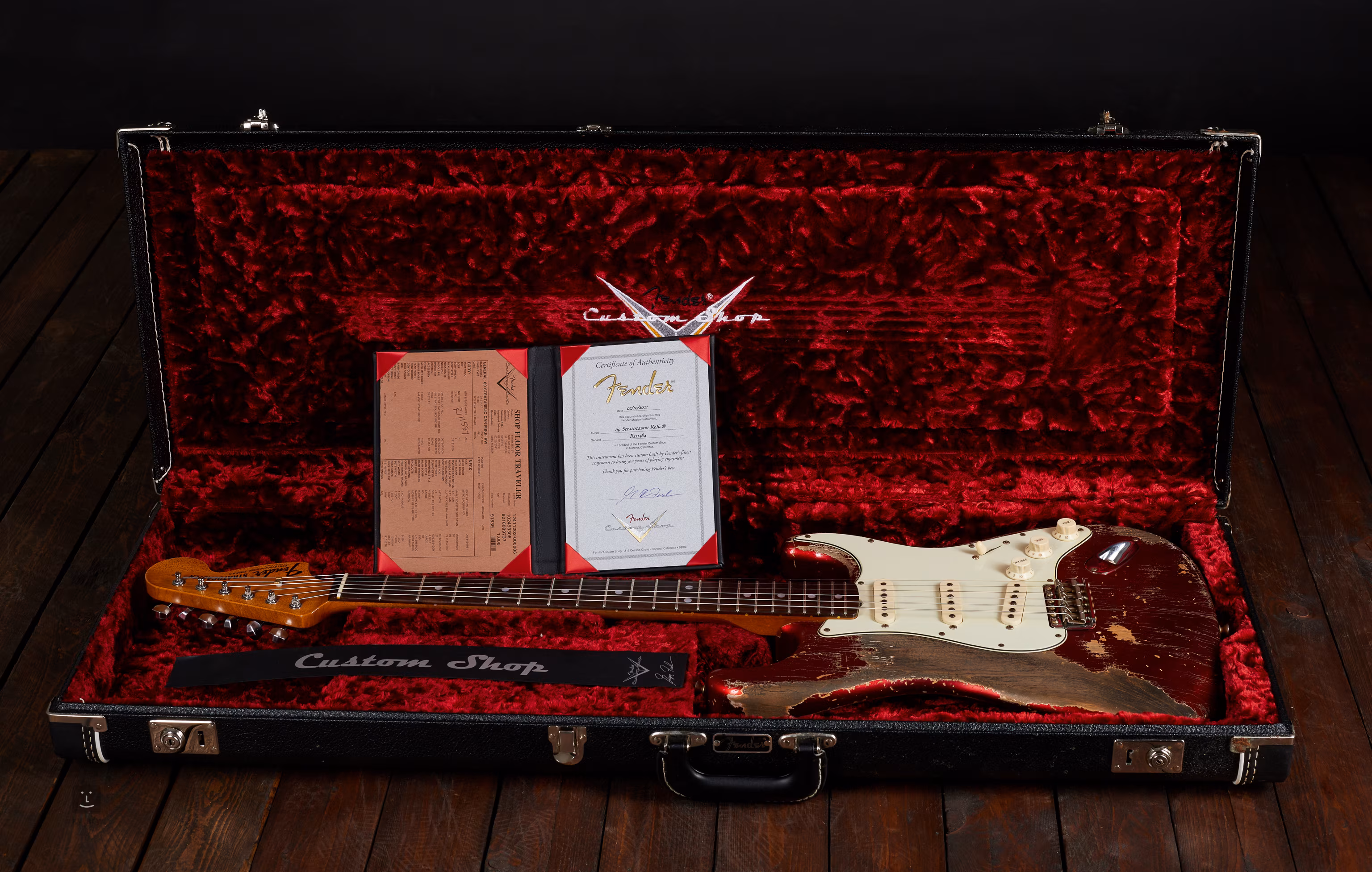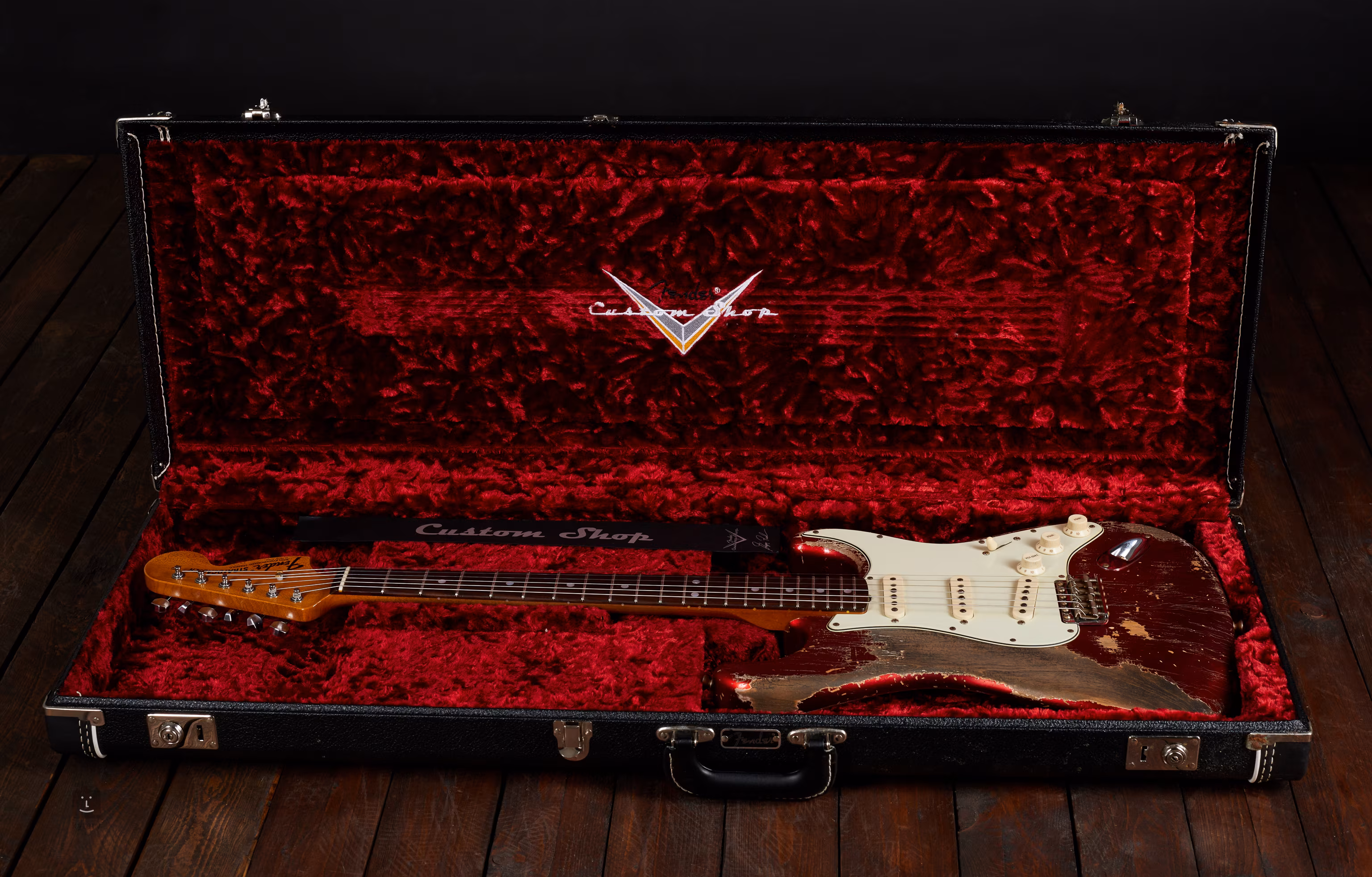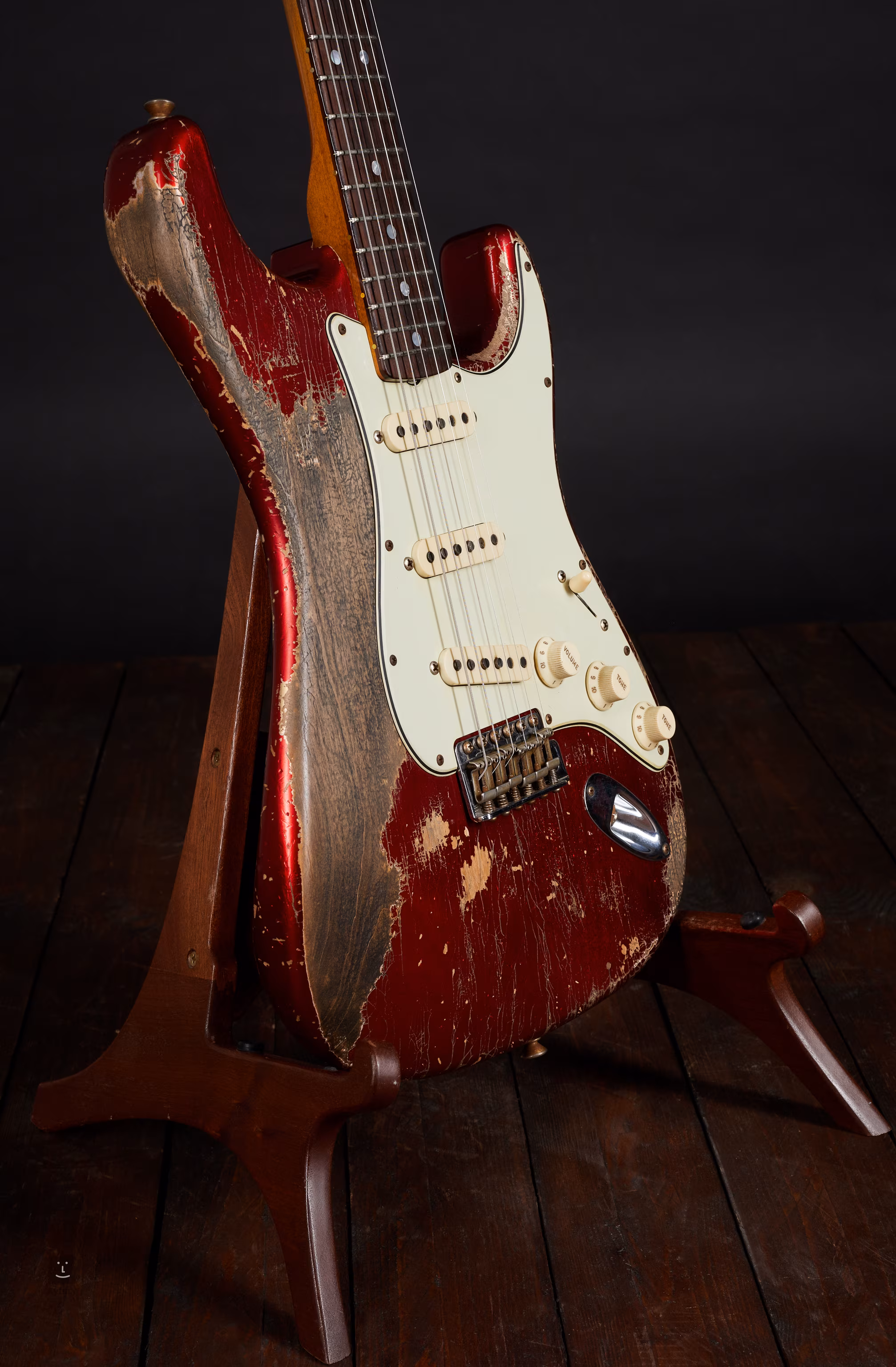 Die Basis dieser außergewöhnlichen Stratocaster ist ein Candy Apple Red Erlenkorpus und ein "roasted quarterawn" Ahornhals mit einem "1969 U" Profil. Das Palisander-Griffbrett hat einen universellen Radius von 9,5".