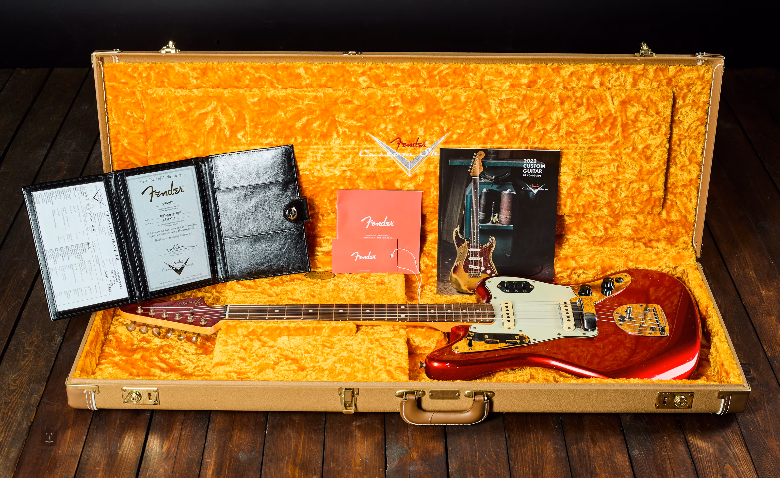 Der Korpus besteht aus zwei Stücken handverlesener Erle, die aufgrund ihres geringen Gewichts und ihrer geeigneten Struktur ausgewählt wurde. Das stilvolle Design und die kürzere Mensur machen dieses Instrument zu einem Muss für alle, die das Spielen in jeder Hinsicht genießen möchten. Der Ahorn-Hals, der senkrecht zu den Ringen geschnitten ist (Rift Sawn) und das zeitgenössische Profil „62 Jaguar“ aufweist, ist mit einem Palisandergriffbrett der Qualität AAA mit 22 Narrow Tall-Bünden versehen. Der Klang wird von zwei Custom Shop Vintage-Style-Jaguar-Tonabnehmern aufgenommen, die mit ihrer Leistung jeden Röhrenverstärker leicht in einen warmen Overdrive versetzen. Für Klangänderungen dient, wie für Jaguar-Gitarren typisch, eine komplexe Umschaltfunktion. Die Saiten sind über den Nullsattel aus Knochen in Stimmmechaniken im Vintage-Design und einem Jaguar-Floating-Tremolo befestigt.