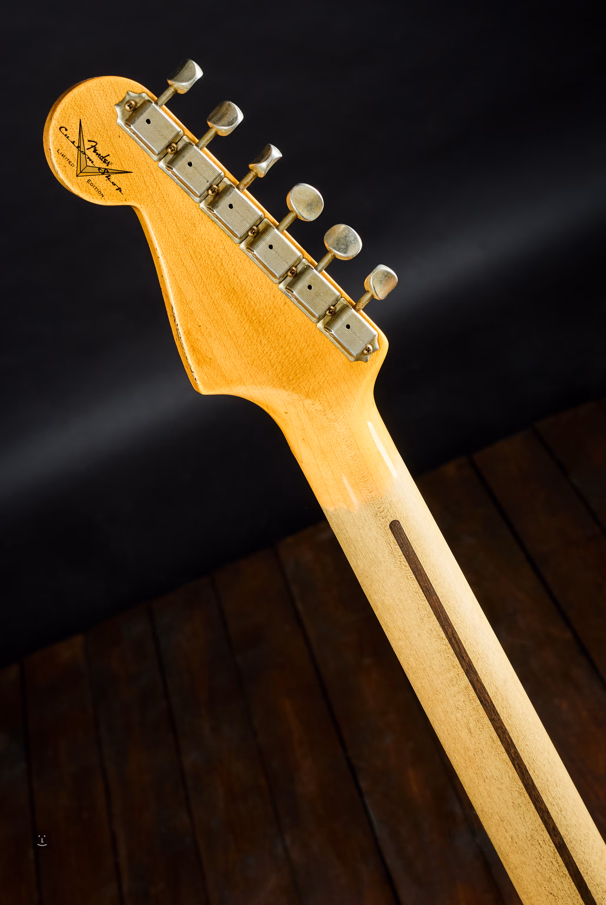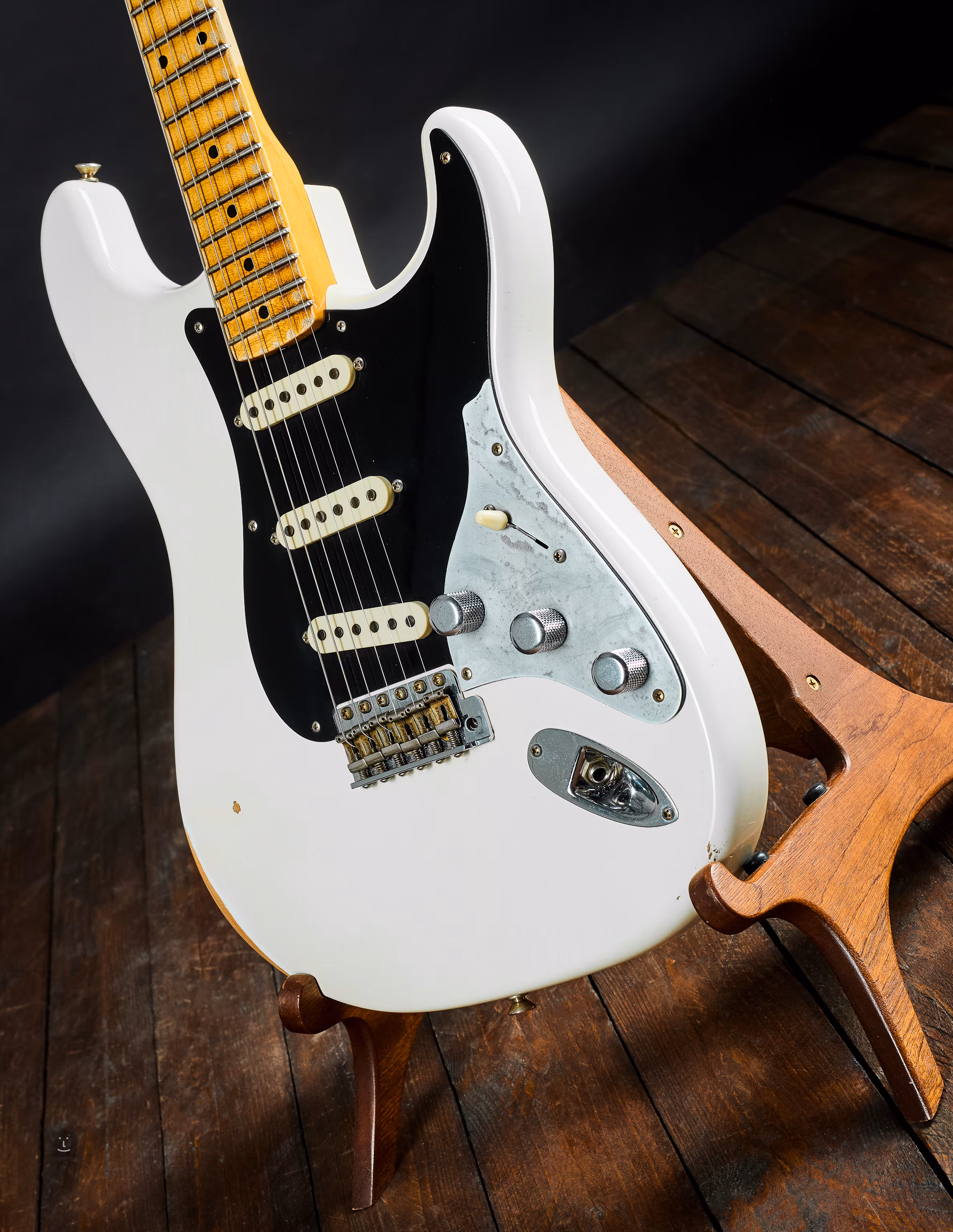 Der Korpus dieser Stratocaster ist aus zwei Teilen Erle gefertigt. Die Gitarre ist mit einem Relic-Finish mit authentisch aussehenden Faux-Patina-Elementen in Form von kleinen Schrammen, Kratzern und Narben verziert - einfach eine neue Gitarre, die aussieht, als hätte sie schon einige Jahre gespielt und wäre wahrscheinlich in Clubs und Bars gespielt worden. Die Oberfläche des Ahorn-Griffbretts ist durch einundzwanzig Jumbo-Bünde (6100) und schwarze Micarta-Positionspunkte unterteilt.