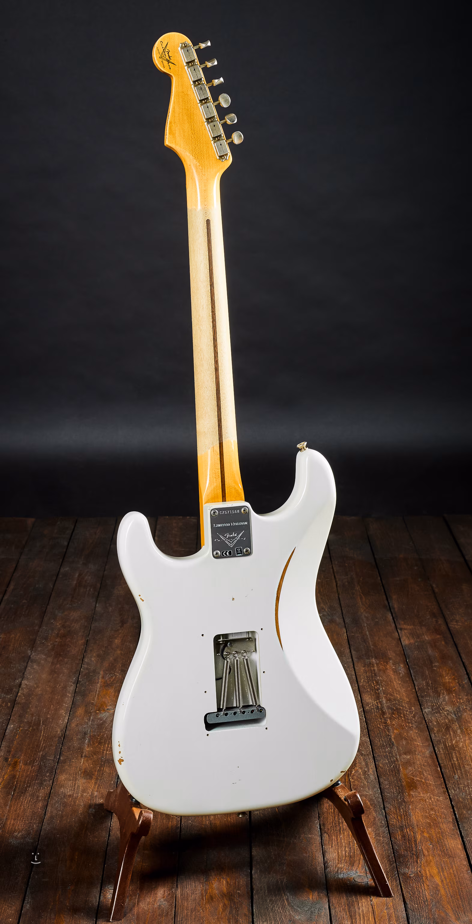 Drei handgewickelte Poblano Strat Single-Coil-Tonabnehmer mit Alnico 3- und 5-Magneten und fein gewickelten Spulen sind speziell für die jeweilige Position kalibriert und verleihen der Fender Strat einen Sound und ein Spielgefühl mit etwas mehr Glanz und Glut als normale Single-Coils bieten. Mit den Standardreglern lassen sich die Klangeinstellungen anpassen. Die Saiten sind in der Vintage-Mechanik und dem synchronisierten Tremolo des Unternehmens montiert. Die Gitarre wird in einem Koffer und mit einem Echtheitszertifikat geliefert.