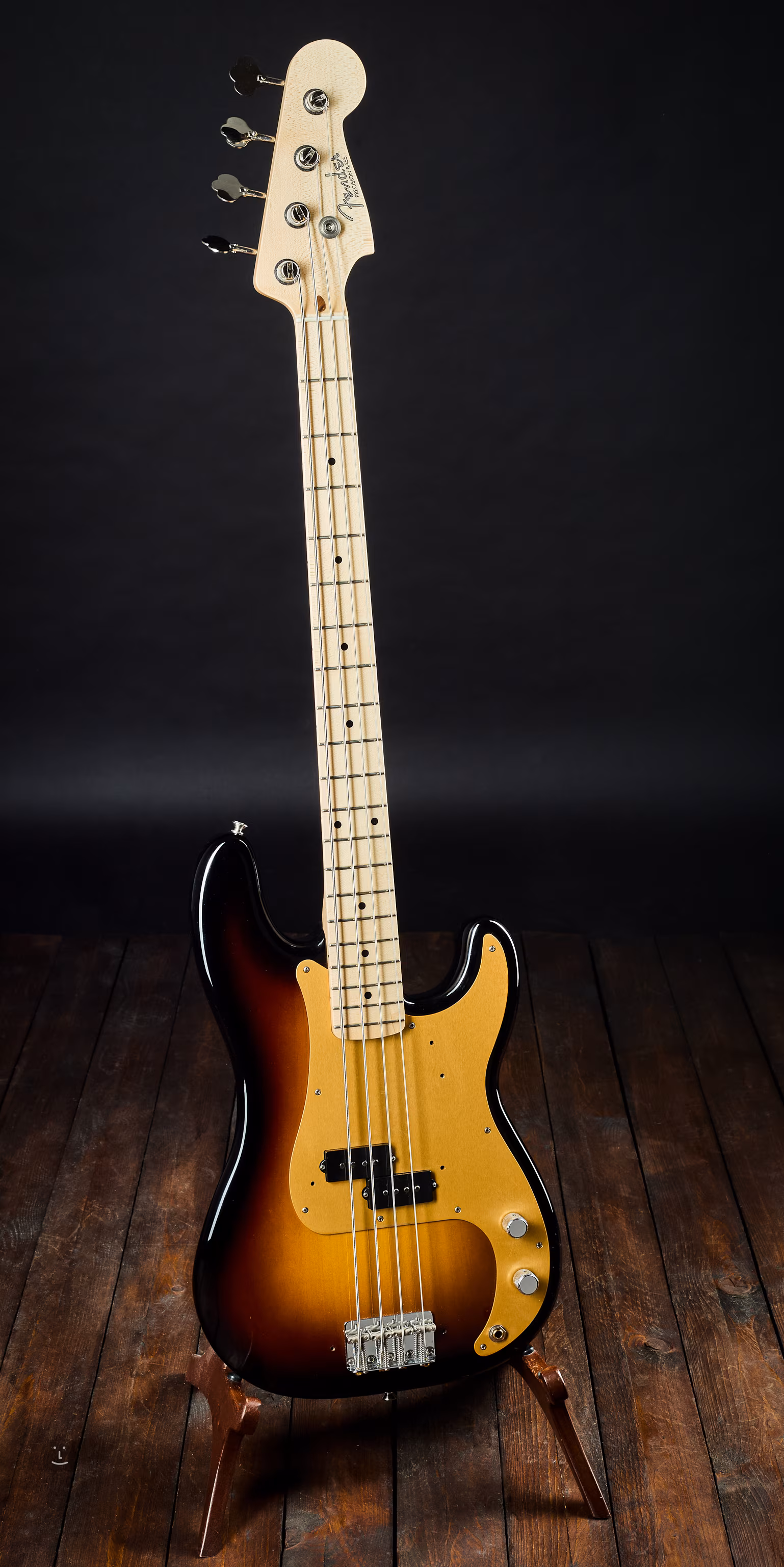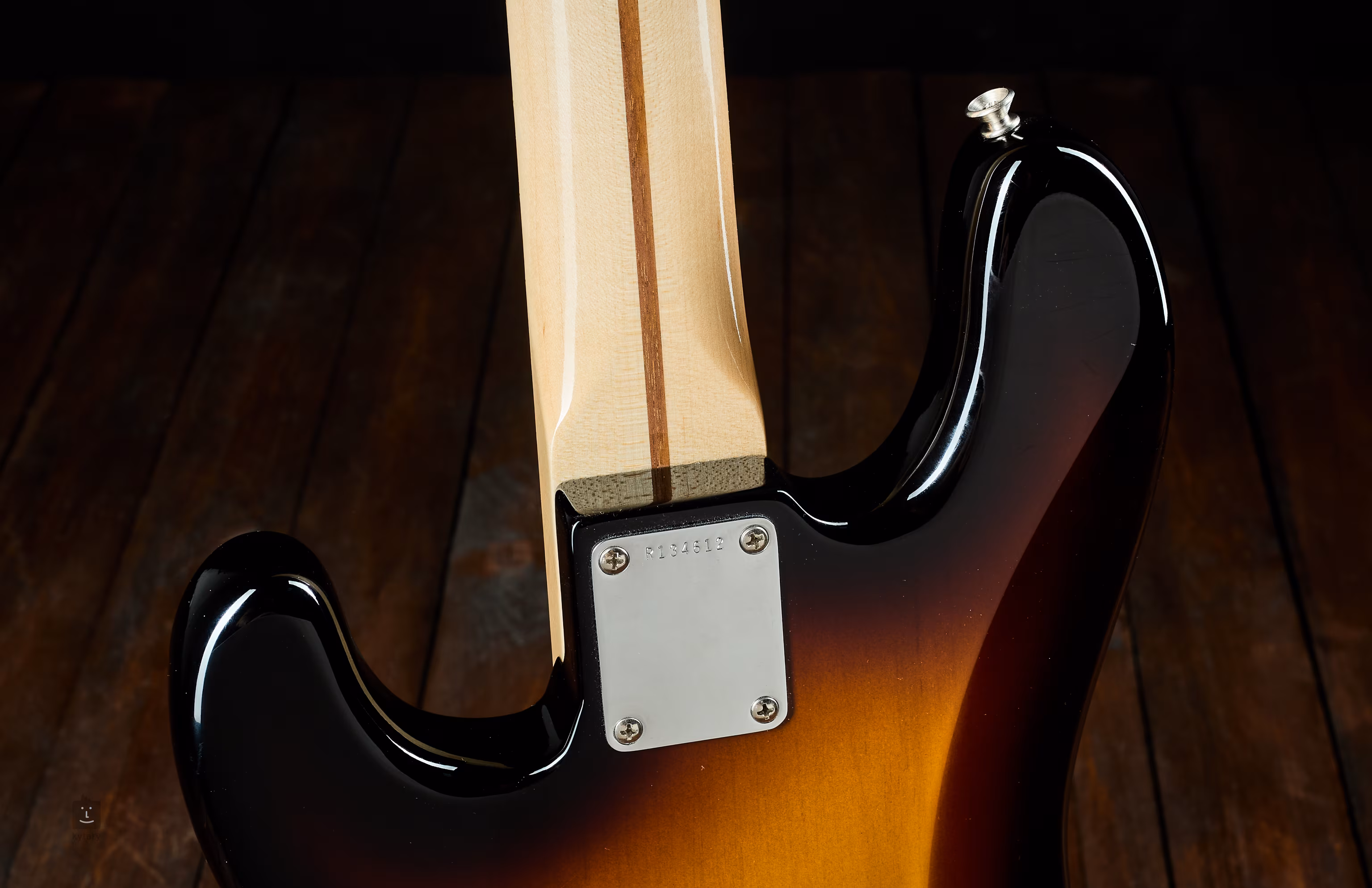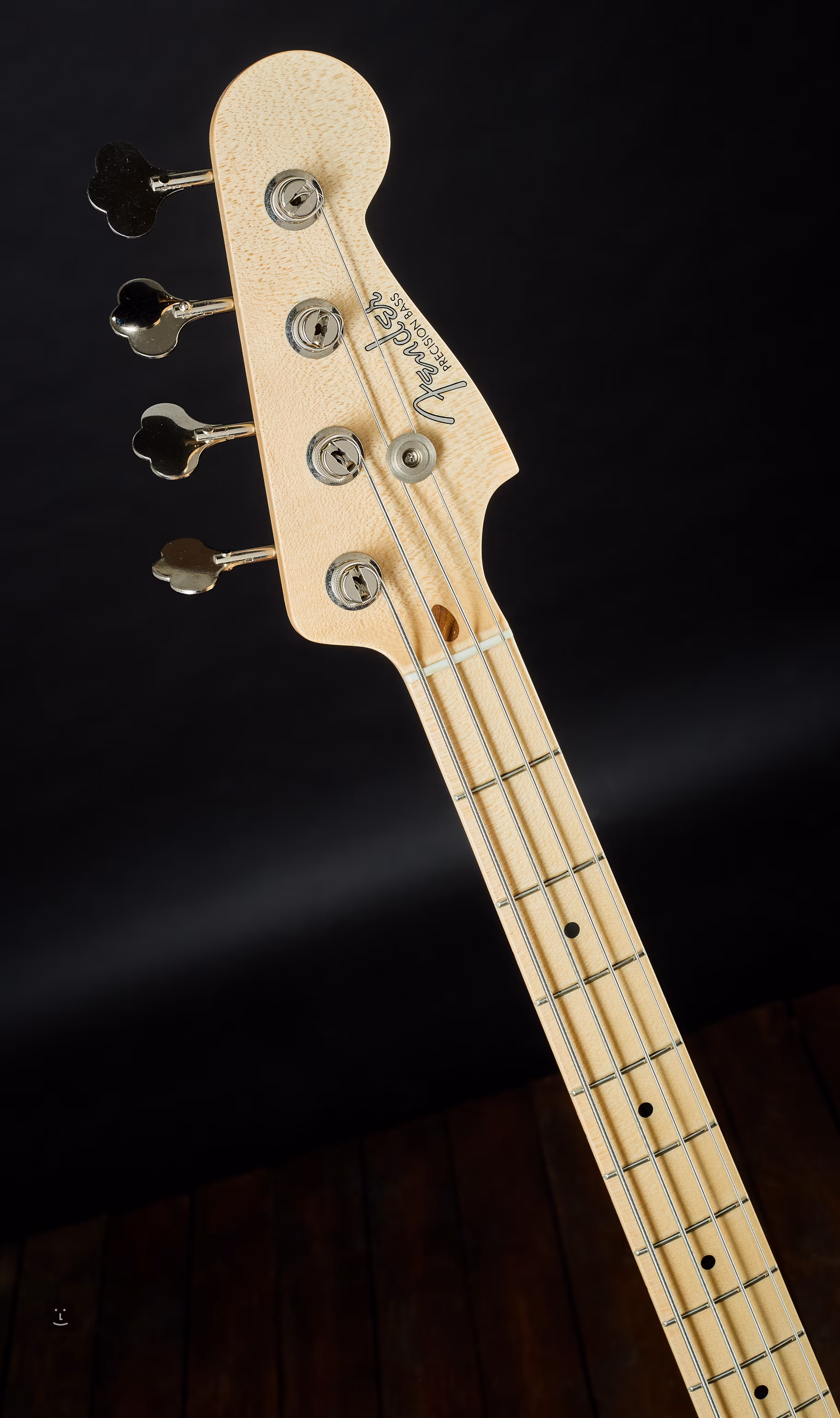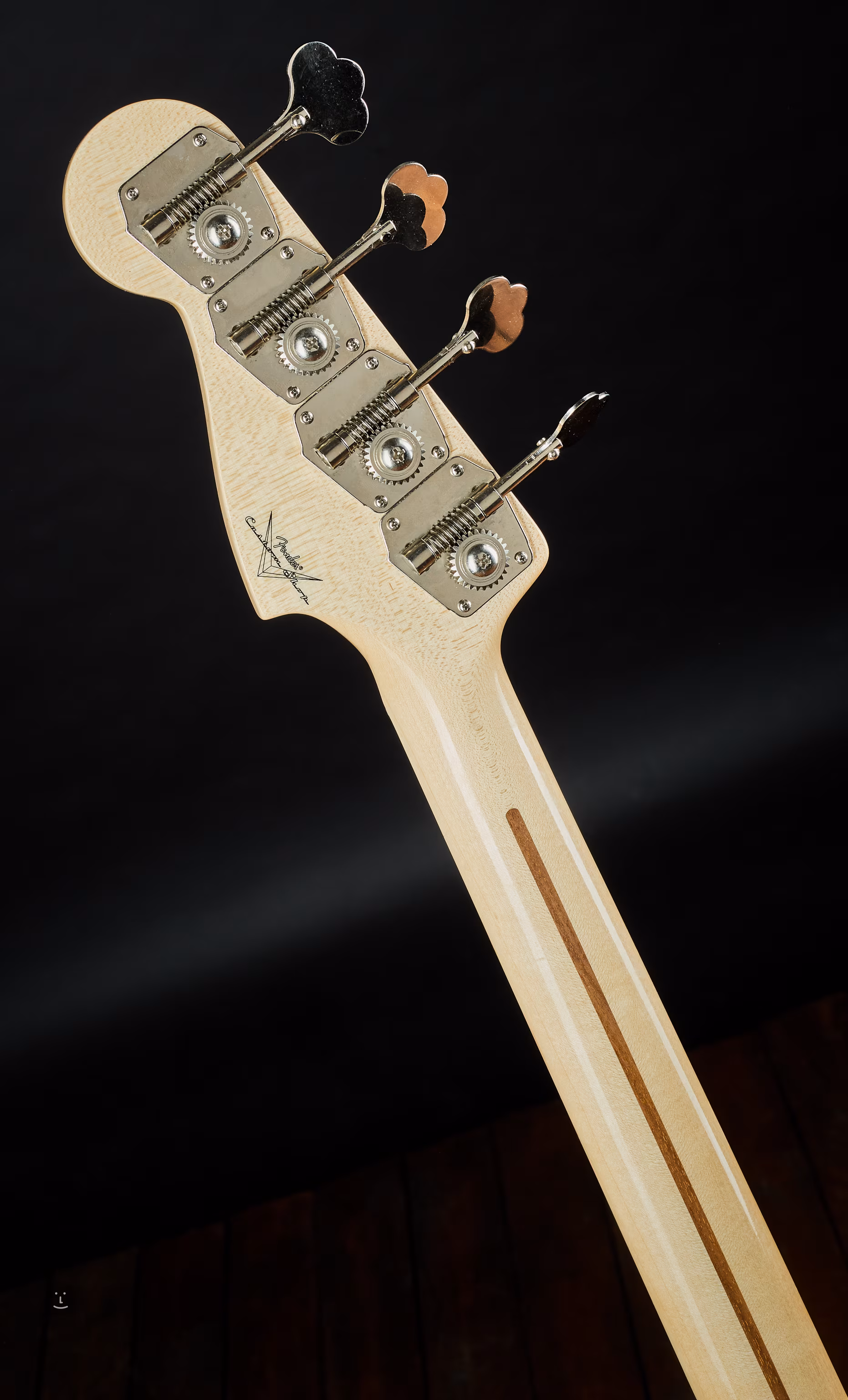Ein Griffbrett aus Palisander in AAA-Qualität mit zwanzig Bünden ist auf einen Ahornhals mit stabilem Quarterawn-Schnitt geklebt. Ein geteilter Singlecoil verleiht dem Instrument einen wunderbar dynamischen Bass im unteren Bereich. Mit den Reglern für Lautstärke und Ton lässt sich der Klangcharakter einstellen. Die stilvolle Verarbeitung wird durch Fender's Vintage-Stimmmechaniken und Schlagbrett in Goldlackierung unterstrichen.
