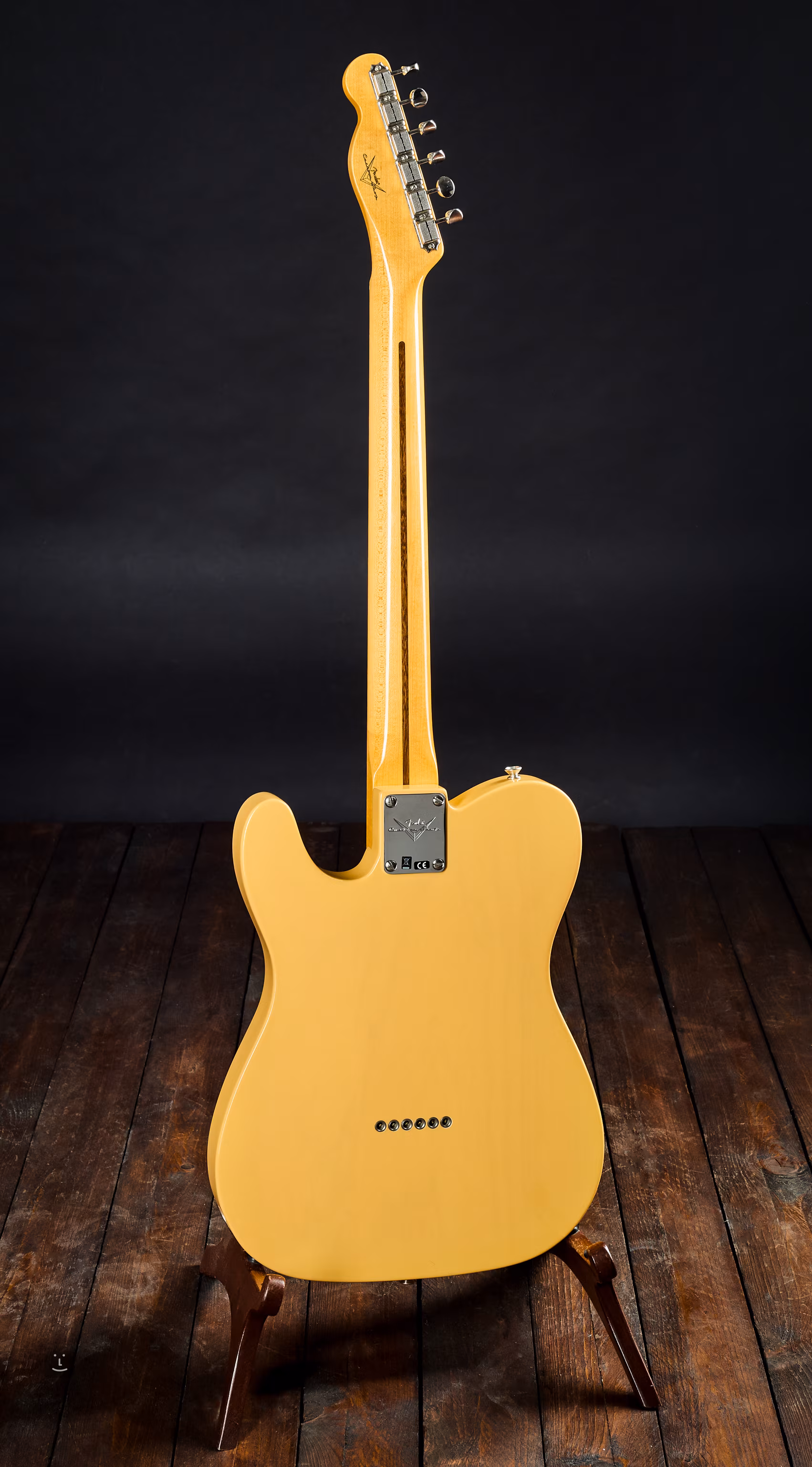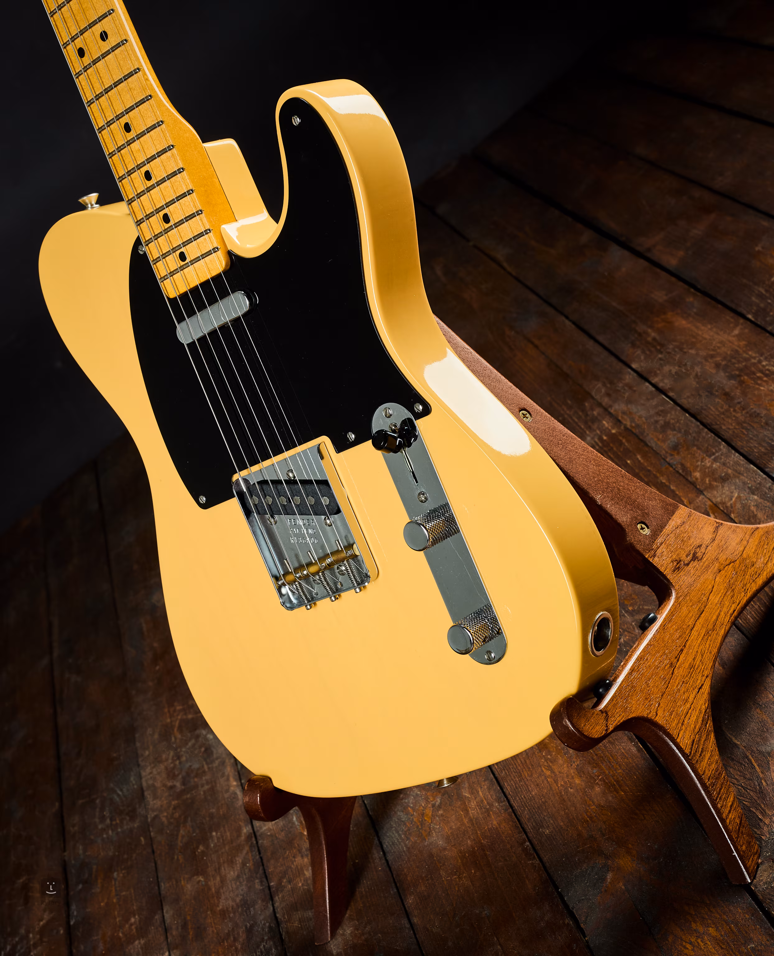 Der Korpus der Gitarre besteht aus zwei Stücken speziell ausgewählten Eschenholzes. Der einteilige, riftgesägte Ahornhals weist ein 10/56 "V"-Profil auf, und das Griffbrett ist durch einundzwanzig Medium Vintage (50085) Bünde unterteilt. Ein interessantes Merkmal ist der zusammengesetzte Radius des Griffbretts (7,25 am Nullbund und 9,5 am Hals), der auch bei einigen der ursprünglichen Broadcaster/Nocaster-Modelle zu finden ist.