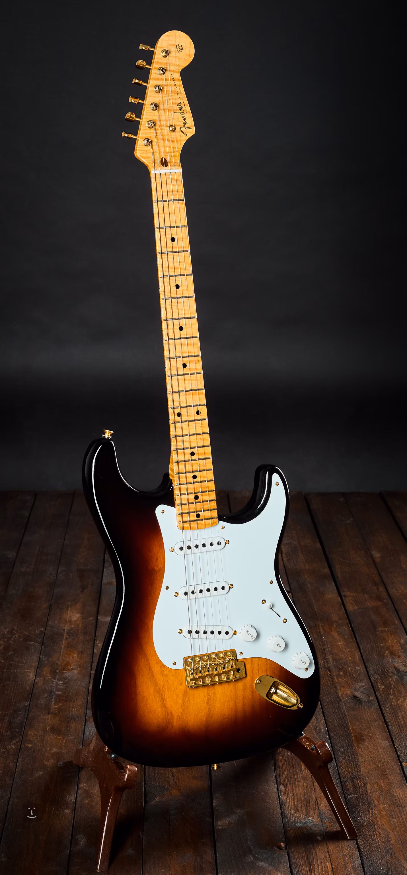 Der zweiteilige Esche-Body trägt die Lackierung Wide Fade Two-Color Sunburst. Das Deluxe Closet Classic Finish sorgt für eine sehr dezente künstliche Patina: leicht oxidierte Metallteile, feine Oberflächenkratzer an Body und Kopfplatte, minimal ausgeblichene Kunststoffteile und insgesamt ein zurückgenommener Glanz – als wäre das Instrument über Jahrzehnte nur selten aus dem Koffer geholt worden. Der Hals besteht aus einem Stück geflammtem Ahorn (5A) und hat ein spezielles 70th Anniversary Soft "V" Profil nach Spezifikationen von Stratocastern aus Juli 1954. Das Griffbrett ist mit 21 Medium Vintage Bünden (47095) bestückt. Drei handgewickelte Singlecoils aus dem Fender Custom Shop liefern den klassischen Strat-Ton mit klaren, glockigen Höhen. Standard-Regler übernehmen die Klangformung. Vintage-Style Mechaniken und das Custom Shop Synchronized Tremolo sorgen für das richtige Feeling. Optische Details: einlagiges weißes Pickguard, Seriennummer auf der Backplate, Pickup- und Reglerkappen aus ABS im 1954-Style sowie die 70th Anniversary Stratocaster Neck Plate.