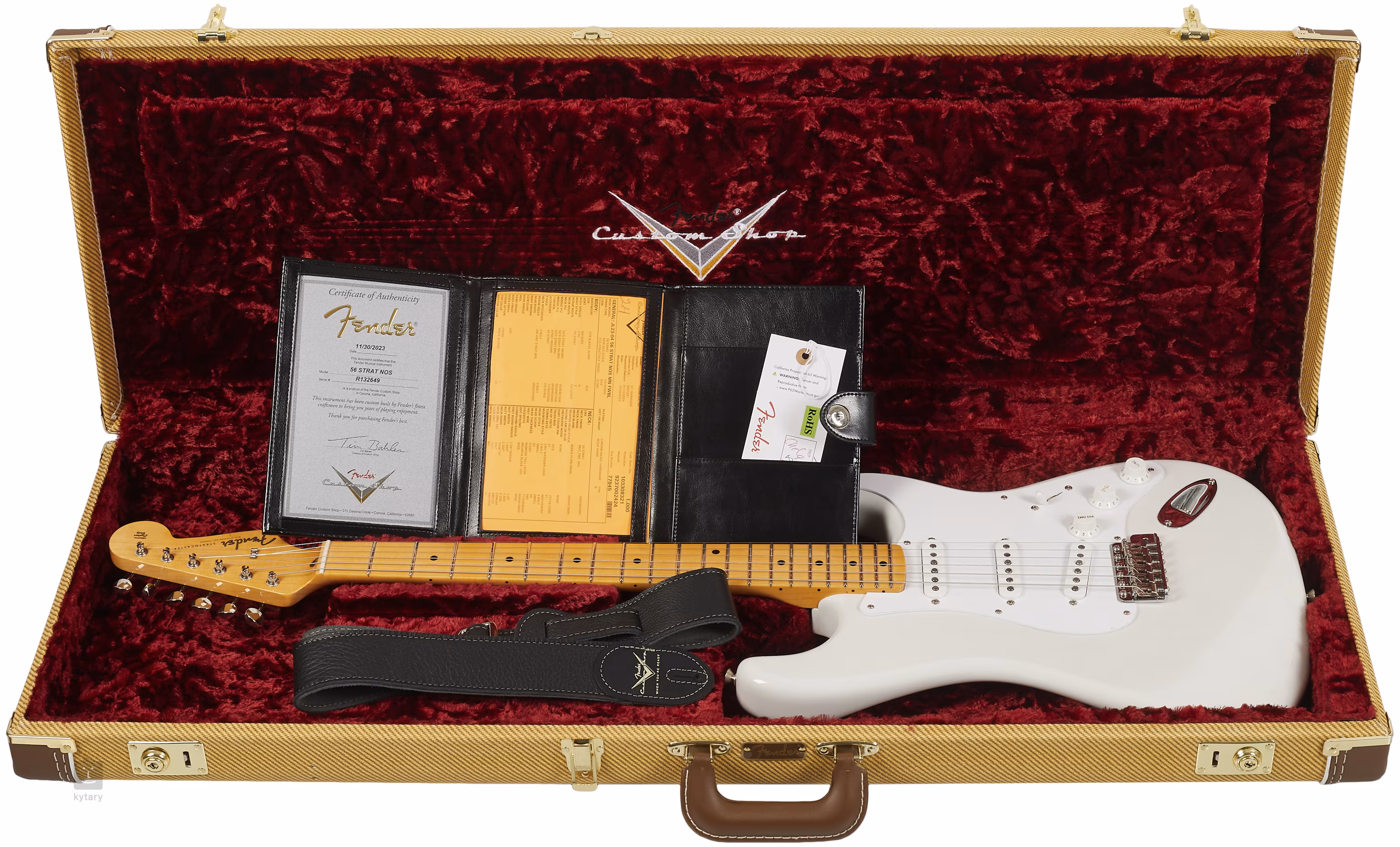 Die Saiten sind über einen Knochen-Nullbund in den Vintage-Stimmmechaniken des Unternehmens und einem synchronisierten Strat-Tremolo verankert. Die Gitarre wird in einem Koffer mit einem Echtheitszertifikat geliefert.