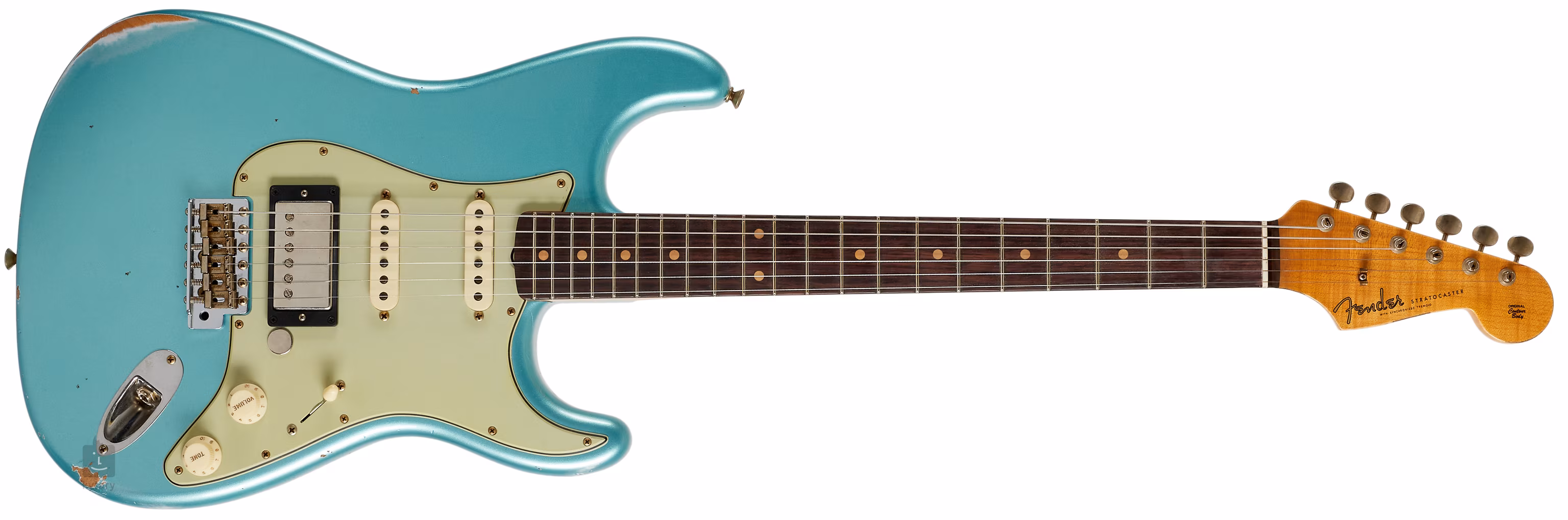 Der Erle-Korpus der Gitarre ist mit einer Daphne Blue Metallic-Lackierung verziert und die Relic-Lackierung weist authentisch aussehende Faux-Patina-Elemente in Form von kleinen Schrammen, Kratzern und Narben auf, die der Gitarre das Aussehen eines Instruments verleihen, das jahrelang in Clubs und Bars gespielt und geblitzt wurde. Auf den gemaserten Ahornhals in AA-Qualität ist ein Palisandergriffbrett in AAA-Qualität geklebt, das mit einundzwanzig Narrow Tall (6105) Bünden ausgestattet ist.