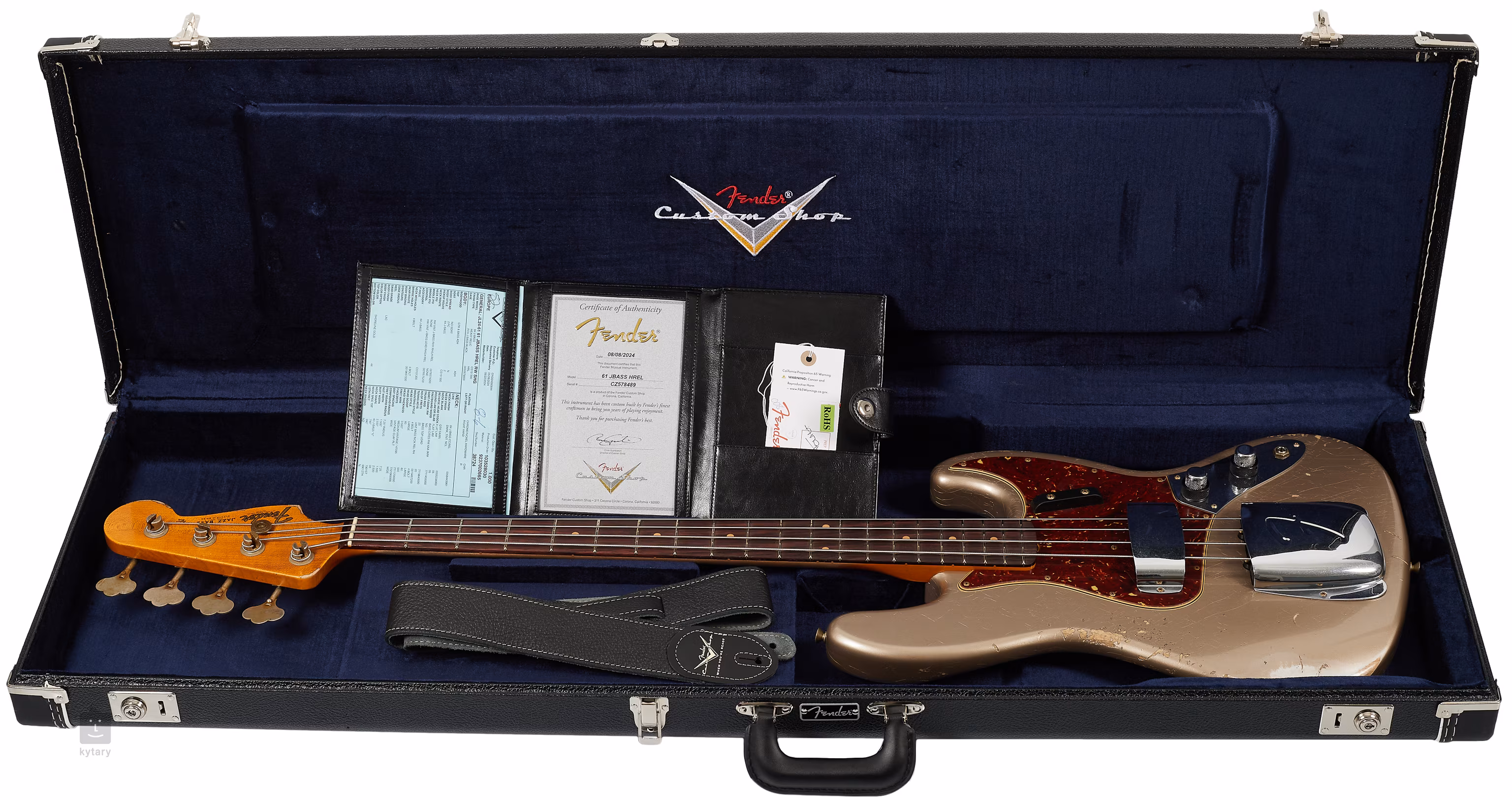 Der Bass wird in einem Koffer mit Echtheitszertifikat und Gitarrengurt geliefert.