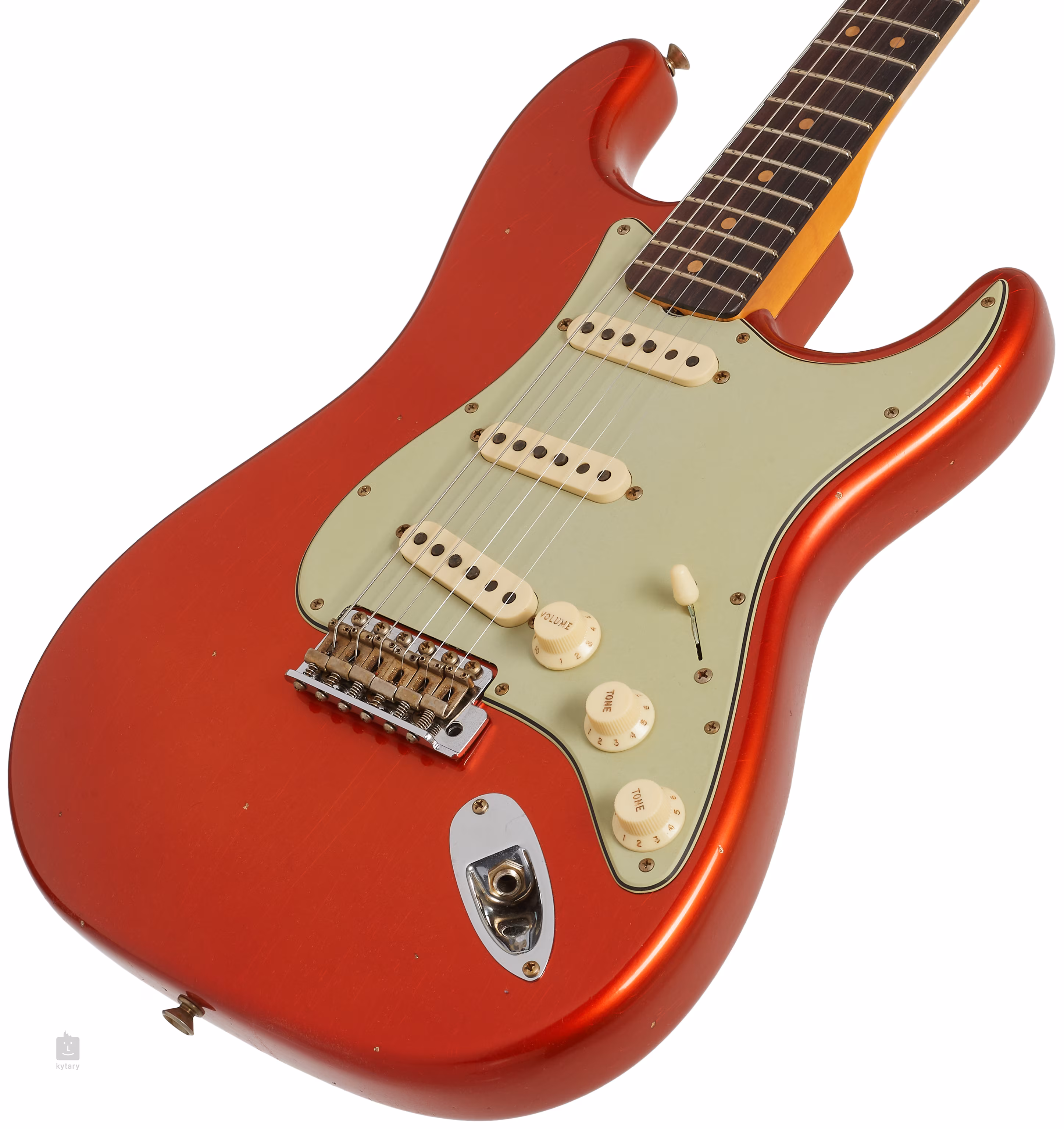 Der leichte Korpus der Gitarre ist aus zwei Teilen Erle gefertigt. Das Candy Tangerine-Finish der Journeyman Relic bietet einen Hauch von Patina-Lack und Hardware, die dem jahrzehntelangen regelmäßigen, eher häuslichen Gebrauch entsprechen. Ein AAA-Qualitäts-Palisander-Griffbrett mit einundzwanzig Narrow Tall (6105) Bünden ist auf einen Ahornhals mit einem 63er Strat-"C"-Profil geklebt.