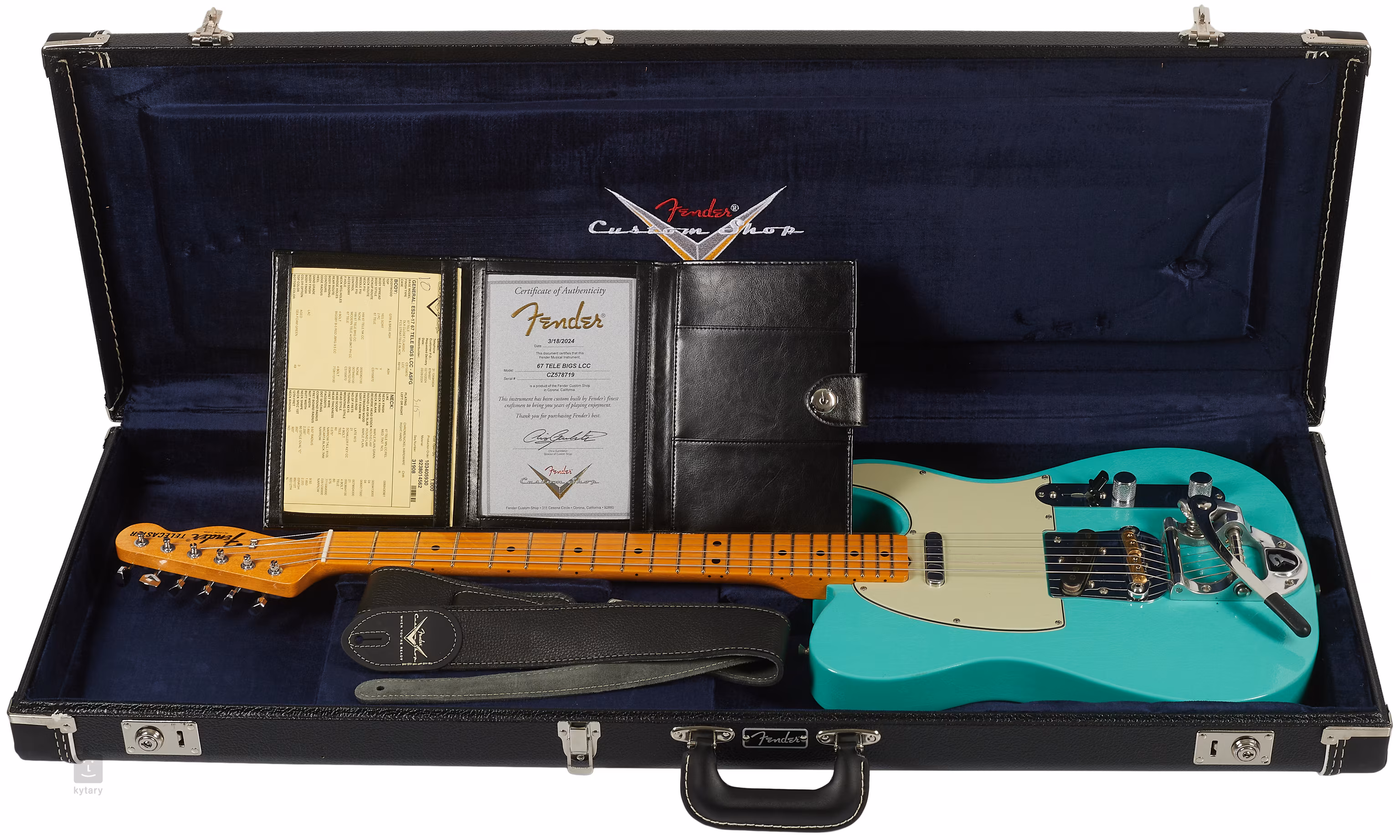 Die Gitarre wird in einem Koffer mit einem Echtheitszertifikat und einem Gitarrengurt geliefert.