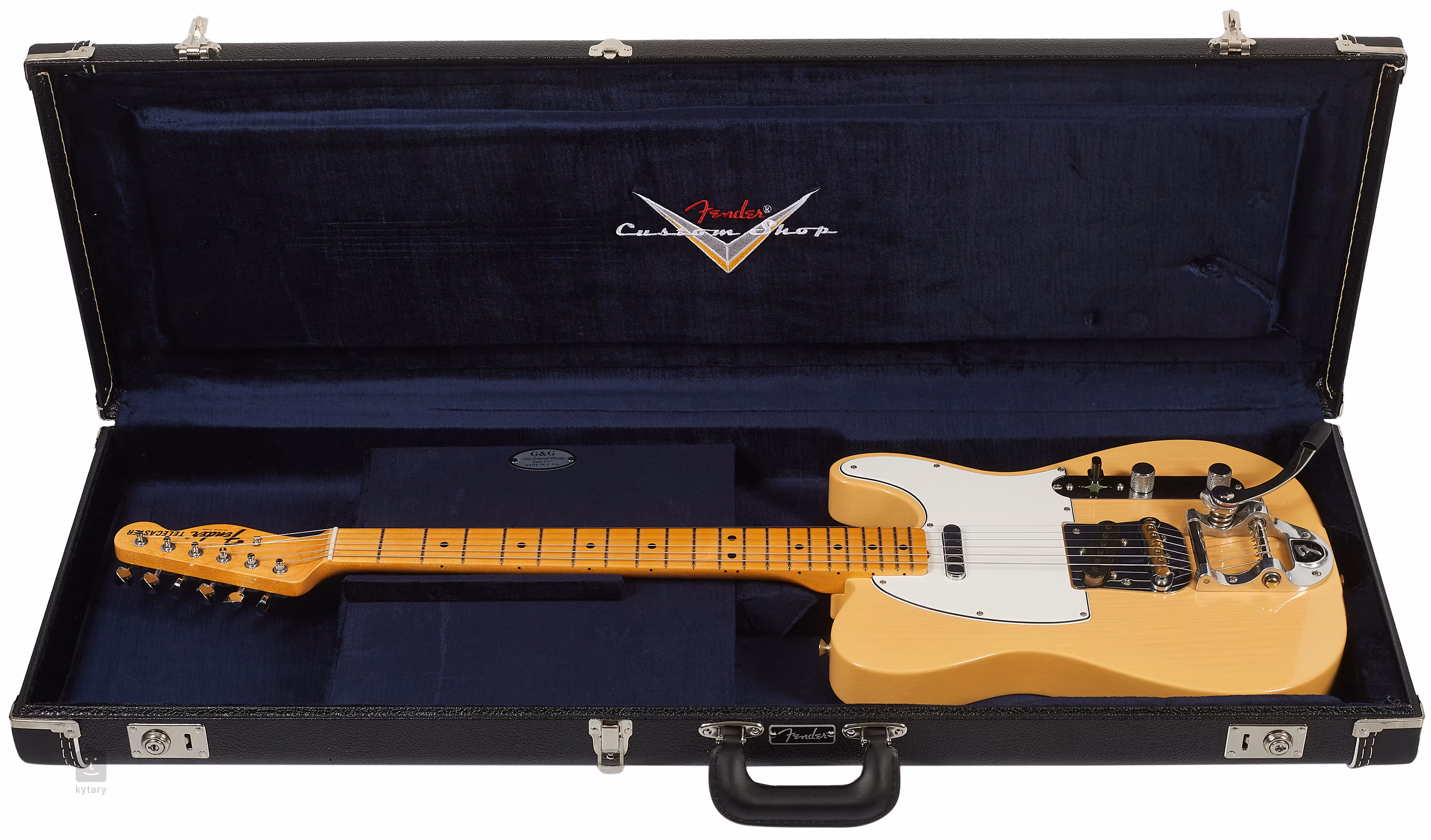 Zwei handgewickelte 67er Tele Single-Coil-Pickups aus dem Custom Shop verleihen der Gitarre den klassischen Telecaster-Twang und das entsprechende Spielgefühl. Mit den Standardreglern lässt sich der Klangcharakter einstellen. Die hochmoderne Greasebucket-Schaltung ermöglicht es, die Höhen wegzunehmen, ohne die Bassfrequenzen zu betonen. Die Saiten werden in Fender/Shaller Vintage F Style Mechaniken und RSD J-Bridge und Bigsby B5 Vibrato Tailpiece gehalten. Das stilvolle Finish wird durch ein dreilagiges Schlagbrett (Pergament) akzentuiert.