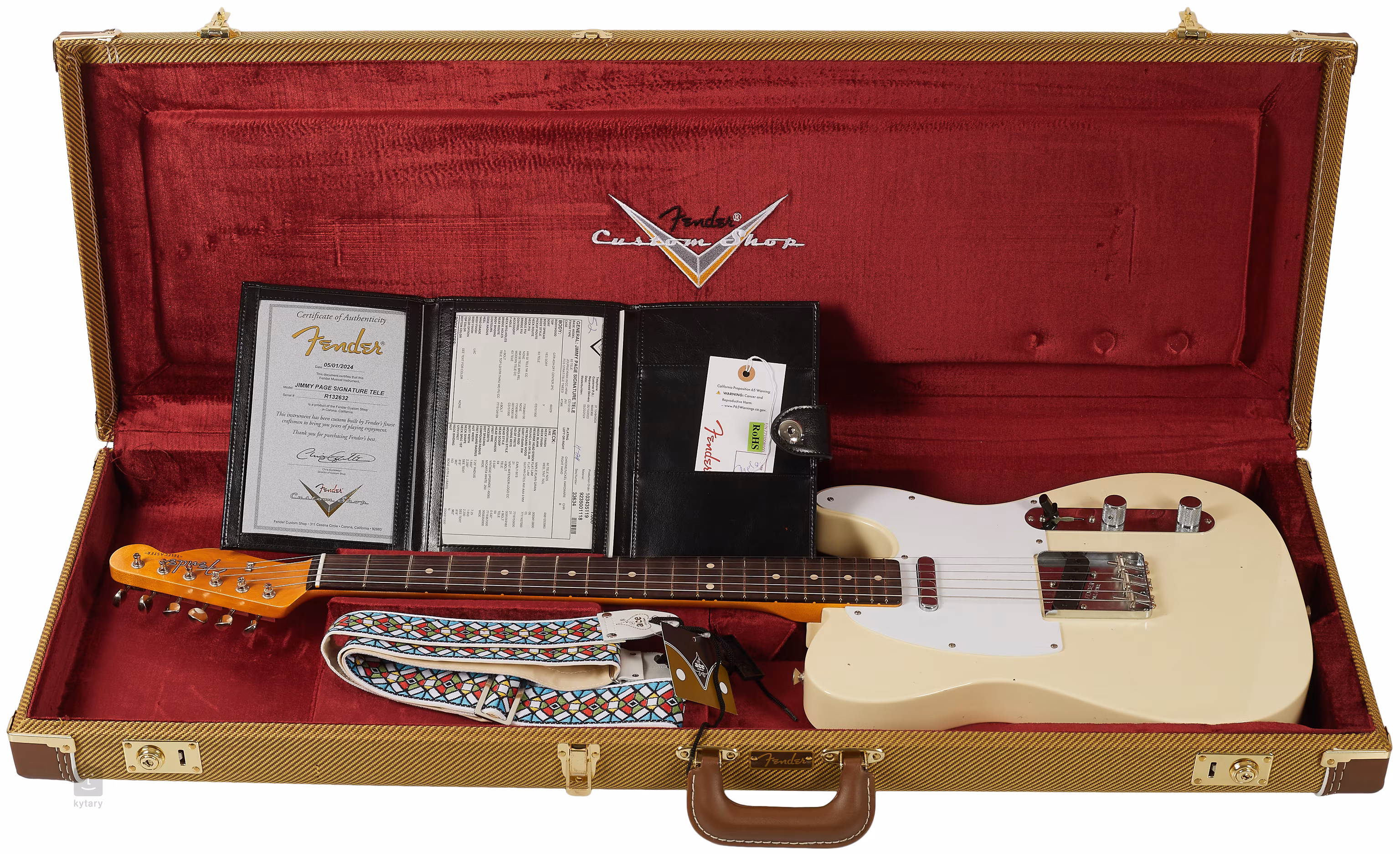 Die Gitarre wird in einem Koffer mit einem gewebten "Stained-Glass"-Gurt, runden Spiegeln (Spiegelanbringungsset), aufgewickeltem Instrumentenkabel und Echtheitszertifikat geliefert.
