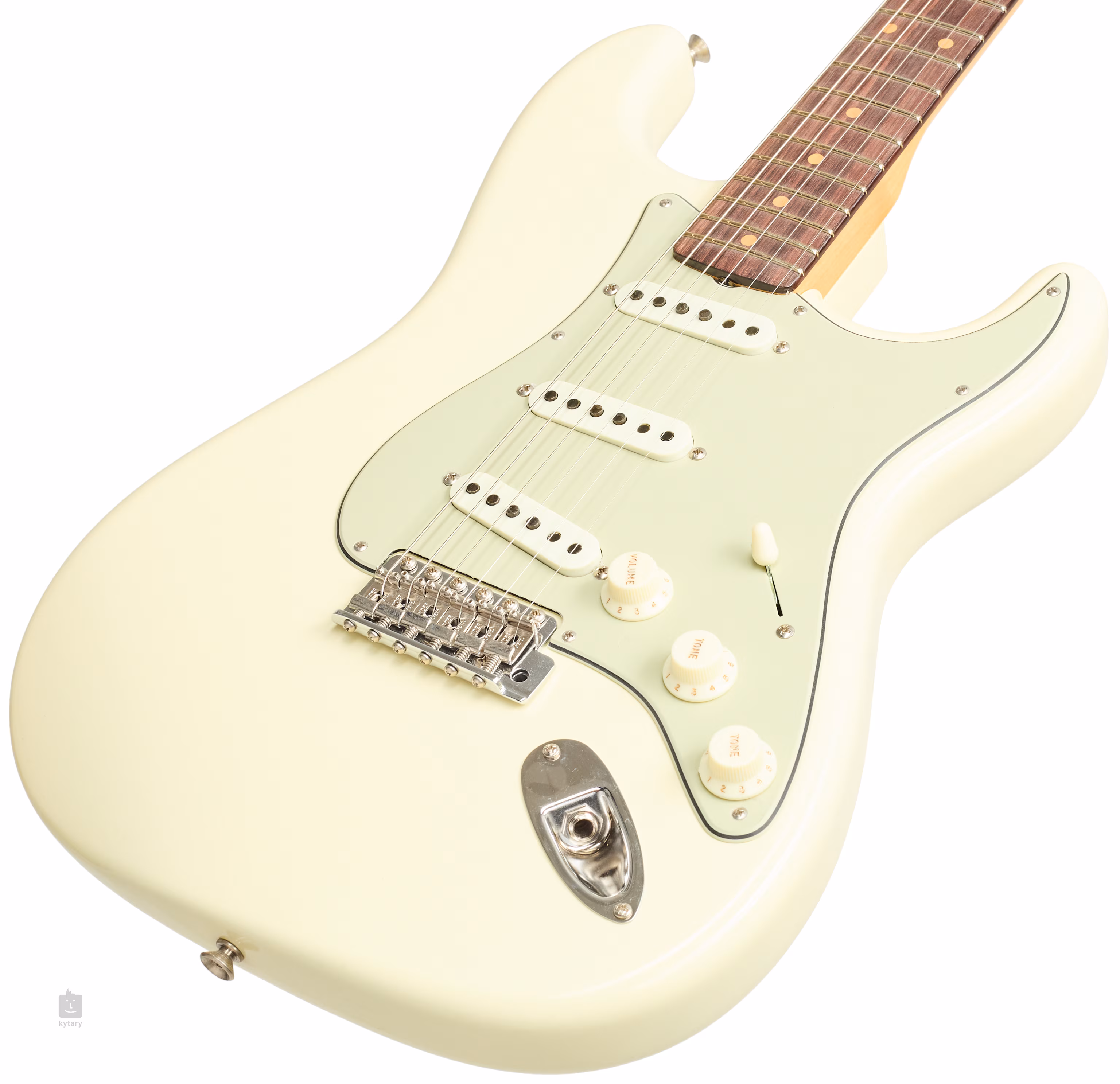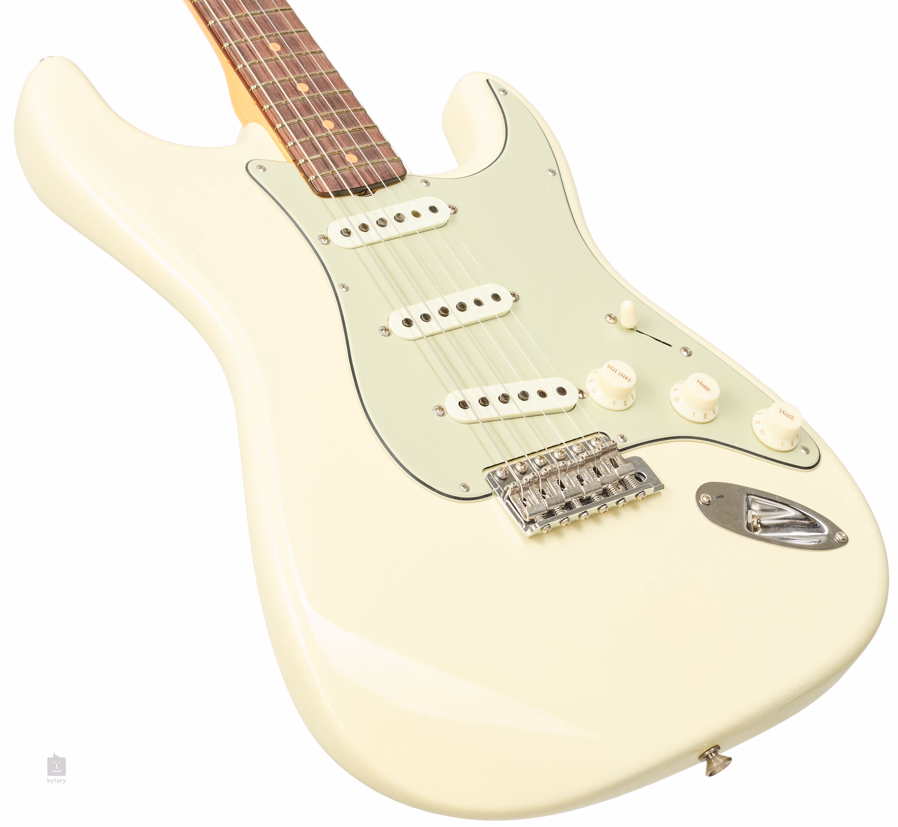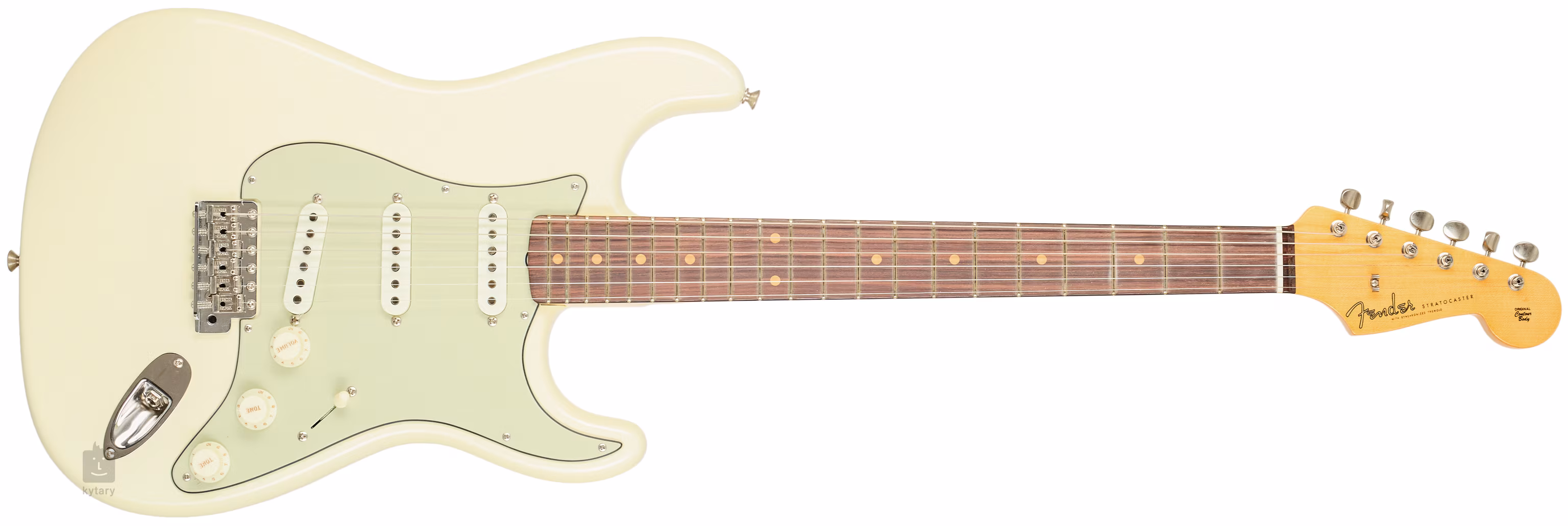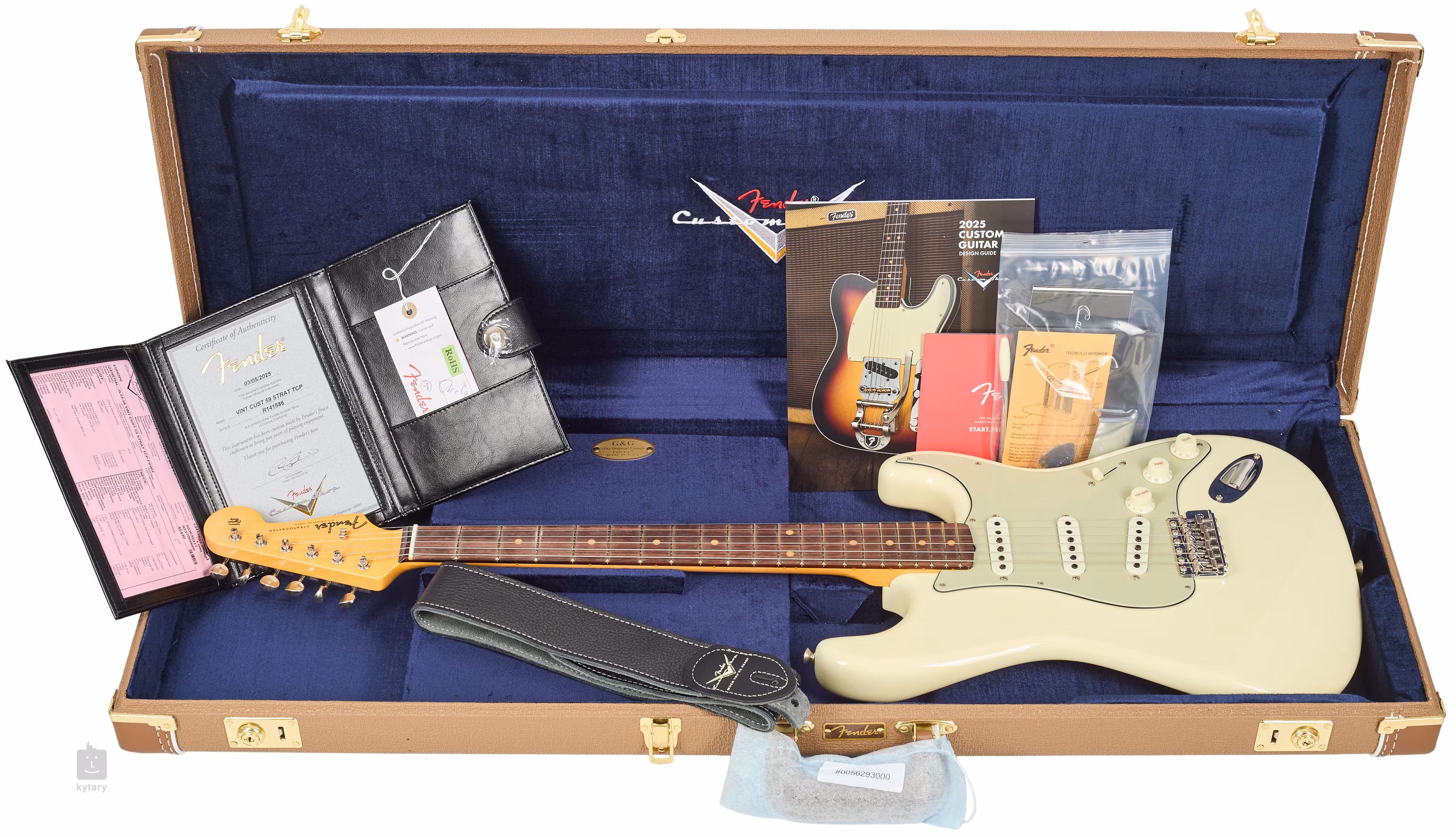 Auf den riftgesägten Ahornhals ist ein 9 mm dickes Palisander-Griffbrett in AAA-Qualität geleimt, das mit einundzwanzig Medium-Vintage-Bünden (47095) bestückt ist. Die Orientierung auf dem Griffbrett wird durch Positionspunkte mit der Bezeichnung "Vintage Clay" erleichtert. Drei handgewickelte 1959er Strat-Singlecoil-Pickups, Vintage-Treiber und -Elektronik aus den Jahren '59 und '60, ein synchronisiertes Strat-Tremolo, Vintage-Stimmmechaniken und ein Griffbrett aus Knochen unterstreichen die Authentizität des Instruments.