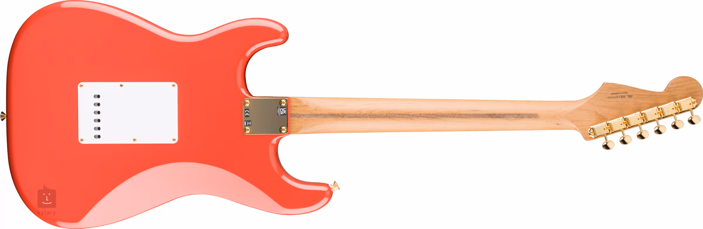 Der Erlenkorpus der Gitarre ist mit einem glänzenden Polyesterlack überzogen und in Fiesta Red lackiert. Hals und Griffbrett sind aus Ahorn gefertigt. Durch die Wärmebehandlung des Griffbretts (gerösteter Ahorn) wird die Holzstruktur verstärkt. Ein schmalerer Hals mit einem gefälligen Mid '50s Soft "V"-Profil, ein 7,25-Zoll-Griffbrettradius und einundzwanzig Vintage Tall-Bünde stellen die Gitarre eindeutig in die Reihe der "Vintage"-Instrumente ohne moderne Schnitzer und Modifikationen.
