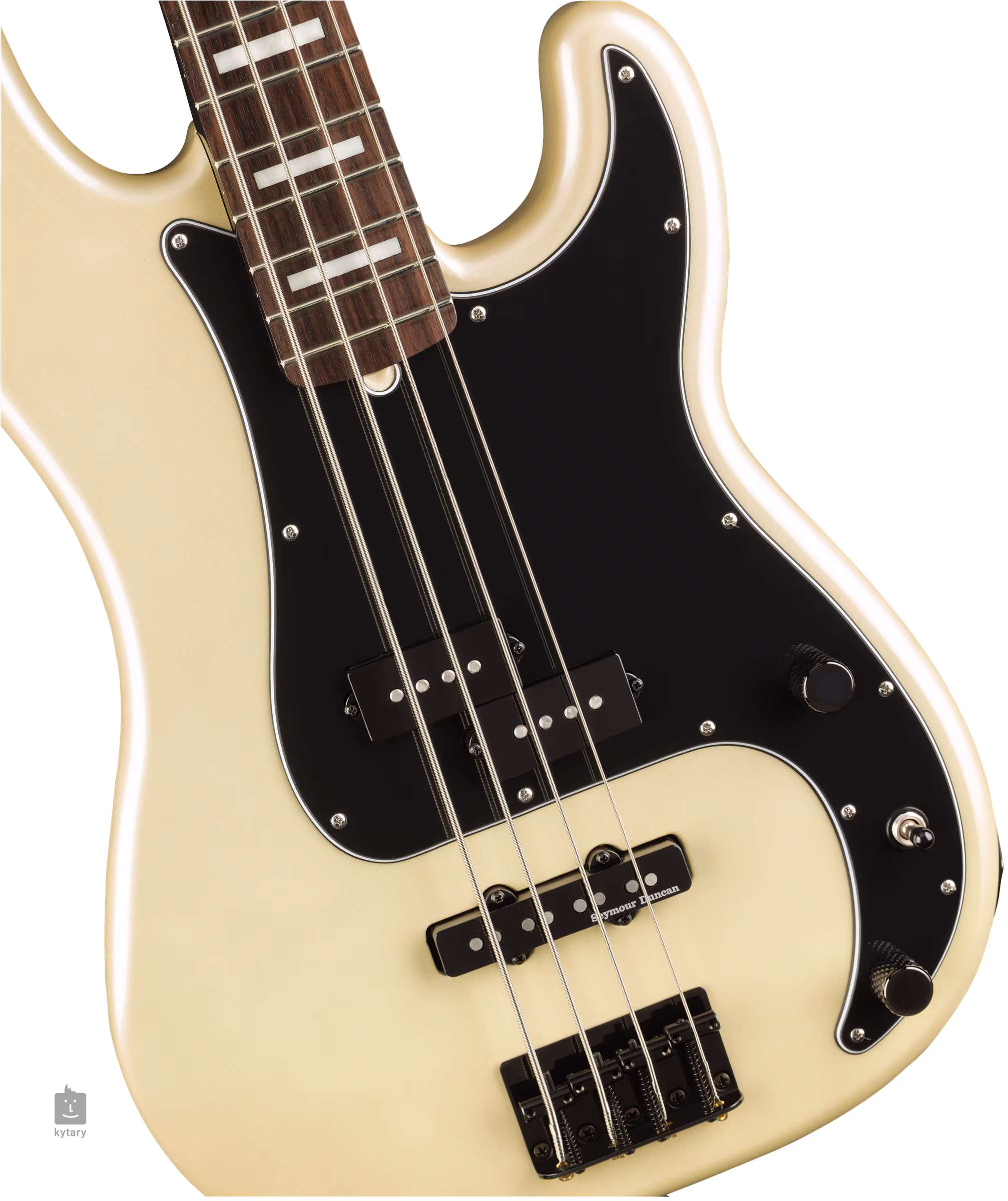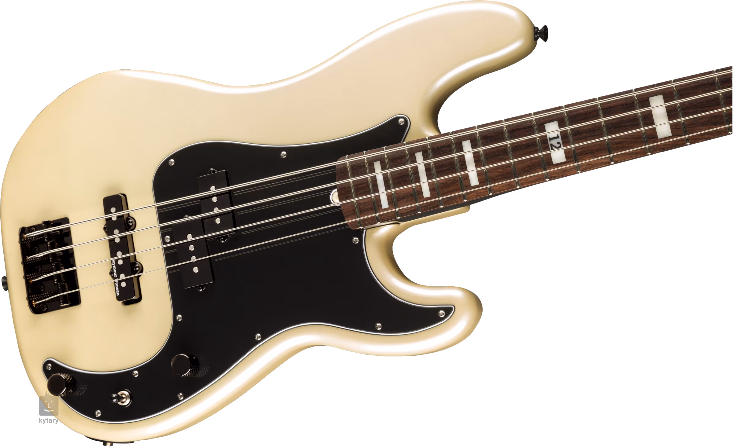 Die klassische Precision-Bass-Korpusform ist aus Erle gefertigt, was den Sound auch in höheren Lagen warm und klar macht. Unter den Saiten befindet sich ein schwarzes Schlagbrett. Der Hals ist aus Ahorn gefertigt, die Mensur misst 864 mm und das Halsprofil ist in moderner C-Form. Das Palisander-Griffbrett hat zwanzig Medium-Jumbo-Bünde, die mit Perlmuttblöcken eingefasst sind, und der Radius beträgt 9,5 Zoll. Der Nullbund ist aus synthetischem Knochen und hat eine Breite von 41,3 mm.