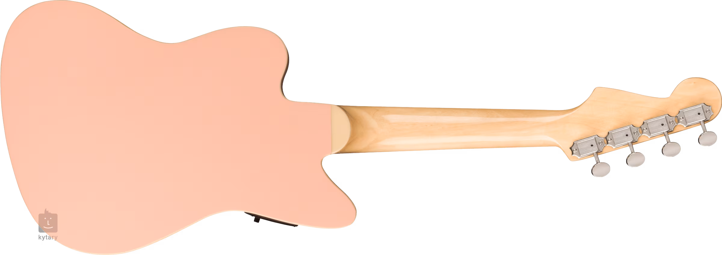 Der Korpus der Fullerton Jazzmaster Uke Shell Pink Ukulele selbst besteht aus laminierter Fichte vorne und Okoumé Boden und Zargen. Auf den Ahornhals ist ein Walnuss-Griffbrett geleimt, das mit neunzehn Bünden und weißen Positionspunkten zur einfachen Orientierung ausgestattet ist. Die Saiten sind über ein Faux-Bone-Griffbrett in den bereits erwähnten Nickel-4-in-Line-Mechaniken im unverwechselbaren Fender-Design und einem Walnuss-Griffbrett verankert.
