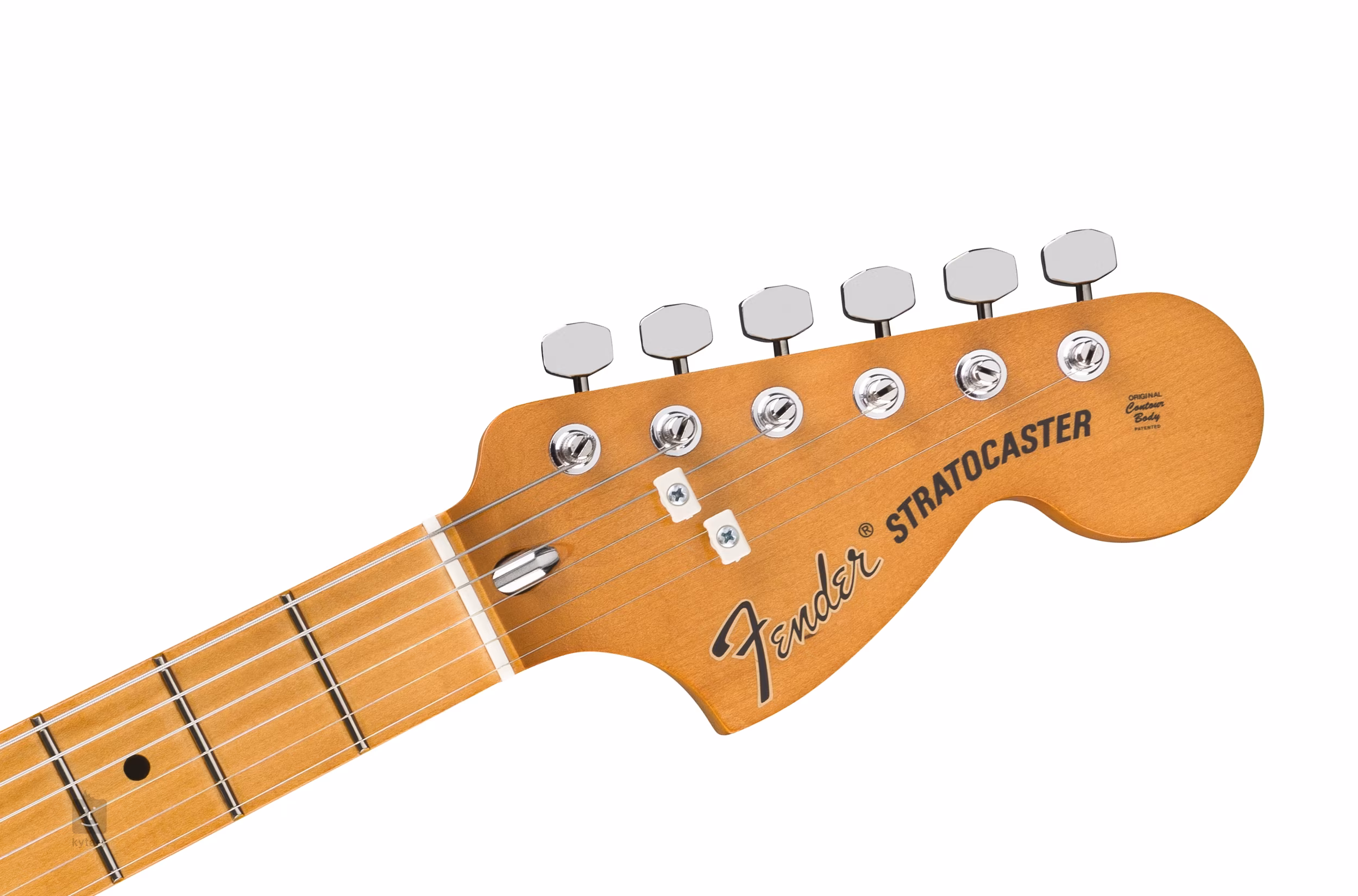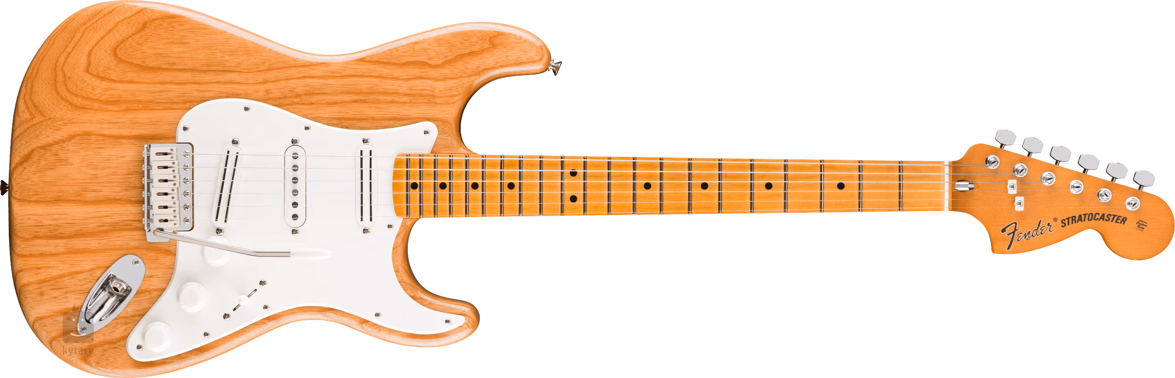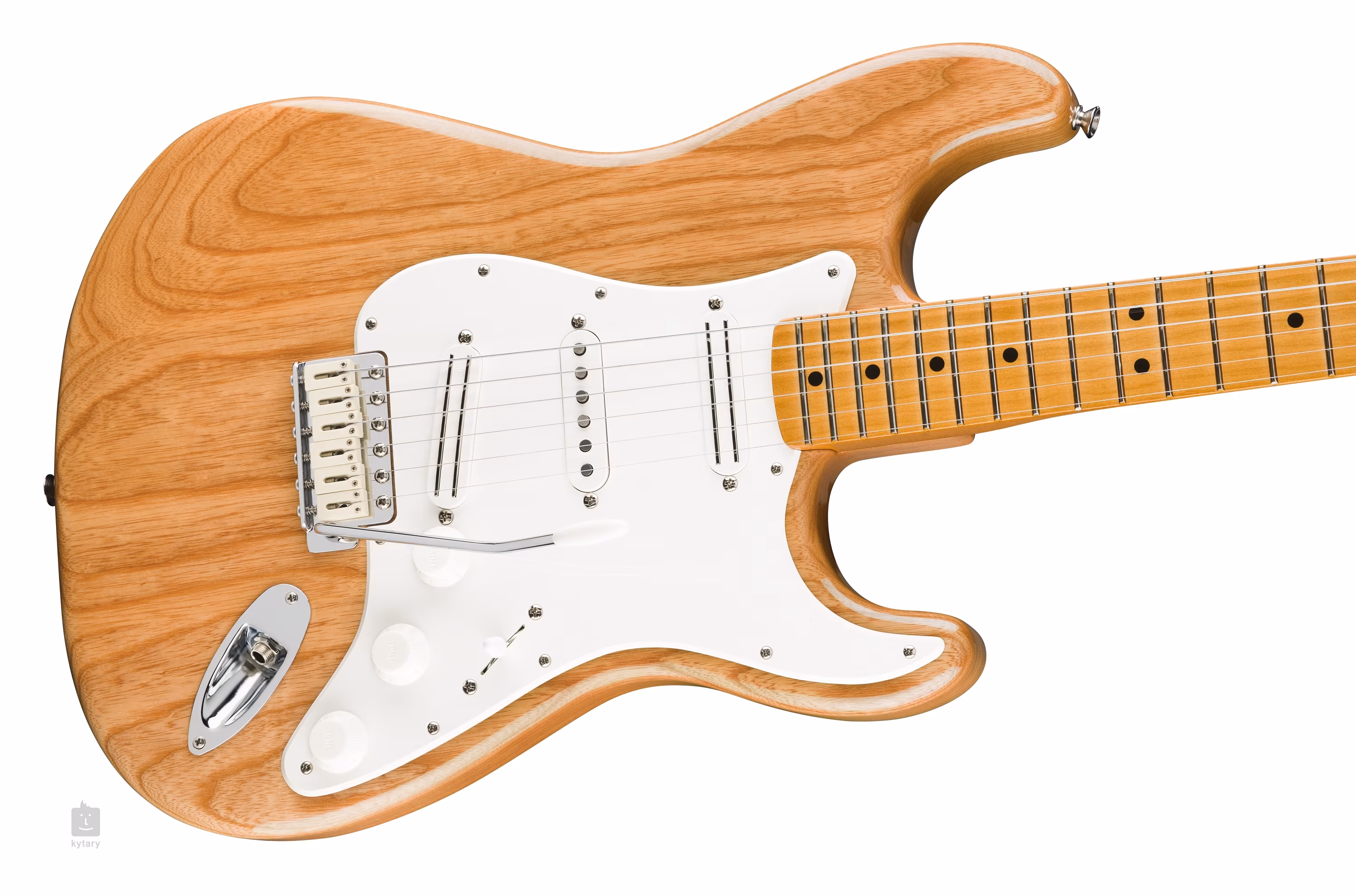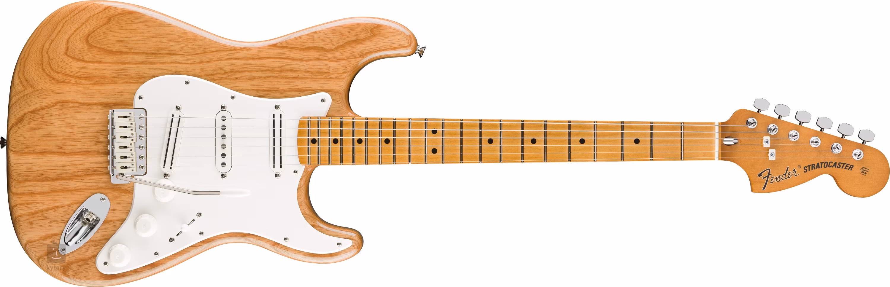Der Korpus dieser 70er Stratocaster ist aus Esche gefertigt. Die Maserung des Holzes wird durch eine glänzende Polyesterlackierung akzentuiert. Der Ahornhals mit C-Profil, 7,25-Zoll-Griffbrettradius und einundzwanzig Jumbo-Bünde bieten eine angenehme Spielbarkeit.