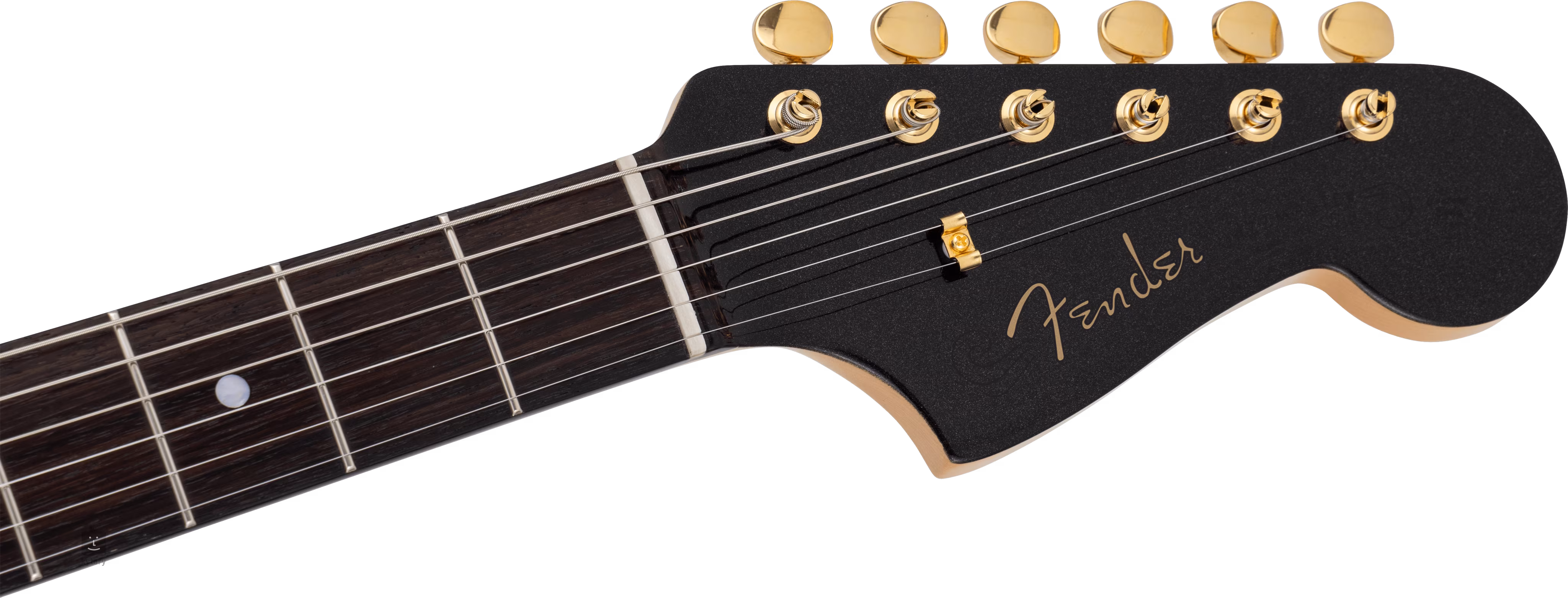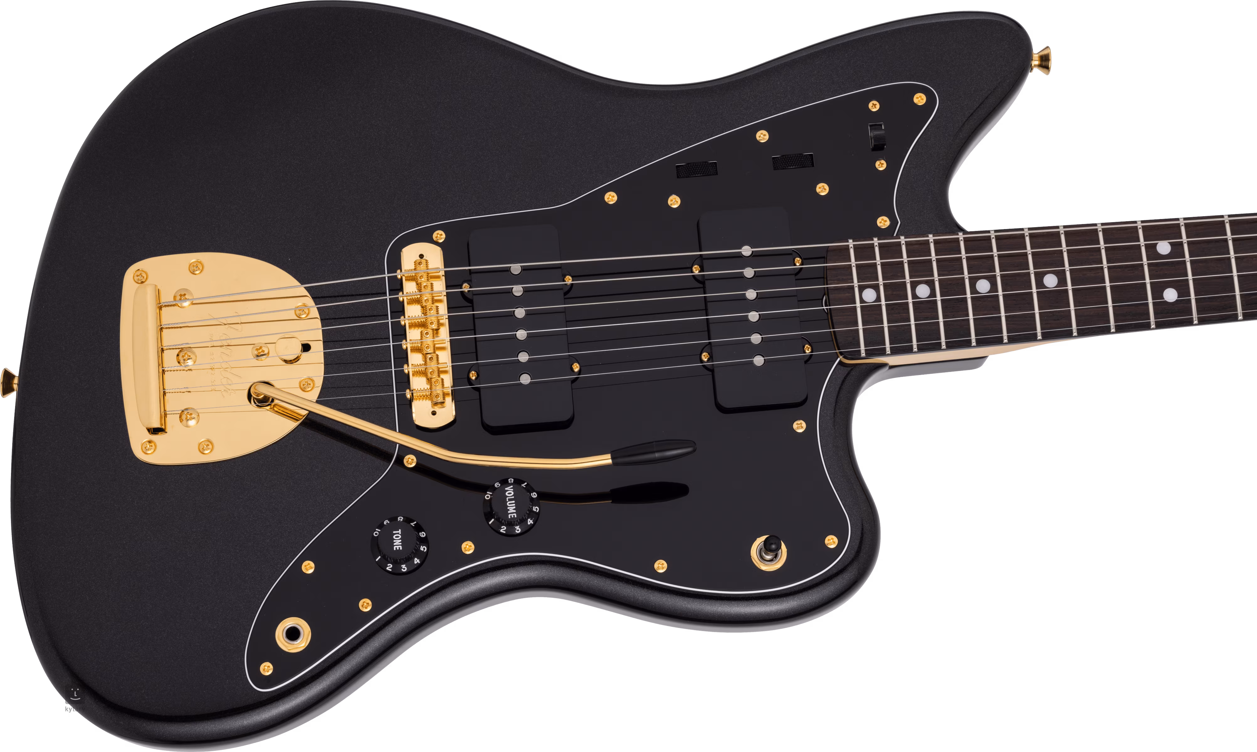 Das Wort Jazzmaster im Namen deutet auf die ursprüngliche Intention hin, aber dieses Instrument mit seiner typischen Offset-Korpusform wird nicht wirklich mit Jazz in Verbindung gebracht - es hat unter Musikern aus der alternativen Musikszene (von Surf-Rock bis Indie-Rock) an Popularität gewonnen. Der Lindenkorpus des Instruments ist mit einem glänzenden Polyesterlack und Black Pearl Finish verziert. Der Ahornhals mit U-Profil ist auf ein Palisandergriffbrett mit einundzwanzig Bünden in Vintage-Größe geleimt. Die Orientierung auf dem Griffbrett wird durch Positionspunkte aus Perlmutt erleichtert.