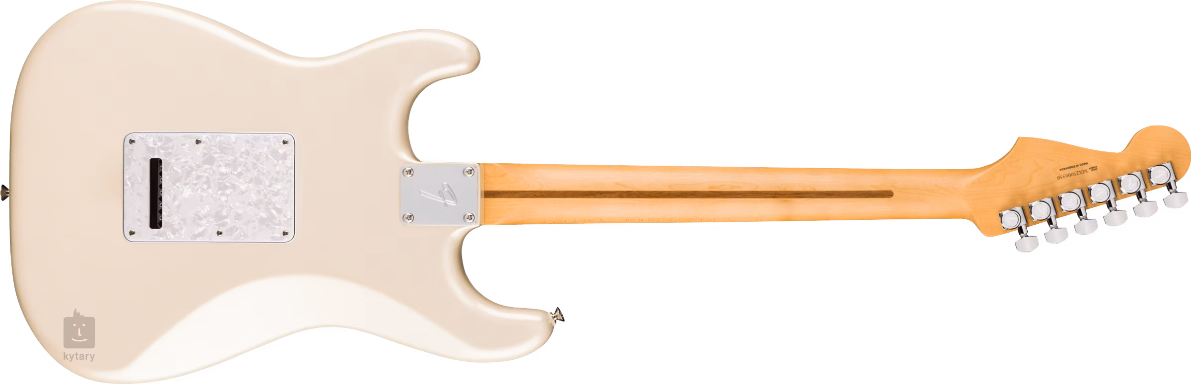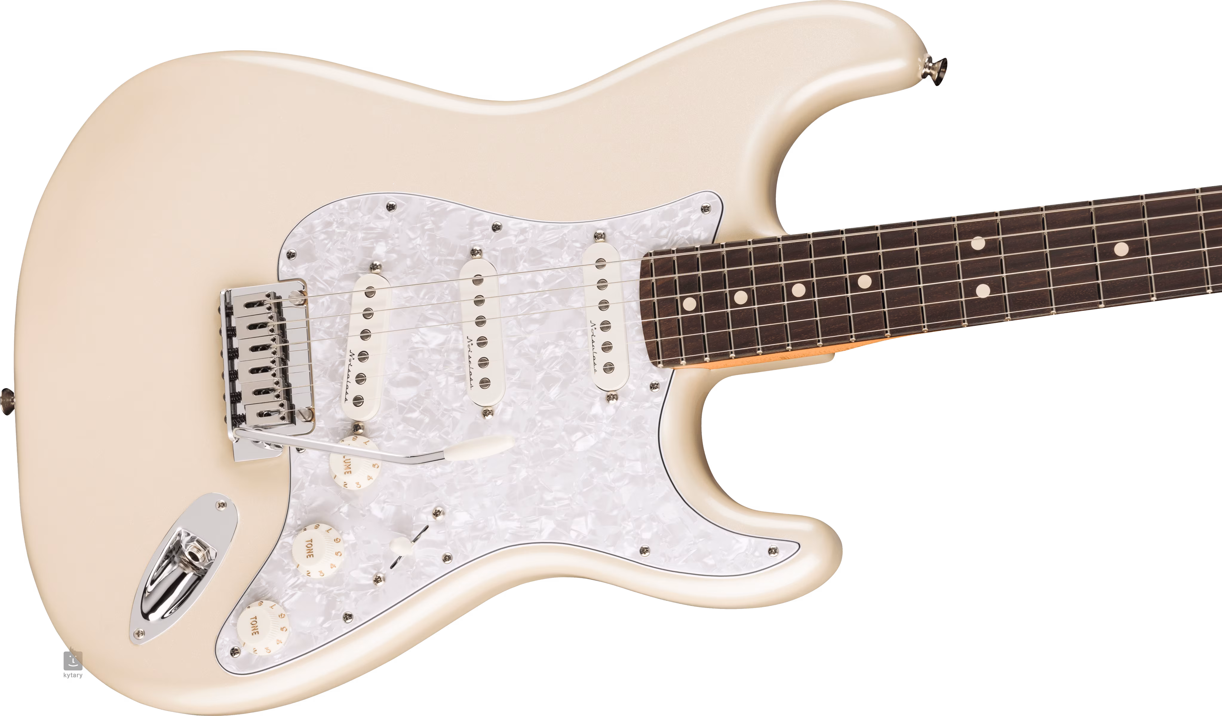 Ein weiteres neues Merkmal der Serie ist die Verwendung von Fender Sealed Locking Mechaniken und einem TusQ-Griffbrett (die Standard-Serie hat ein Faux Bone-Griffbrett). Die Saiten sind in einem synchronisierten 2-Punkt-Tremolo mit Blockstahlsätteln und einem abgeschrägten Tremoloblock verankert. Der stilvolle Look der Gitarre wird durch ein vierlagiges Schlagbrett aus Perlmuttimitat und eine Olympic Pearl-Lackierung unterstrichen.