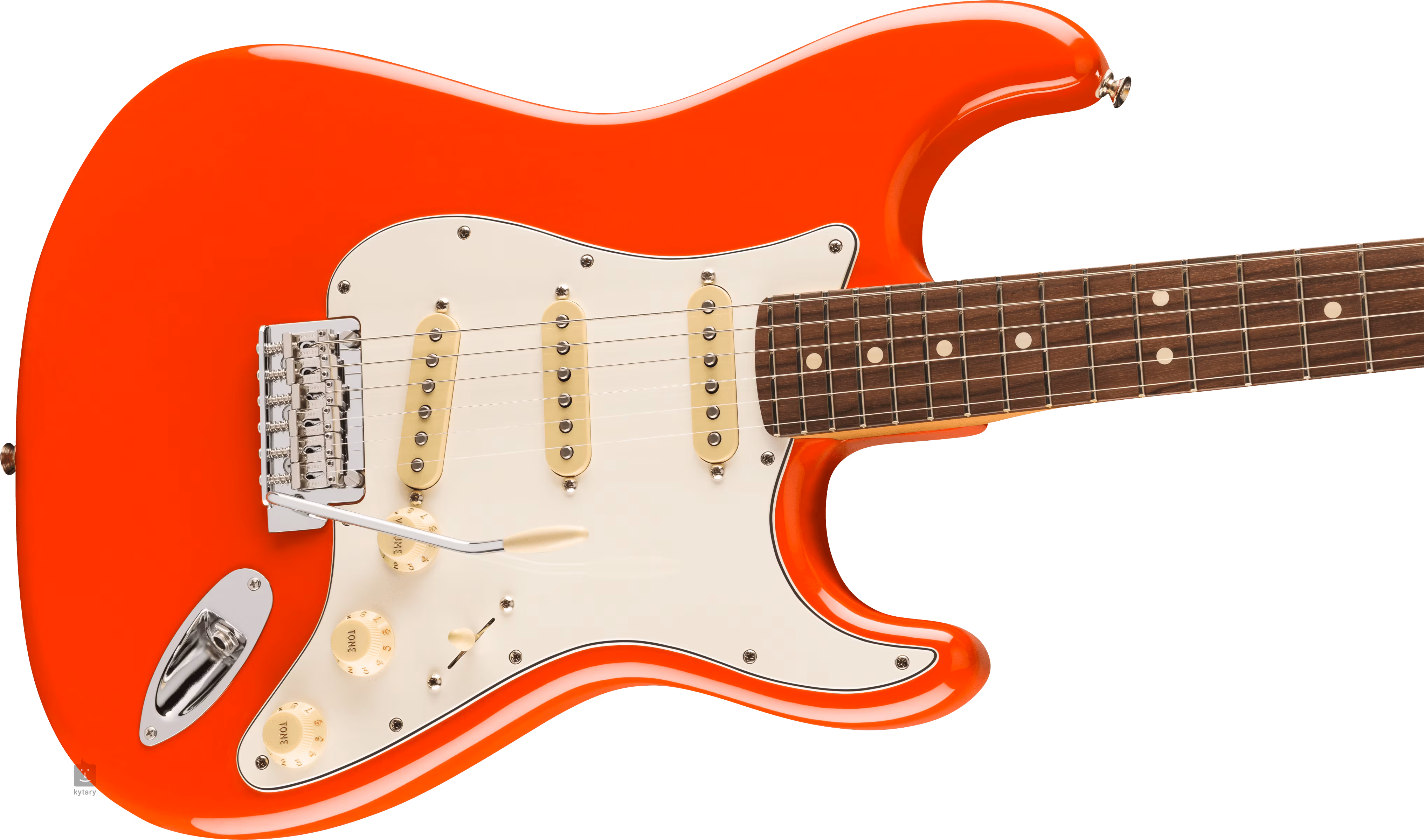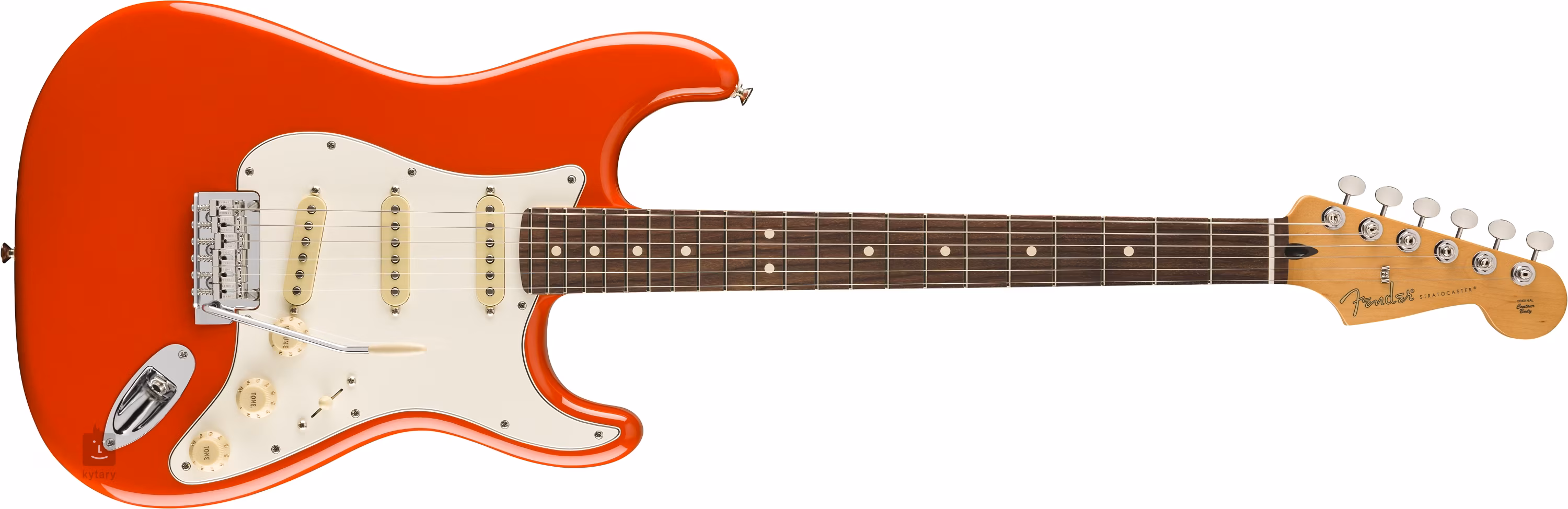 Drei Single-Coil-Tonabnehmer der Player-Serie mit Alnico-5-Magneten verleihen der Gitarre ein moderneres Fender-Gefühl und einen Sound, den Sie in einer Vielzahl von Musikstilen schätzen werden. Der Klangcharakter kann mit den Lautstärke- und Tonreglern und dem fünfstufigen Pickup-Schalter beeinflusst werden. Die Saiten sind in ClassicGear-Mechaniken mit einem Übersetzungsverhältnis von 18:1 und einem synchronisierten "2-Punkt"-Tremolo mit Stahlsätteln montiert. Der stilvolle Look der Gitarre wird durch ein helles 3-lagiges Schlagbrett und eine korallenrote Lackierung unterstrichen.