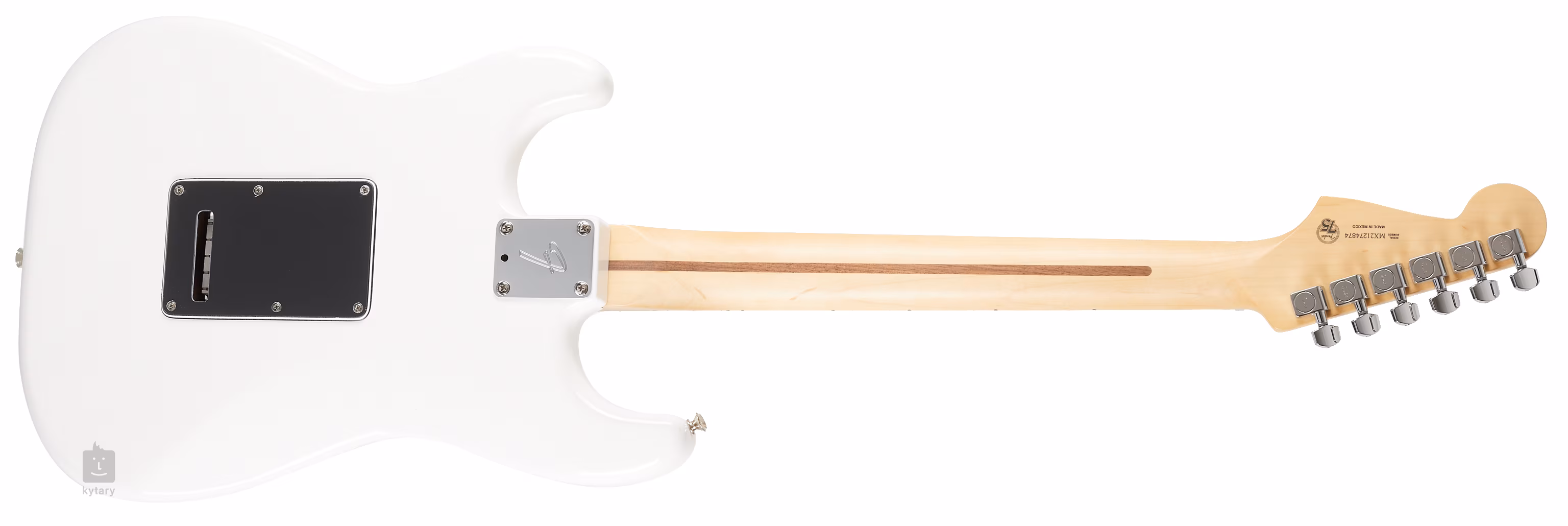 Der Erlenkorpus dieser Stratocaster ist mit einem glänzenden Polyesterlack überzogen. Zweiundzwanzig Medium-Jumbo-Bünde und Positionsmarker unterteilen das Ahorn-Griffbrett.