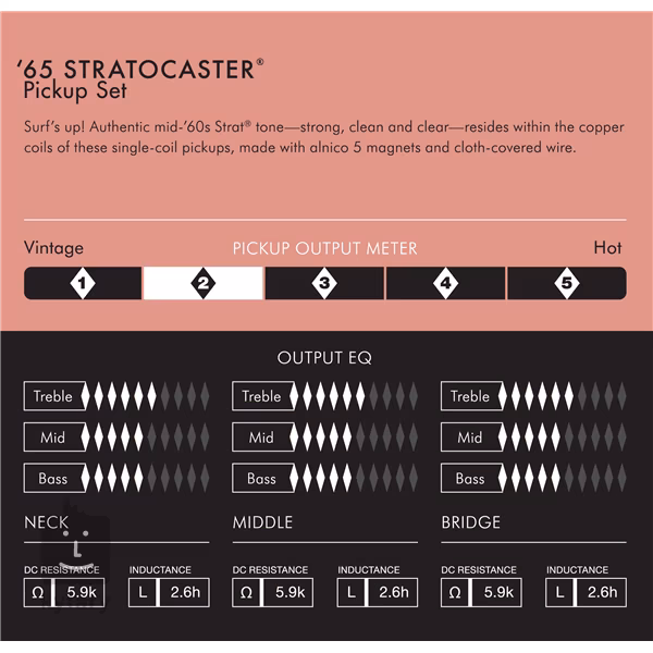 Diese Fender-Tonabnehmer sind in Fender American Vintage '65 Stratocasters zu finden. Sie haben den klassischen Vintage-Sound der Stratocaster-Modelle und bieten den richtigen Surf-Rock-Drive.