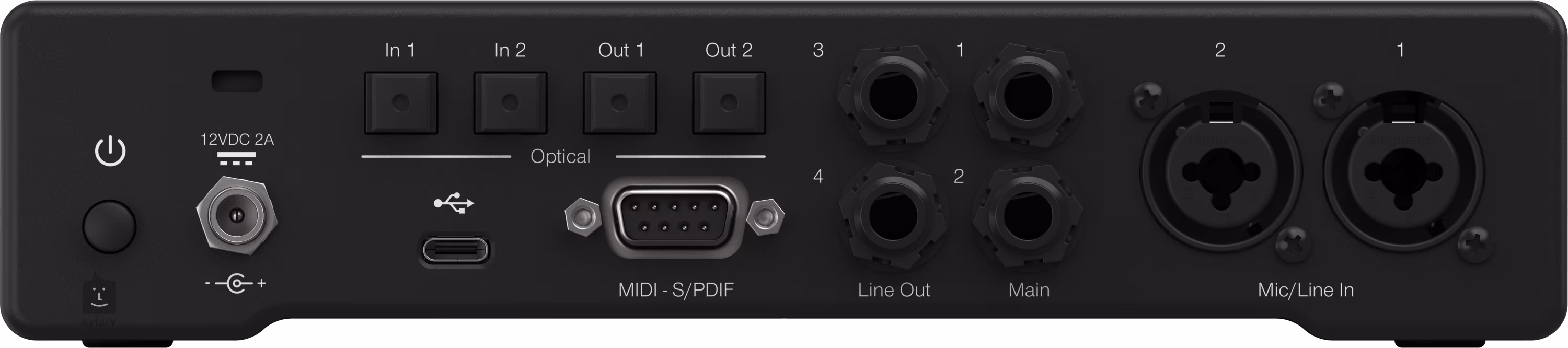 Die 20 × 24 I/O-Konfiguration bietet ausreichend Platz für das Wachstum des Studios und ermöglicht die gleichzeitige Arbeit mit mehreren Signalquellen. Das Interface verfügt über erweiterte digitale Ein- und Ausgänge, darunter 16 ADAT-Kanäle und S/PDIF-I/O, was die Anbindung an externe Wandler und weitere Studiotechnik erleichtert. Die für Gitarre und Bass optimierten Instrumenteneingänge auf der Vorderseite garantieren einen klaren, transparenten Klang, ohne dass externe DI-Boxen erforderlich sind.
