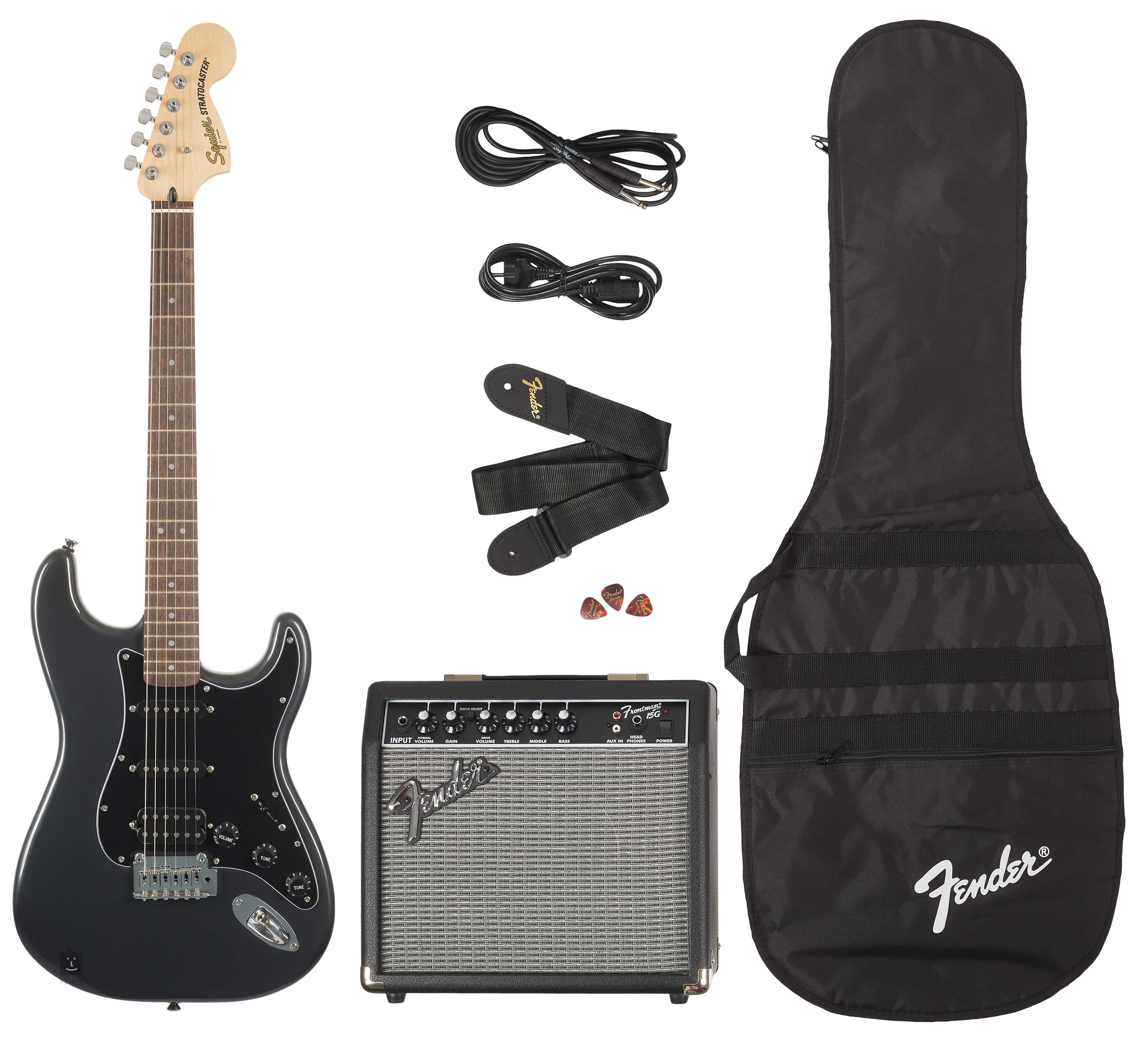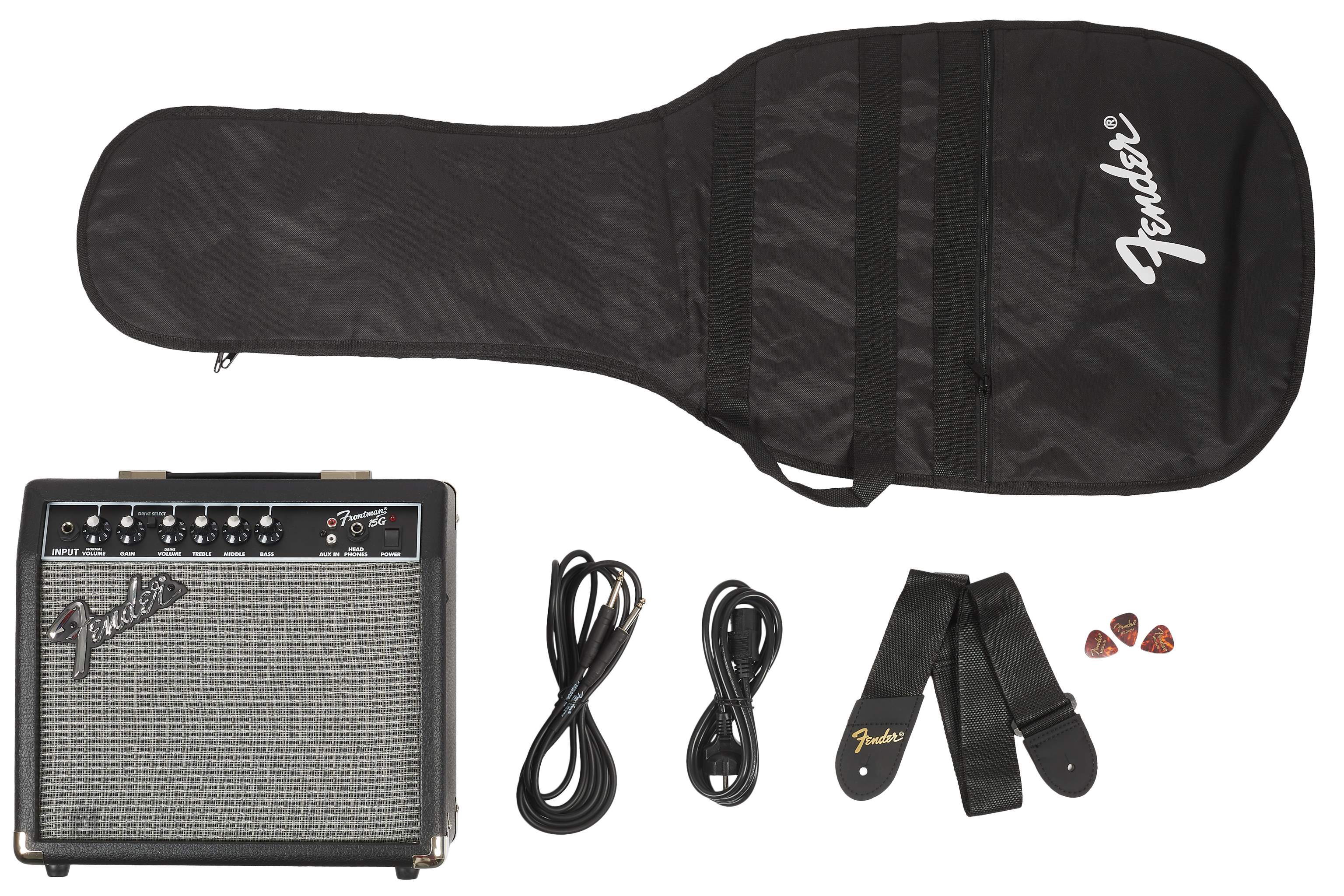Im Set enthalten sind ein Fender Frontman 15G Transistor-Gitarrencombo mit 15 Watt Leistung, zwei Kanälen (Clean und Overdrive), Dreiband-EQ, Kopfhörerausgang und Aux-In-Eingang zum Anschluss externer Multimediageräte, ein gepolsterter Gitarrenkoffer (Gigbag), Gitarrenplektren, Gitarrengurt, ein etwa drei Meter langes Instrumentenkabel (der Hersteller gibt zehn Fuß an) und drei Monate lang Zugang zu Online-Gitarrenunterricht auf Fender Play.