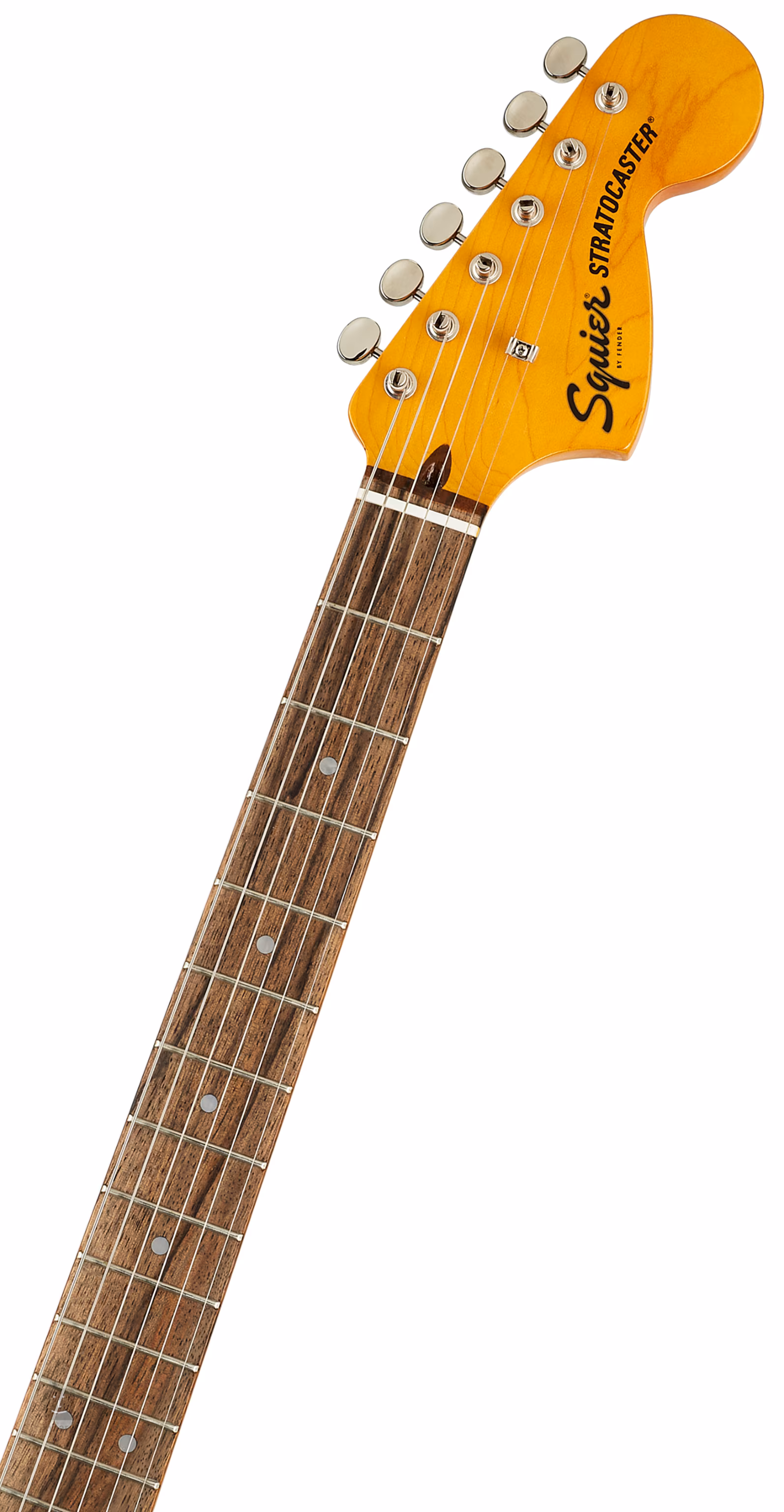 Drei proprietäre Single-Coil-Tonabnehmer mit Alnico-Magneten verleihen der Gitarre einen Sound mit authentischem Fender-Charakter. Anpassungen und Einstellungen können mit dem Lautstärkepotentiometer, zwei Klangreglern und einem fünfstufigen Tonabnehmerschalter vorgenommen werden. Die Saiten sind in ein Single-Turn-Tremolo im Vintage-Stil eingespannt und die Mechaniken haben ebenfalls ein zeitgemäßes Design. Die Optik des Instruments wird durch Nickel-Hardware, ein vierlagiges Schlagbrett und ein Firmenlogo auf der Kopfplatte im passenden 70er-Jahre-Design passend ergänzt.