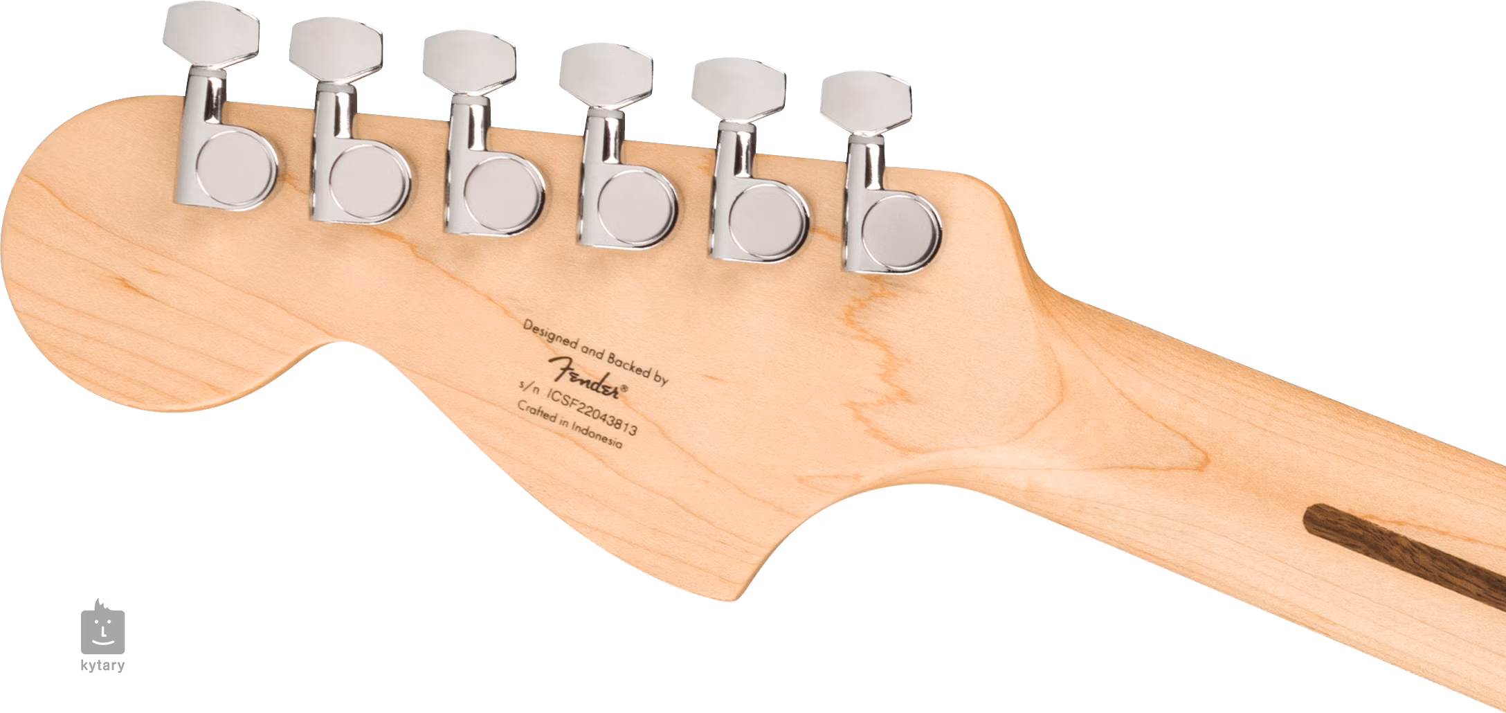 Zwei proprietäre Singlecoil-Tonabnehmer mit Keramikmagneten verleihen der Gitarre einen klaren, klingenden Sound, der in einer Vielzahl von Musikstilen nicht verloren geht. Die Konturen der Gitarre lassen sich mit den Lautstärkepotentiometern, der Tonblende und dem dreistufigen Tonabnehmerschalter einstellen. Die Saiten werden durch die Druckguss-Stimmmechaniken des Unternehmens und einen 6-Saddle Top-Load Hardtail verankert. Das stilvolle Finish wird durch verchromte Hardware, ein weißes einlagiges Schlagbrett und das Firmenlogo auf der Kopfplatte akzentuiert.