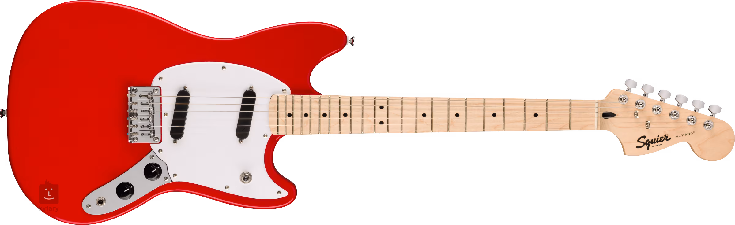 Die Fender Squier SONIC MUSTANG MN WPG TOR ist eine erschwingliche E-Gitarre, die für Anfänger geeignet ist. Der Pappelkorpus des Instruments ist mit einem glänzenden Polyurethan-Lack überzogen. Der Hals mit "C"-Profil und das Griffbrett sind aus Ahorn gefertigt, die Oberfläche des Griffbretts ist durch einundzwanzig Narrow Tall-Bünde und schwarze Positionspunkte unterteilt. Dank der kürzeren Mensur (610 mm) eignet sich die Mustang auch für Musiker, die mit Standard-Gitarren (Strat, Tele, Jazzmaster) nur schwer mithalten können.