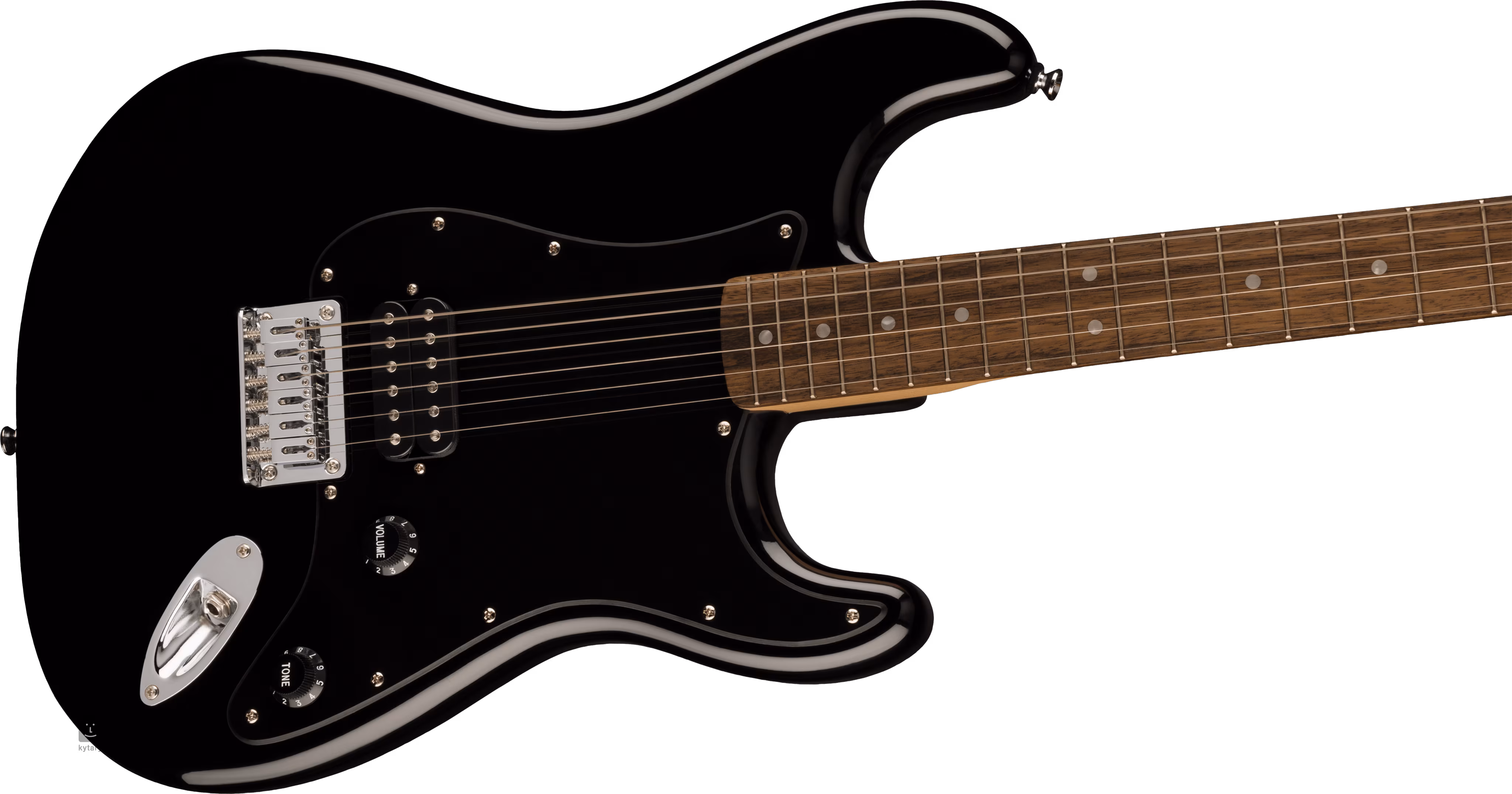 Ein konisch zulaufender Keramik-Humbucker verleiht der Gitarre einen vollen, saftigen Sound, der in der Rockmusik und einer Vielzahl anderer Stile zu Hause sein wird. Sein Charakter lässt sich mit den Potentiometern für Lautstärke und Tonblende einstellen. Die Saiten werden von den Druckguss-Stimmmechaniken des Unternehmens und einem 6-Saddle Top-Load Hardtail verankert. Das stilvolle Strat-Design wird durch verchromte Hardware, ein schwarzes einlagiges Schlagbrett und das Firmenlogo auf der Kopfplatte akzentuiert.