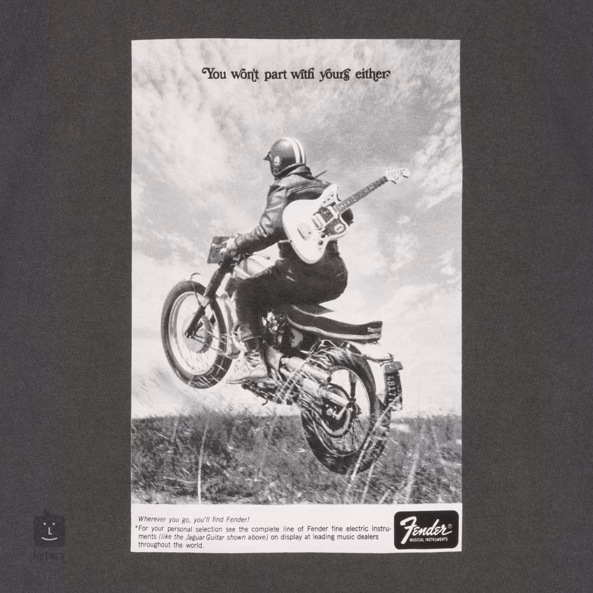 Cotton Vintage Ad Biker Tee Graphite mit dem Motiv der Werbekampagne aus den 1960er Jahren "You won't part with yours either", die Musiker mit Fender-Gitarren in den unwahrscheinlichsten Situationen des Lebens zeigt. Das T-Shirt ist in verschiedenen Größen erhältlich.