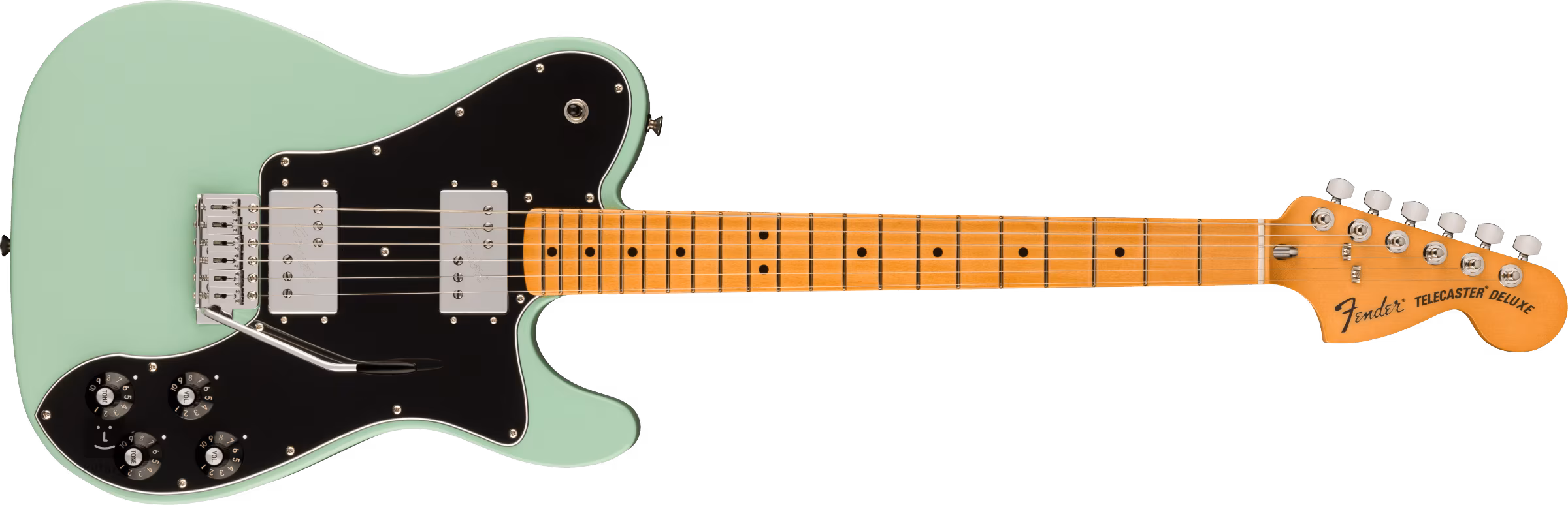 Zwei 70er-Jahre-Wide-Range-Humbucker im Vintage-Stil verleihen der Gitarre einen vollen, warmen Ton mit deutlich erkennbarer Fender-DNA. Der Klangcharakter lässt sich mit zwei Lautstärke- und Tonreglern (separat für jeden Tonabnehmer) und einem dreistufigen Tonabnehmerschalter einstellen. Die Saiten werden über ein Griffbrett aus synthetischem Knochen und ein synchronisiertes Tremolo mit sechs Sätteln und Sechs-Punkt-Verankerung in den hauseigenen Stimmmechaniken (Pure Vintage Tele Deluxe) gehalten. Das stilvolle Finish wird durch ein dreilagiges schwarzes Schlagbrett und das Fender-Logo auf der traditionell großen 70er-Jahre-Kopfplatte der Gitarre akzentuiert.